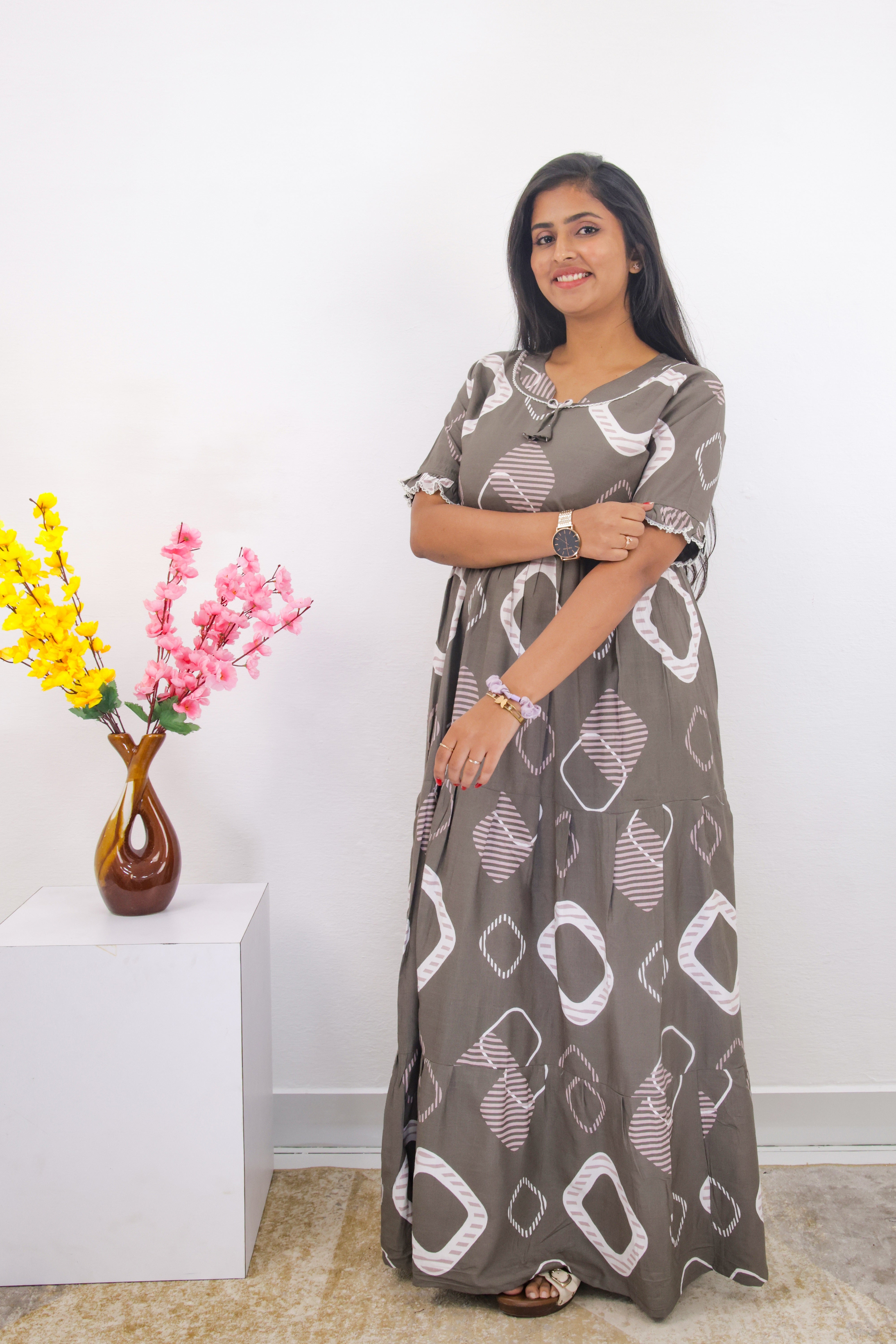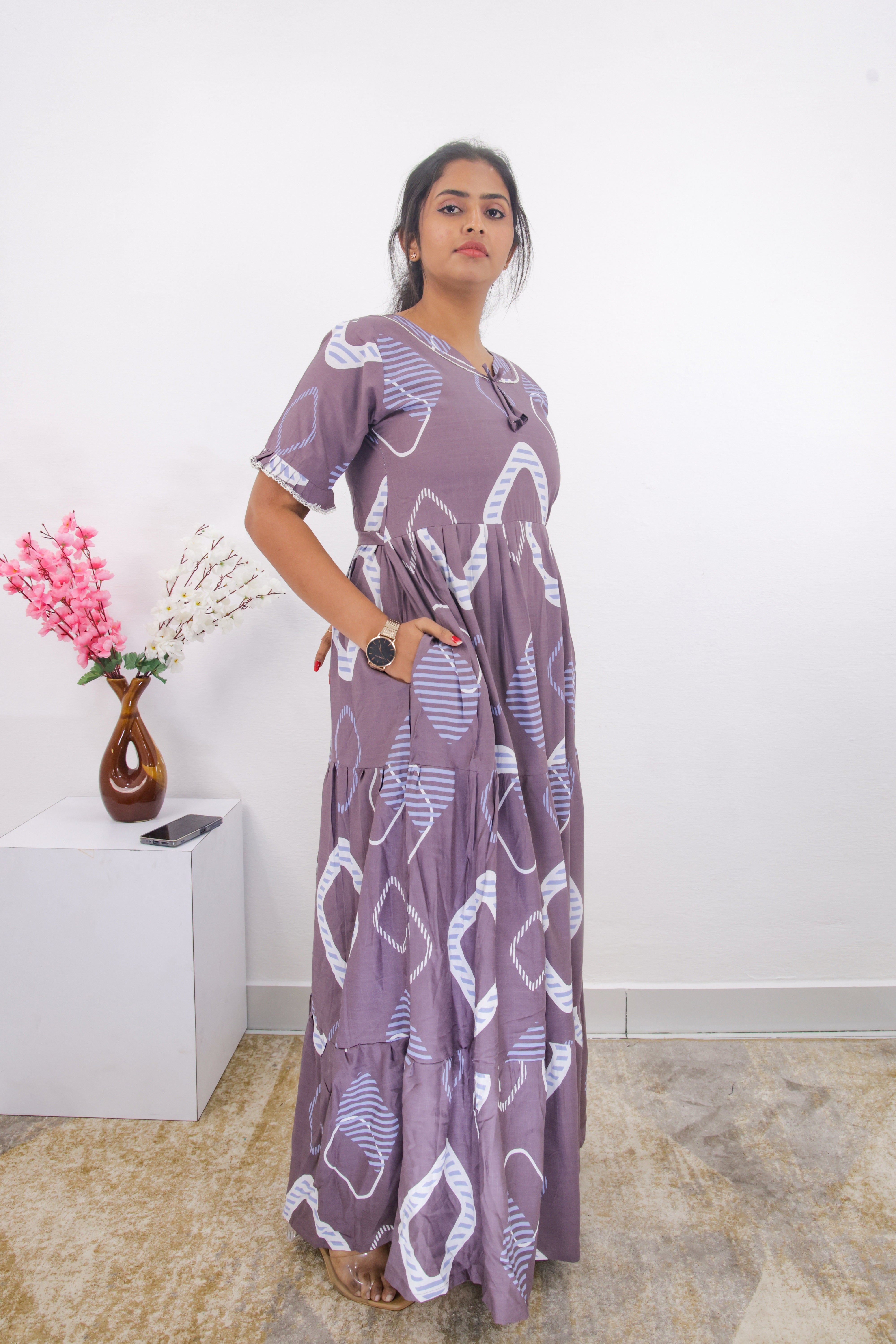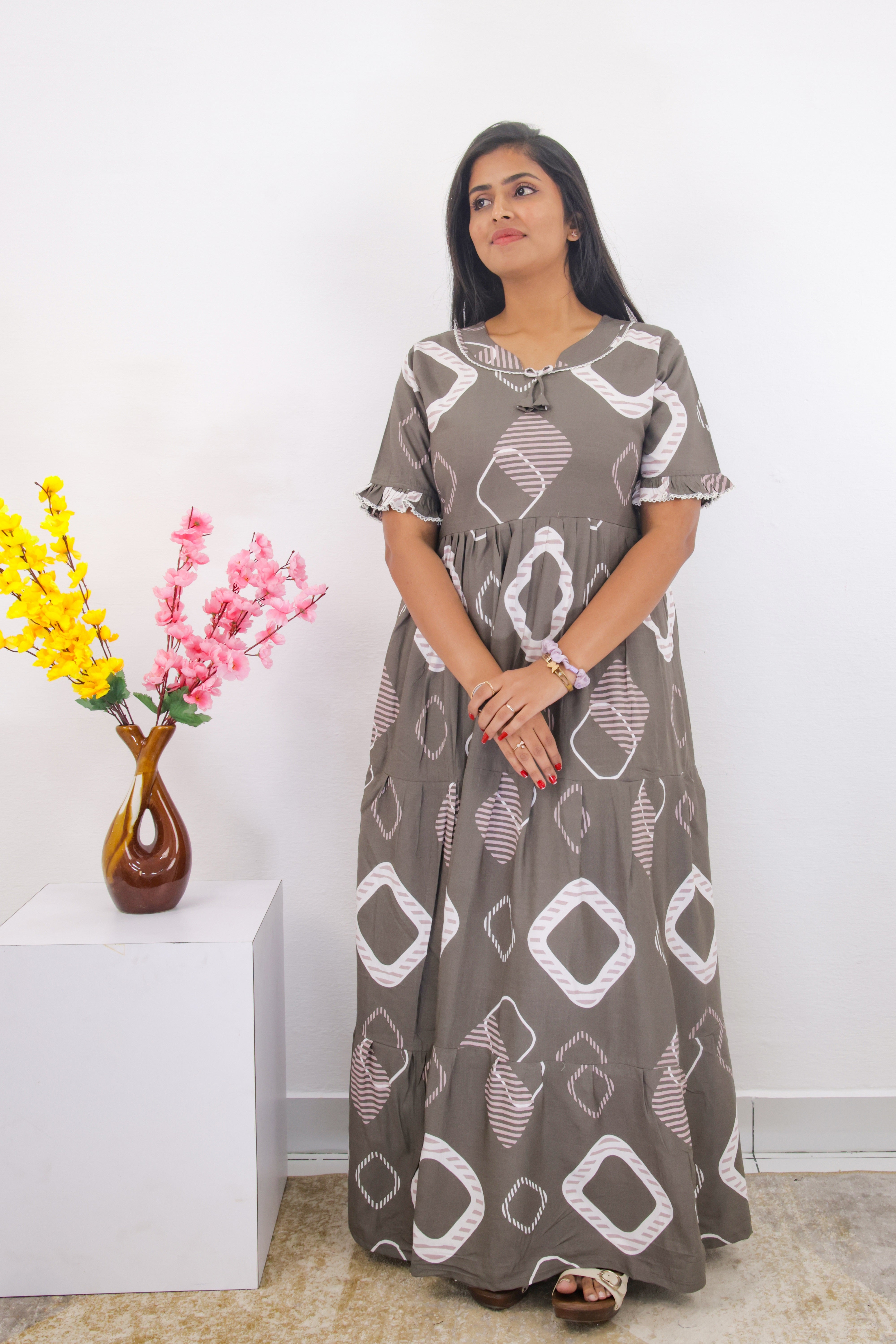 Essentially, this nighty combines a fashionable, multi-layered design with the comfort of soft rayon and practical features like a pocket. It seems like a good choice for someone looking for sleepwear that is both stylish and comfortable