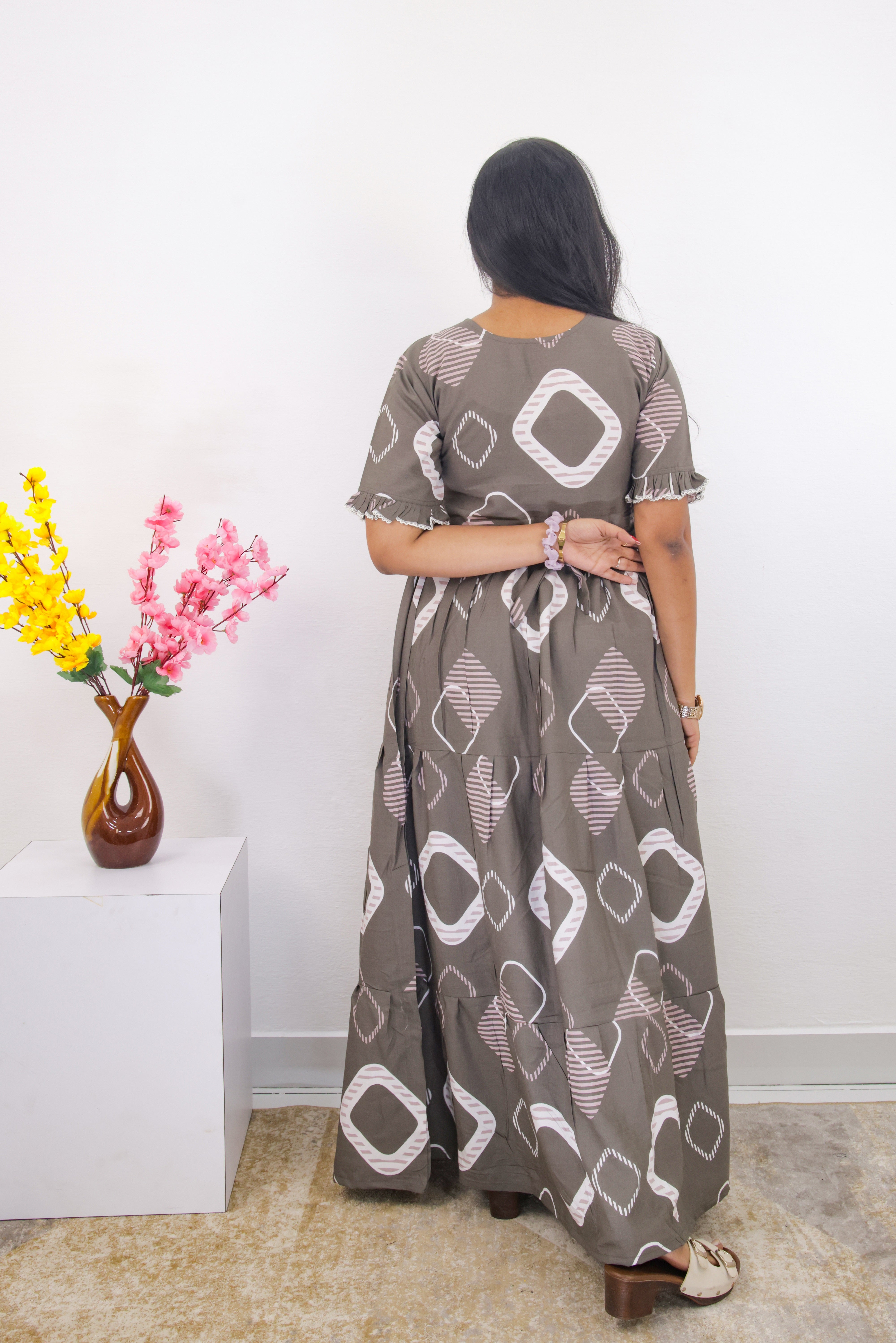Style Details: The nightie has fancy frilled sleeves, adding a touch of elegance and femininity.