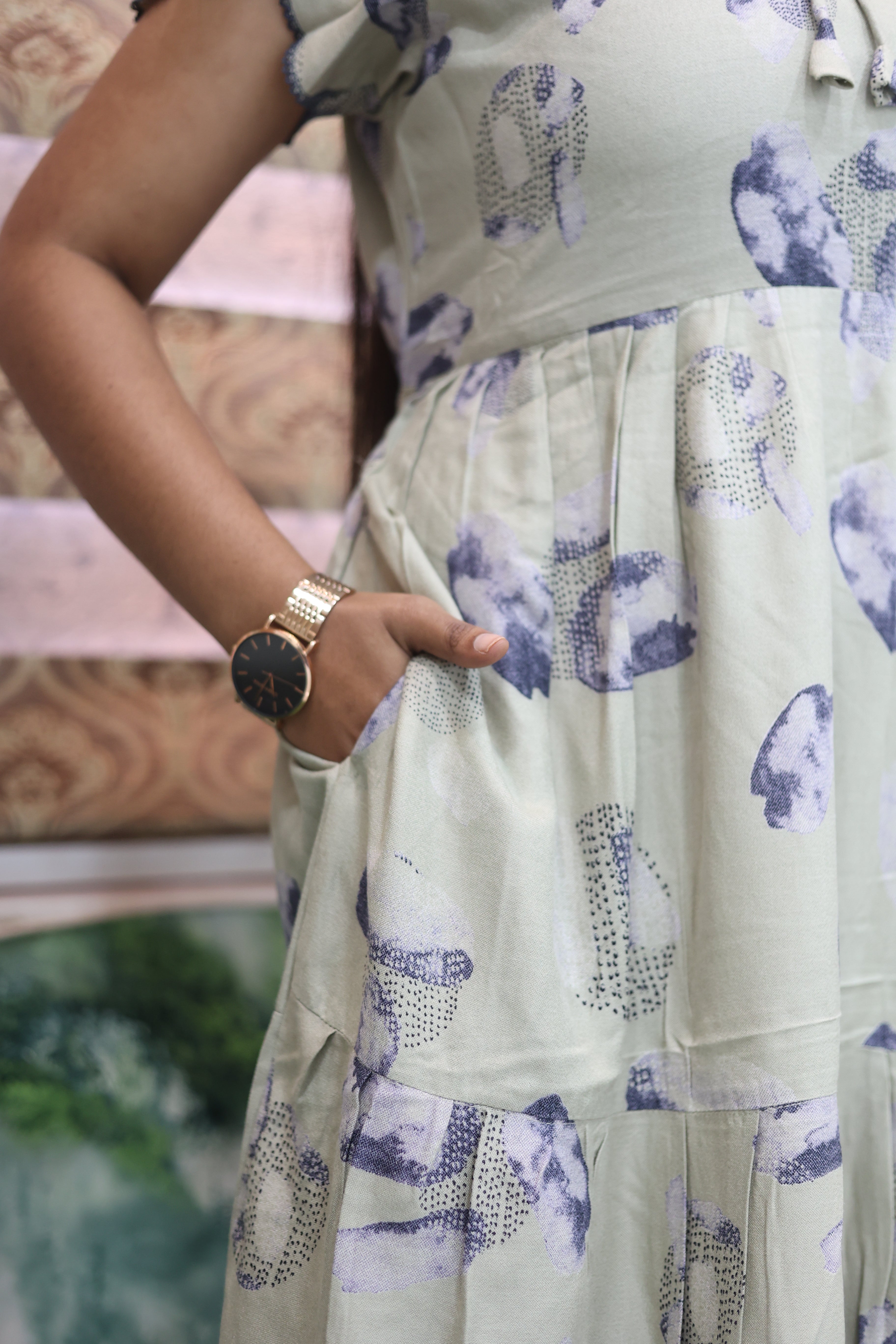 This beautiful full-length nightdress features a rich 3-layer flared bottom, giving a graceful and premium look. The stylish petal sleeves add a soft feminine touch, while the fancy neckline design enhances the overall appearance.