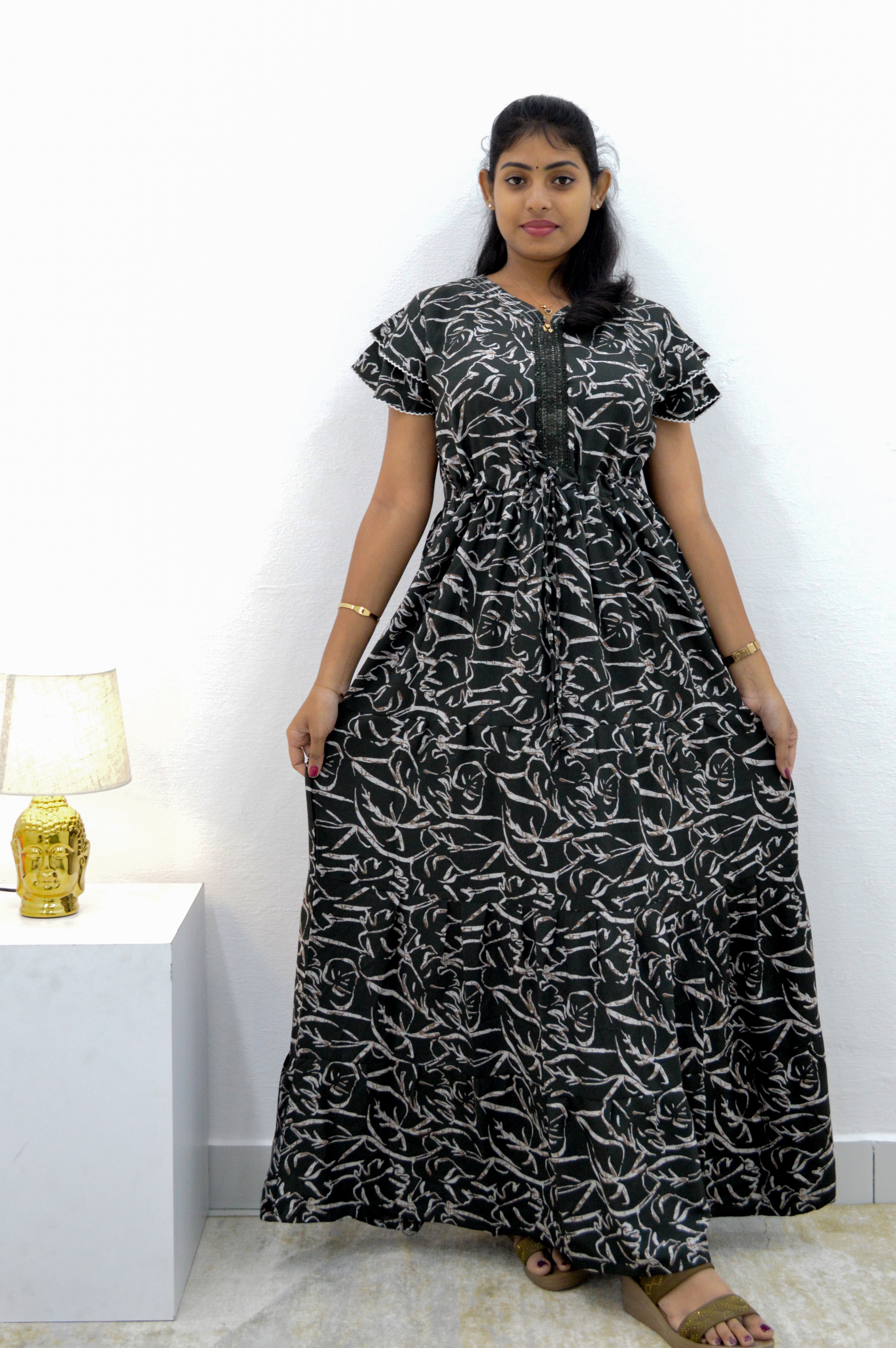 Stylish Arrivals Alpine Gathering Frock Model: This refers to a long, maxi-style nightgown made from Alpine fabric (a soft, usually printed cotton/rayon knit blend) that features a flowy, gathered silhouette like a frock.