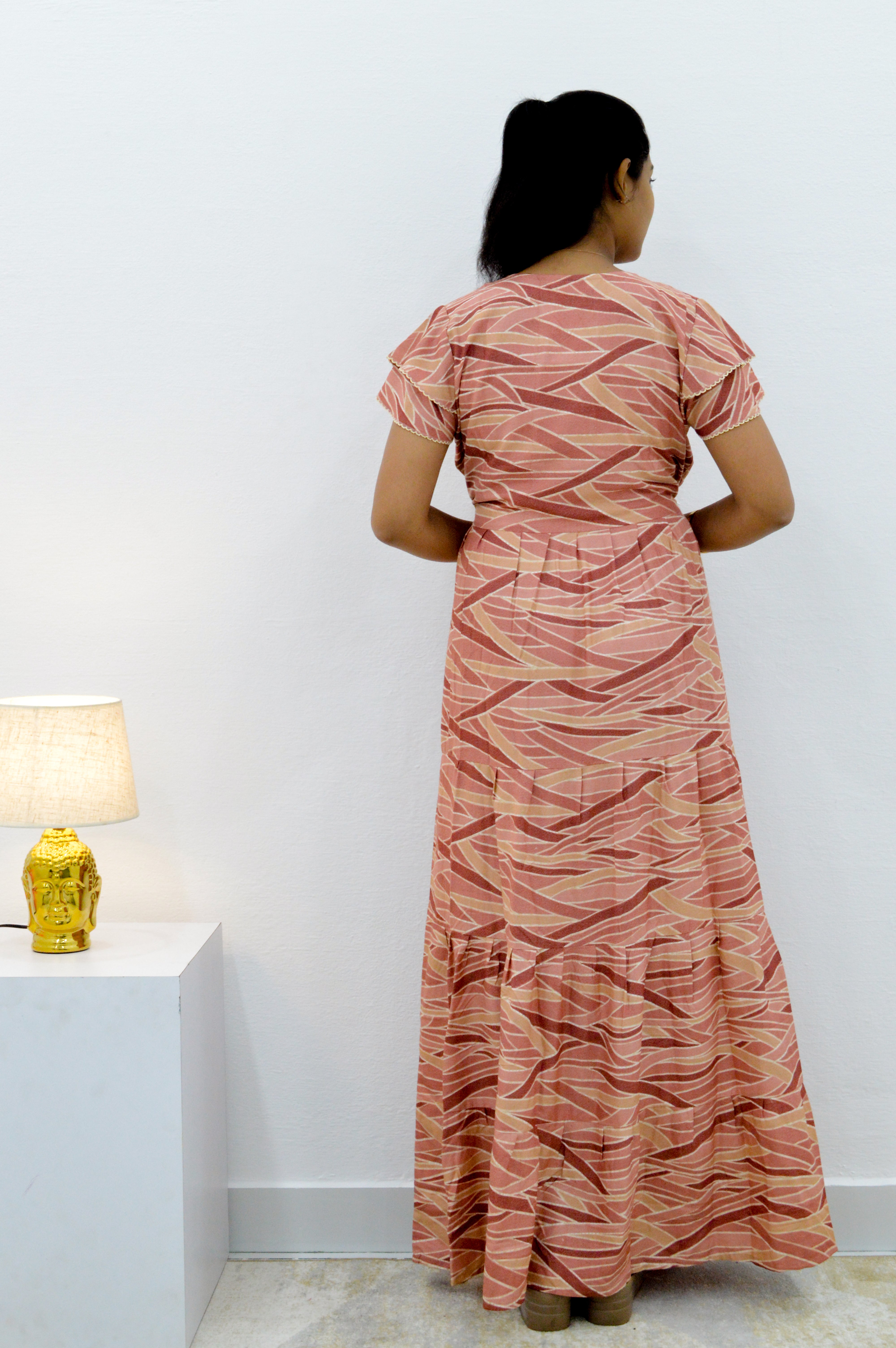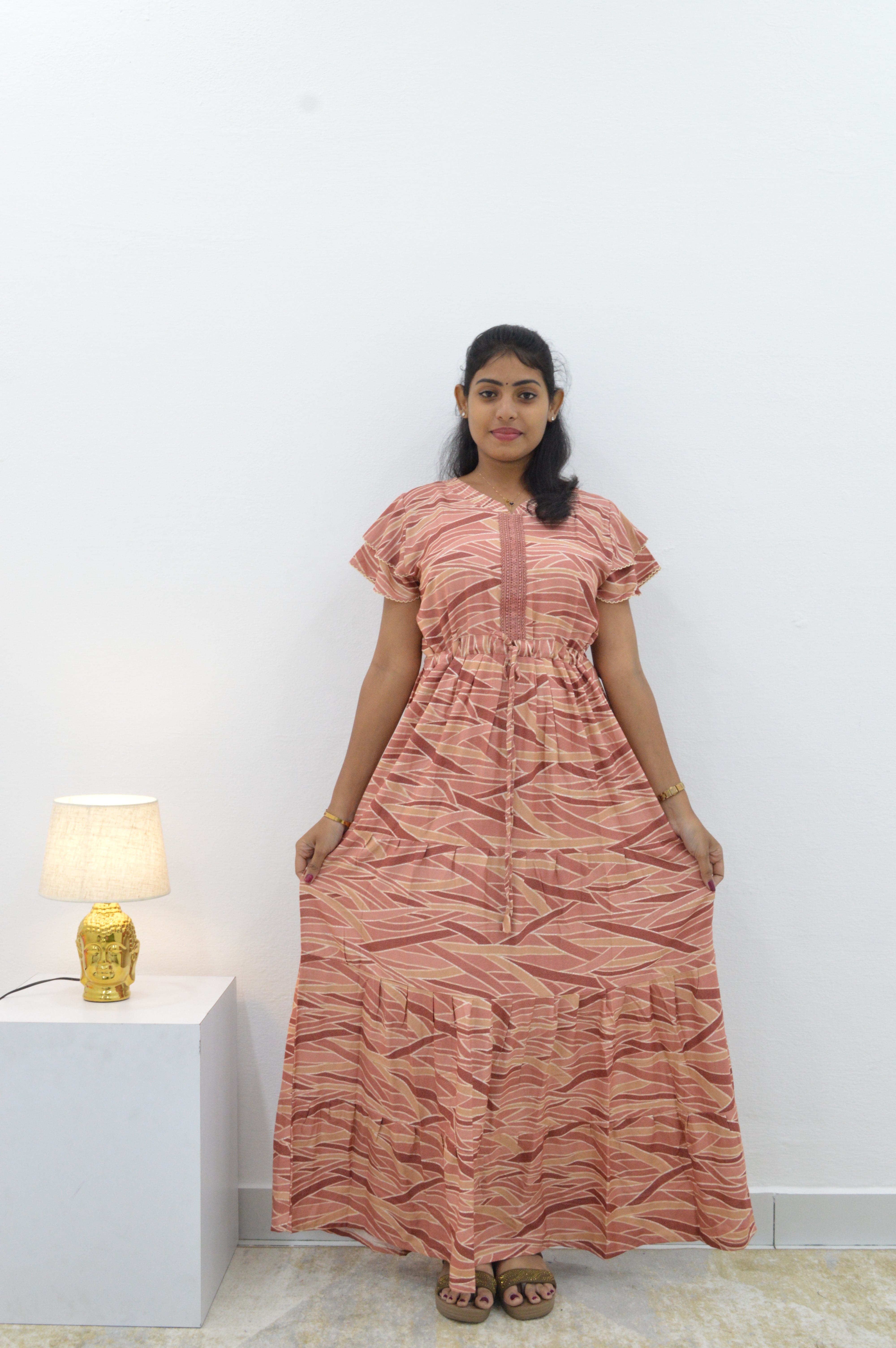 Stylish Arrivals Alpine Gathering Frock Model: This refers to a long, maxi-style nightgown made from Alpine fabric (a soft, usually printed cotton/rayon knit blend) that features a flowy, gathered silhouette like a frock.