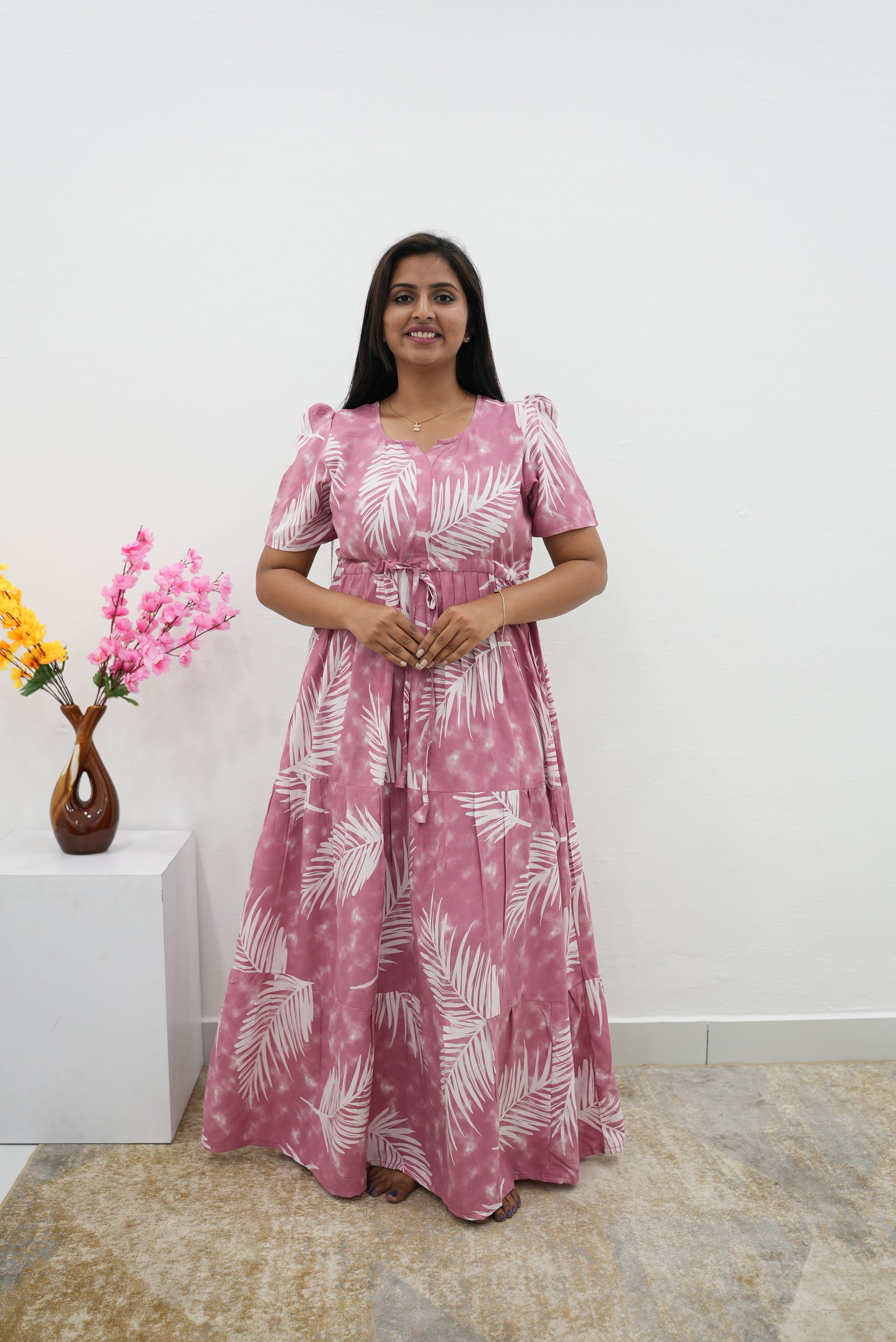 The front adjustable gathering style rope allows a customized fit, while the graceful flared frock silhouette adds a rich and elegant look. Enhanced with trendy puff sleeves, this gown brings a perfect balance of comfort and contemporary style.