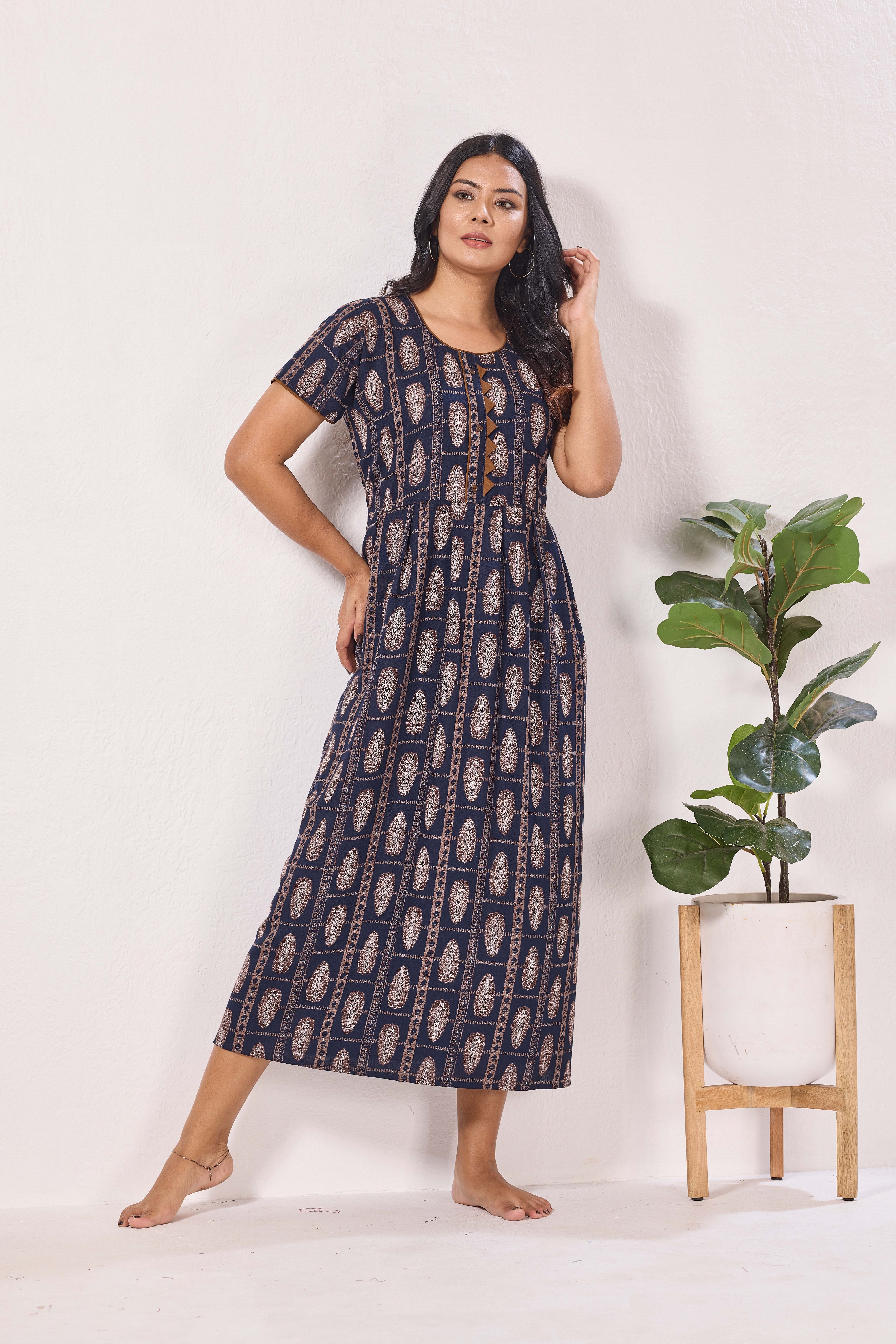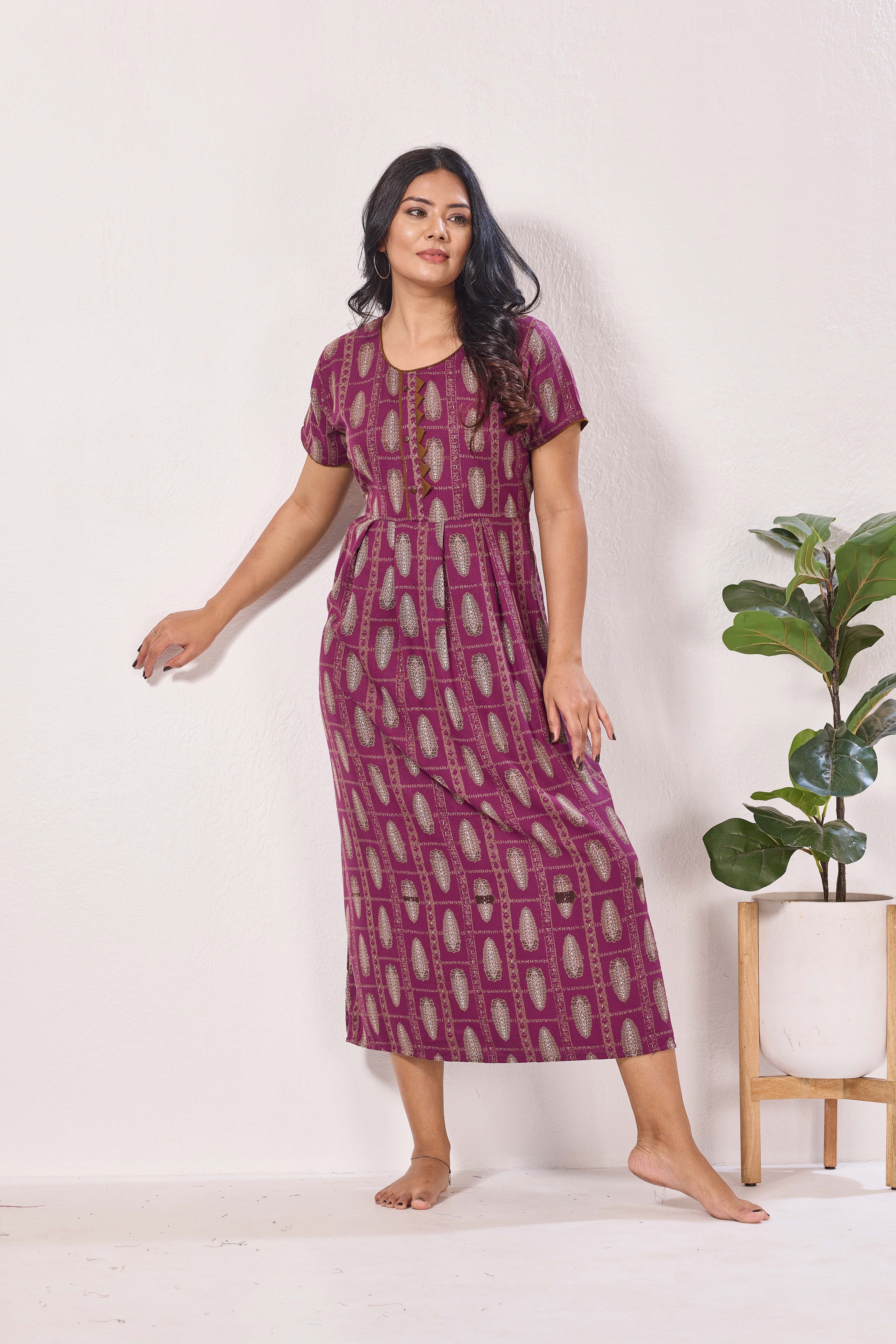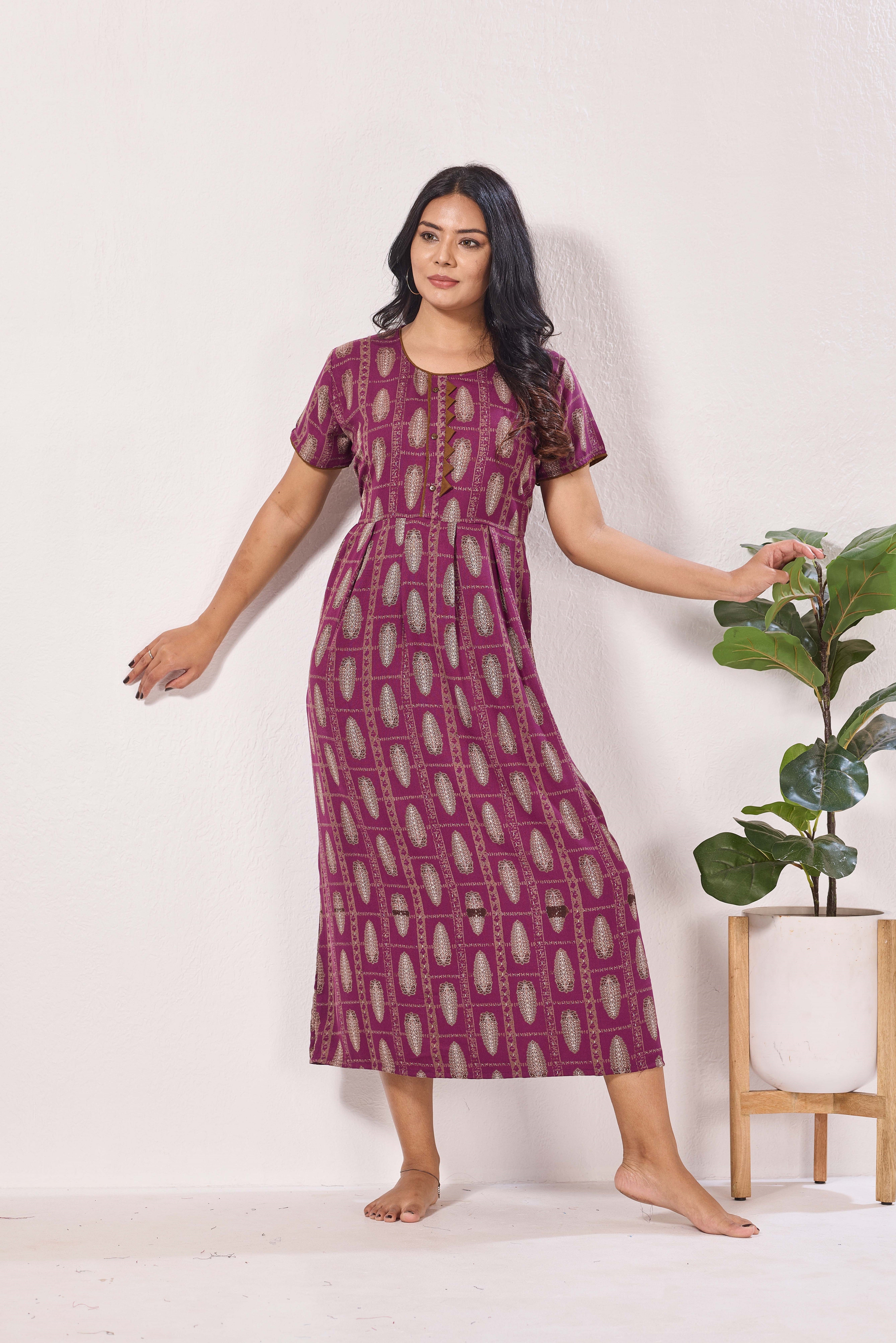 Featuring fancy Half sleeves that add a graceful touch and a stylish Round neckline for a flattering look, these nighties are crafted to enhance both comfort and confidence. The zipless model ensures a smooth, relaxed fit without any hassle, making it perfect for all-day and all-night wear.