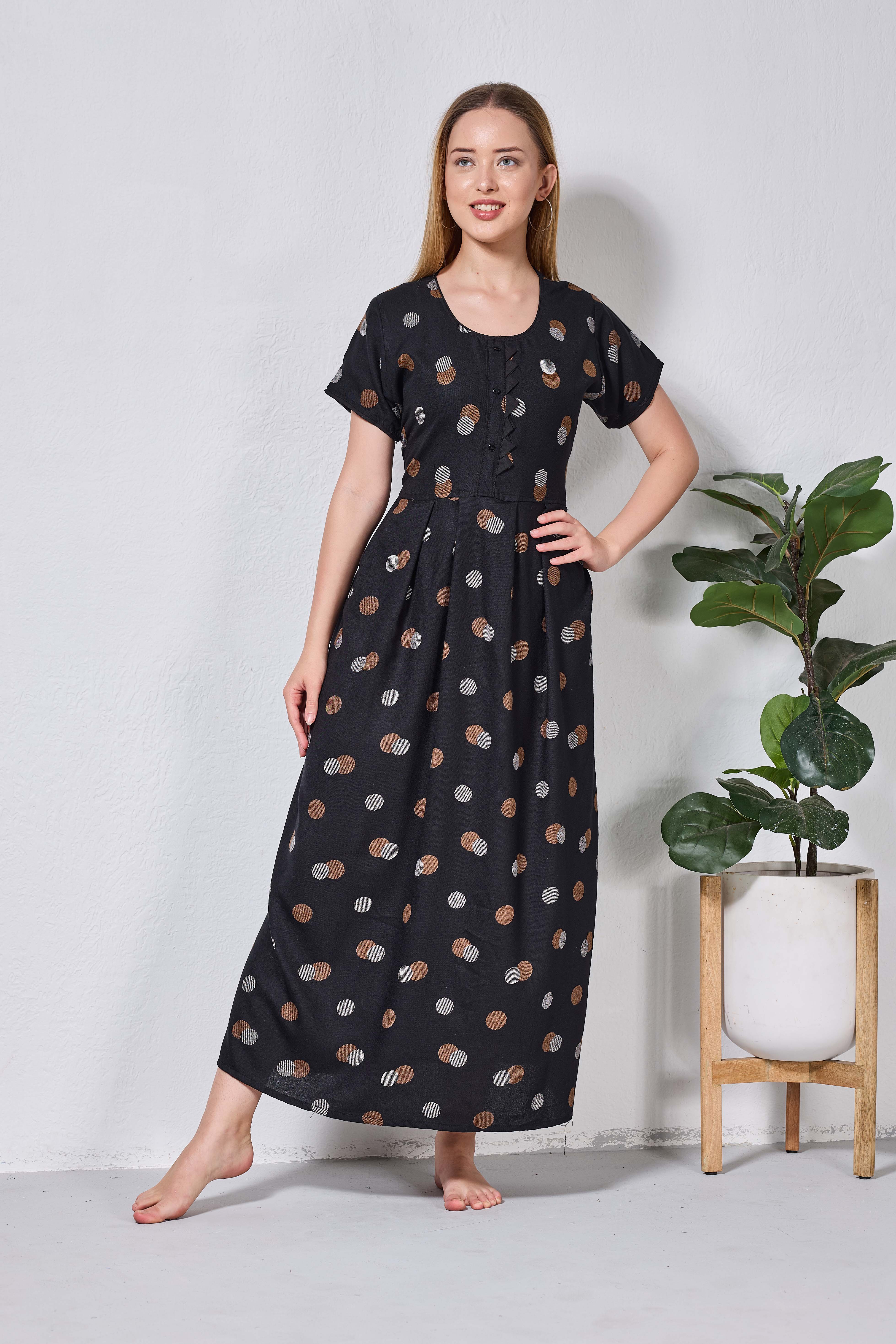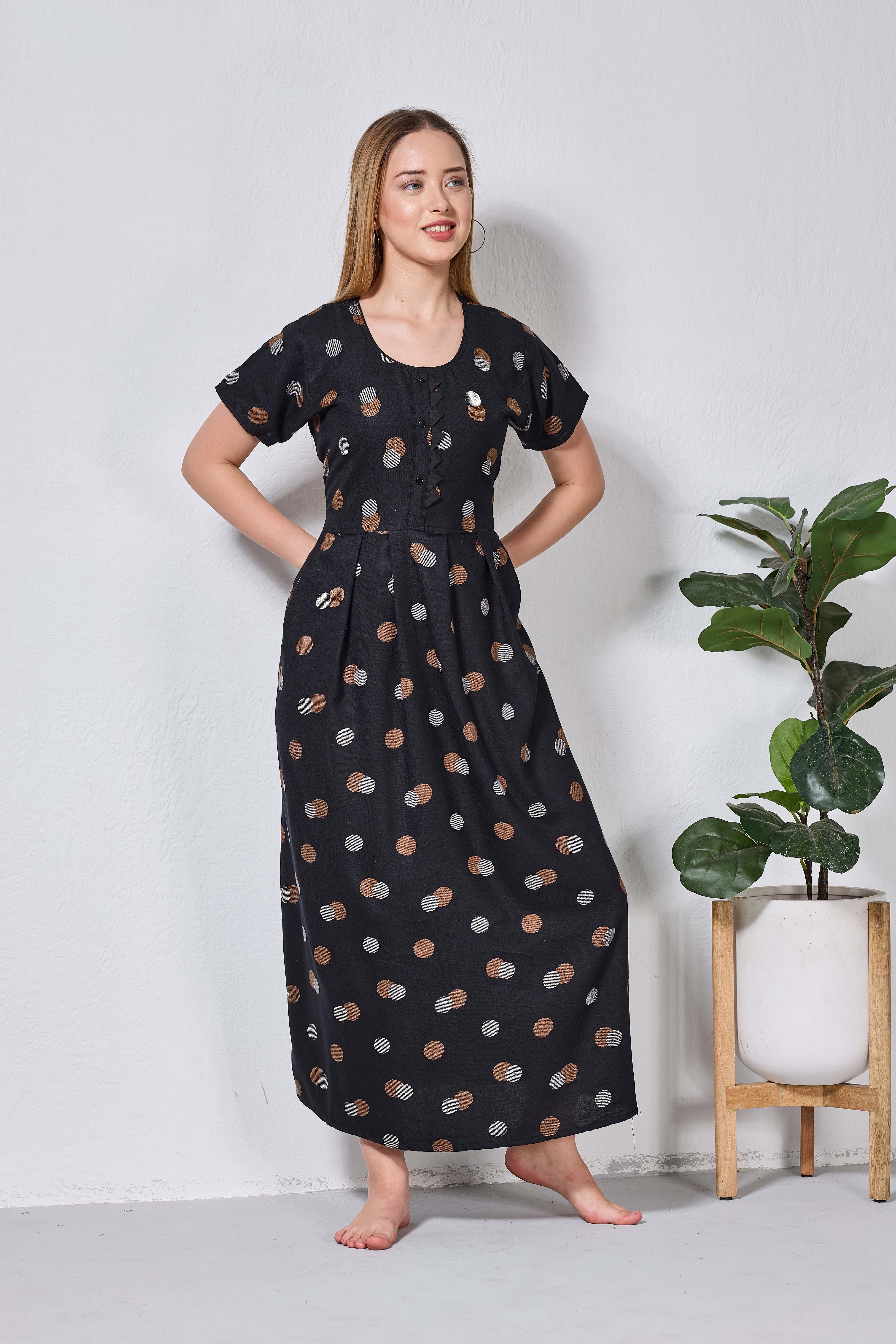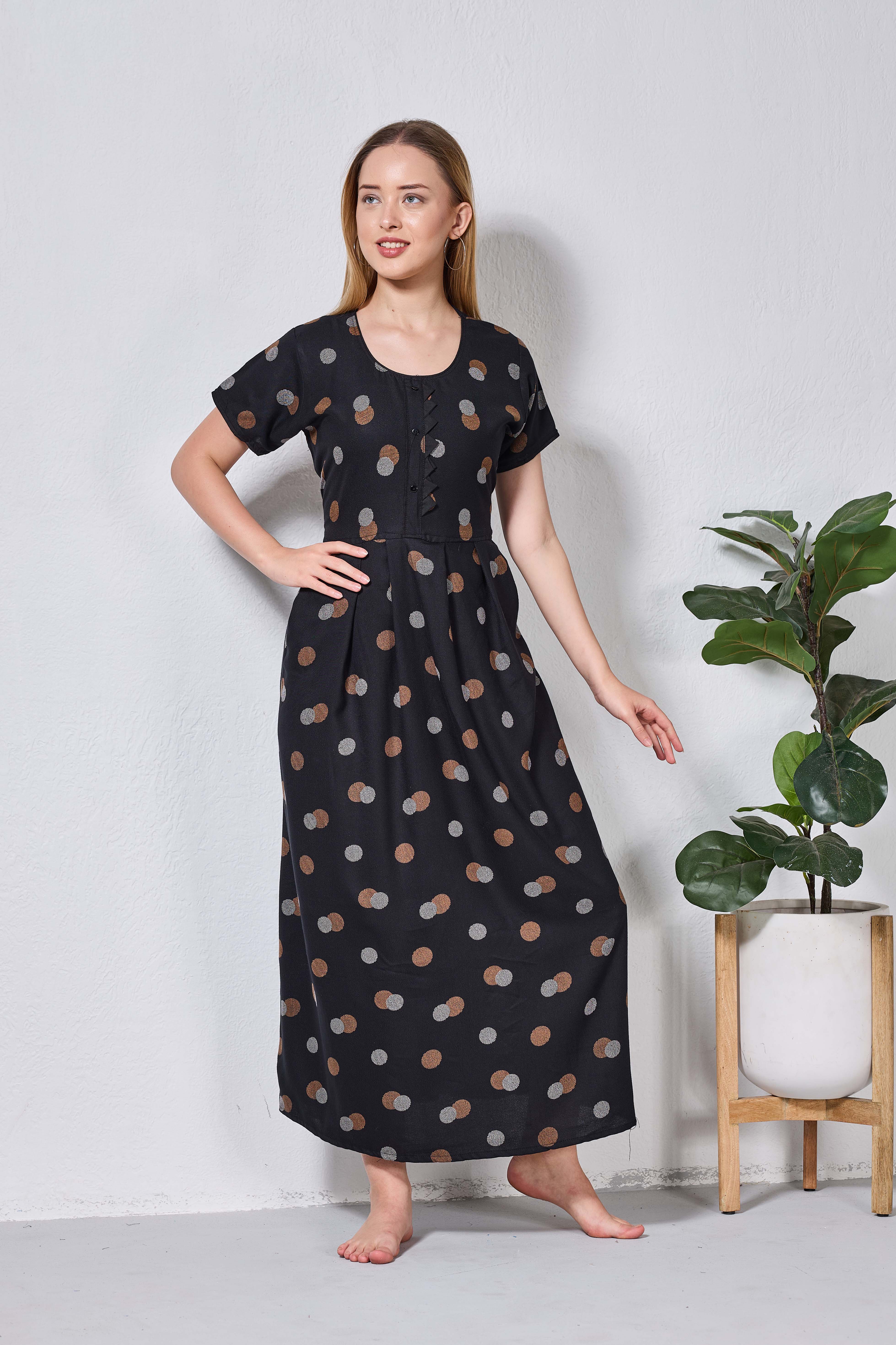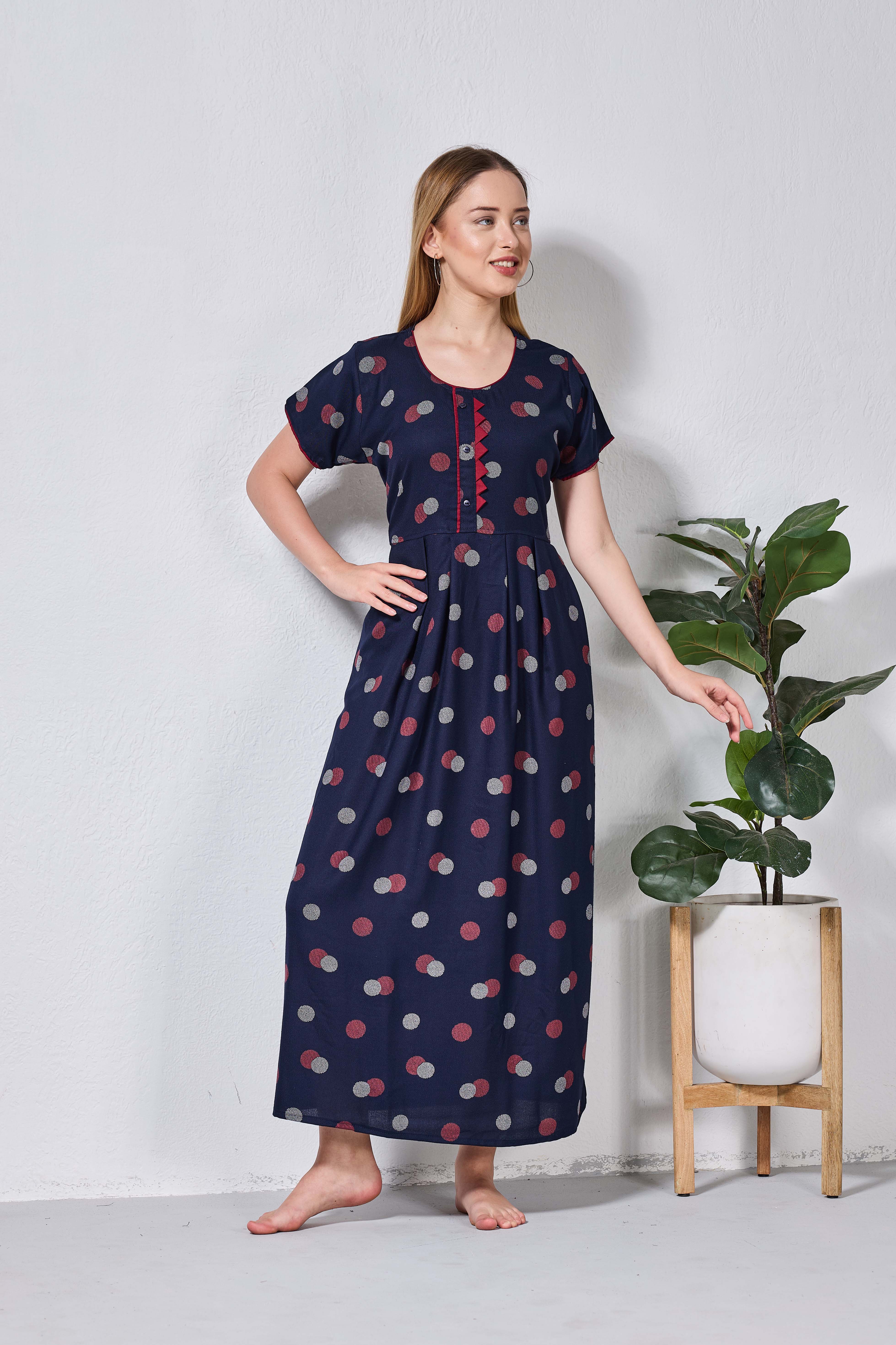 Featuring fancy Half sleeves that add a graceful touch and a stylish Round neckline for a flattering look, these nighties are crafted to enhance both comfort and confidence. The zipless model ensures a smooth, relaxed fit without any hassle, making it perfect for all-day and all-night wear.