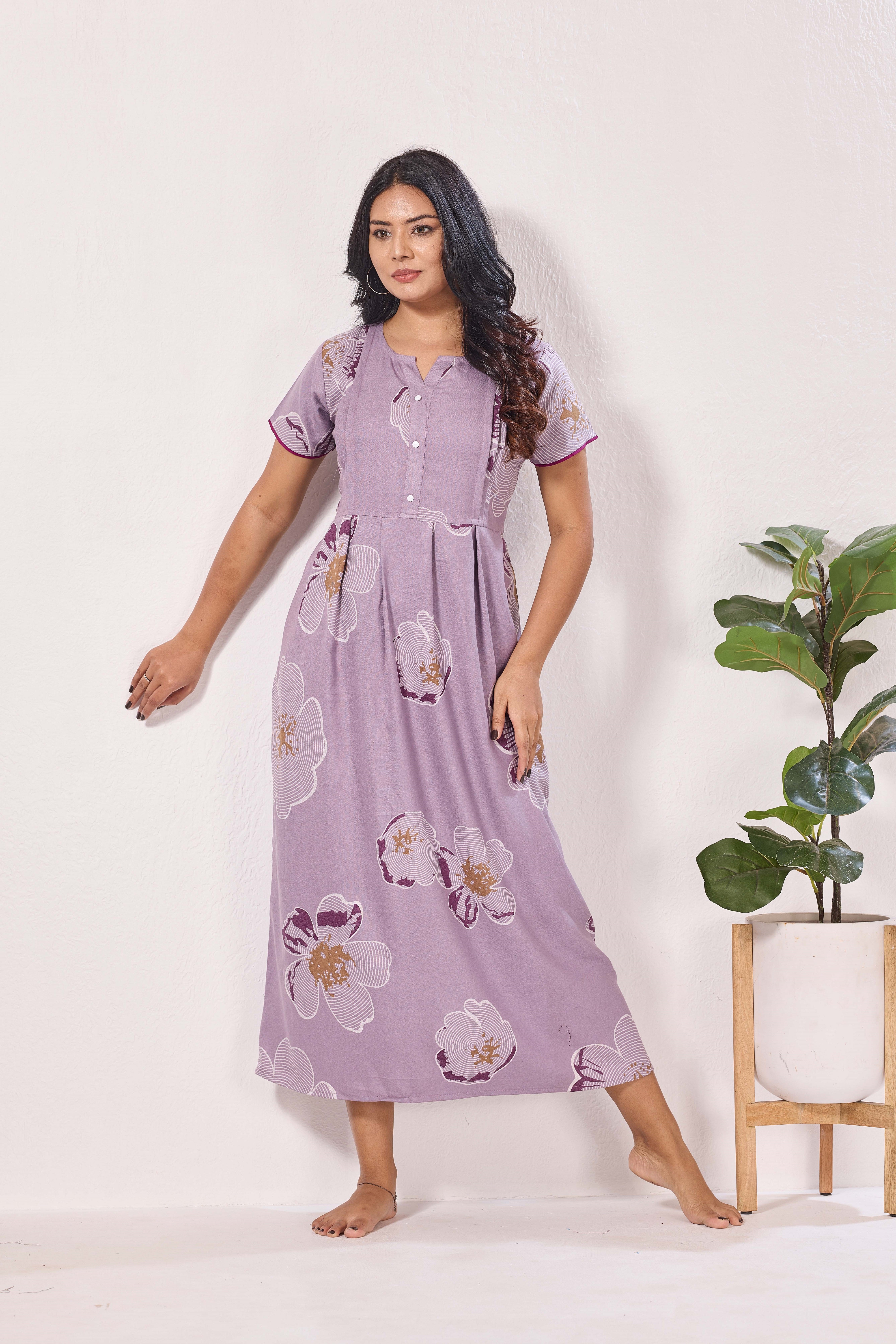 Featuring fancy Half sleeves that add a graceful touch and a stylish V-cut neckline for a flattering look, these nighties are crafted to enhance both comfort and confidence. The zipless model ensures a smooth, relaxed fit without any hassle, making it perfect for all-day and all-night wear.