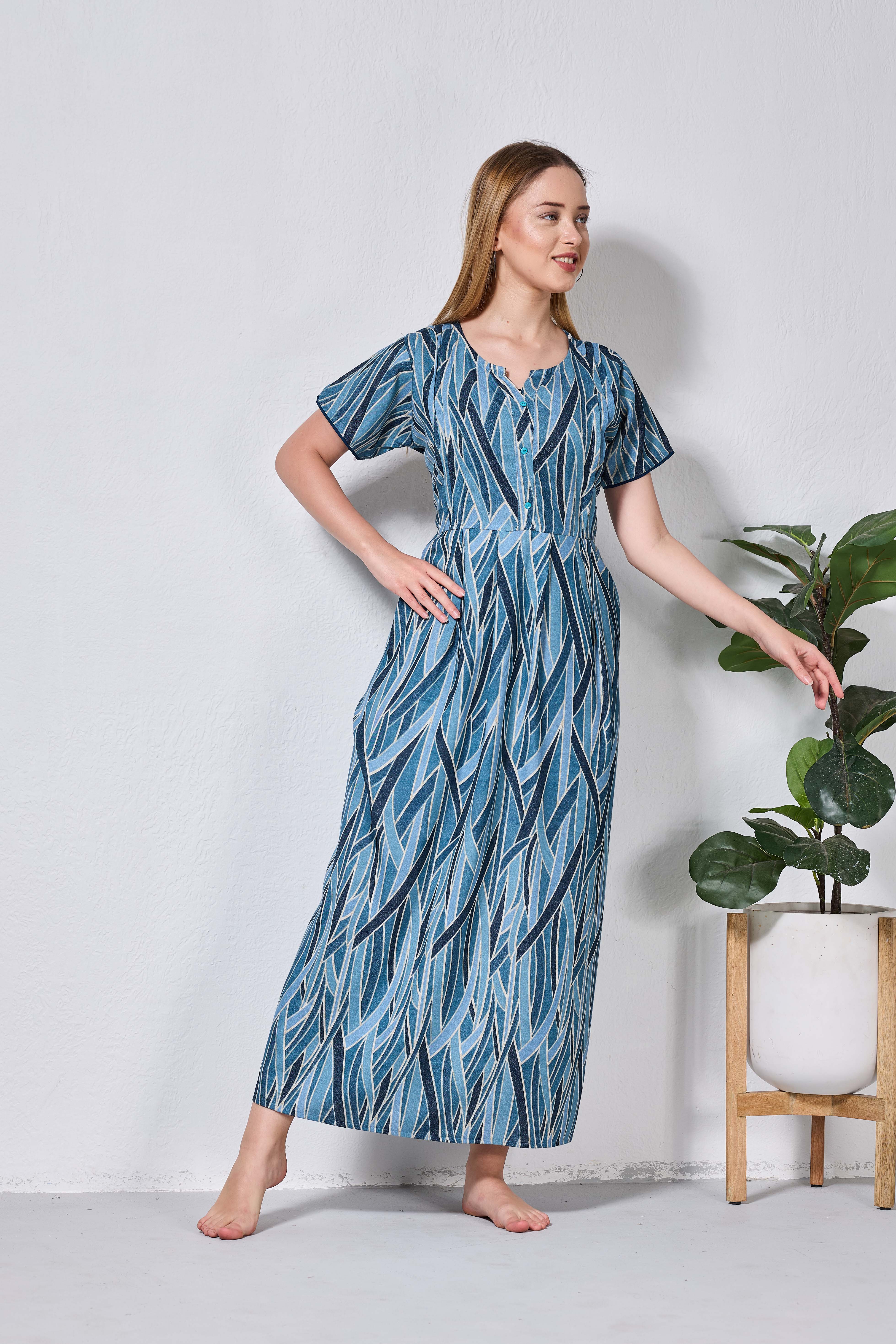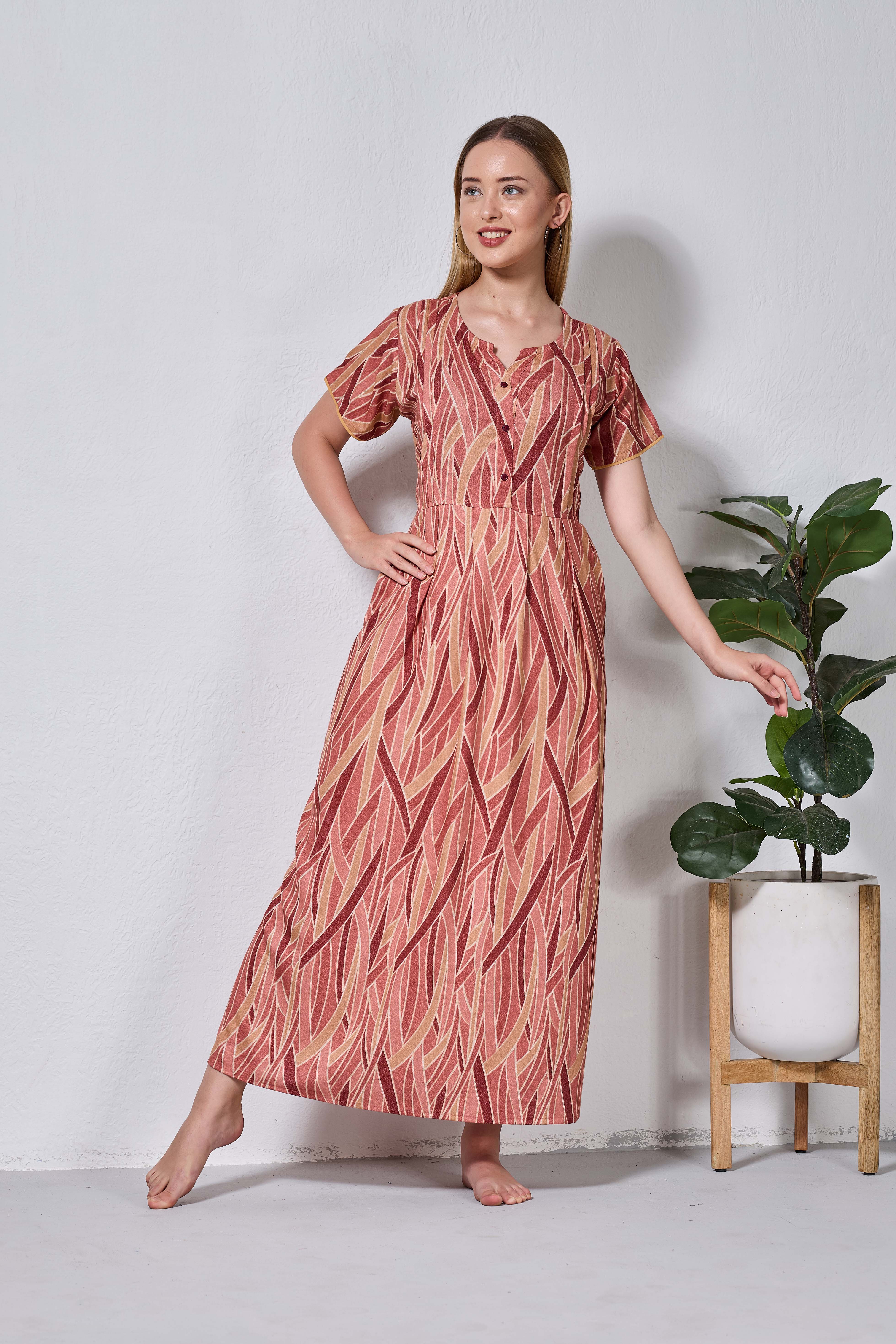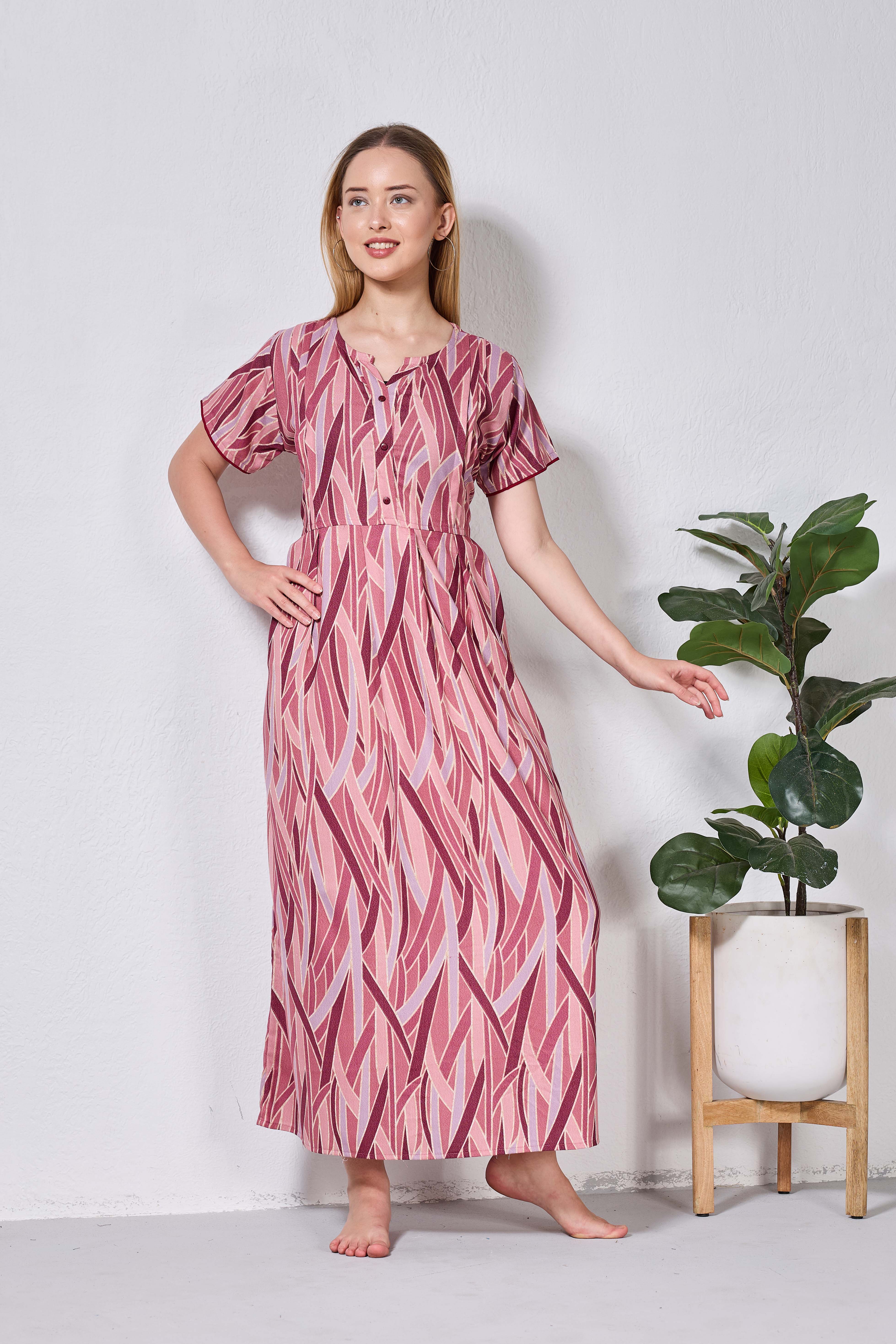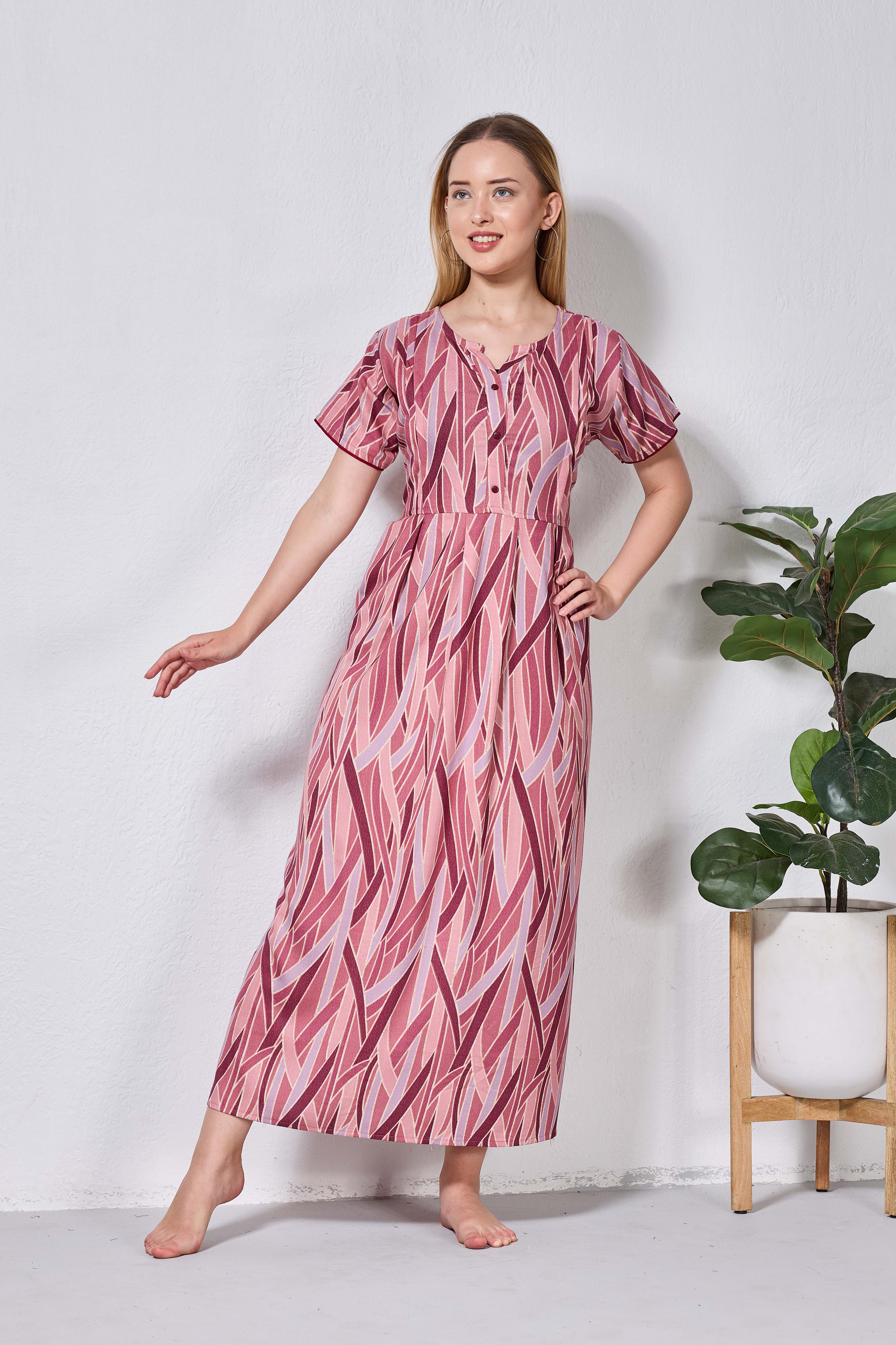 Featuring fancy Half sleeves that add a graceful touch and a stylish V-cut neckline for a flattering look, these nighties are crafted to enhance both comfort and confidence. The zipless model ensures a smooth, relaxed fit without any hassle, making it perfect for all-day and all-night wear.