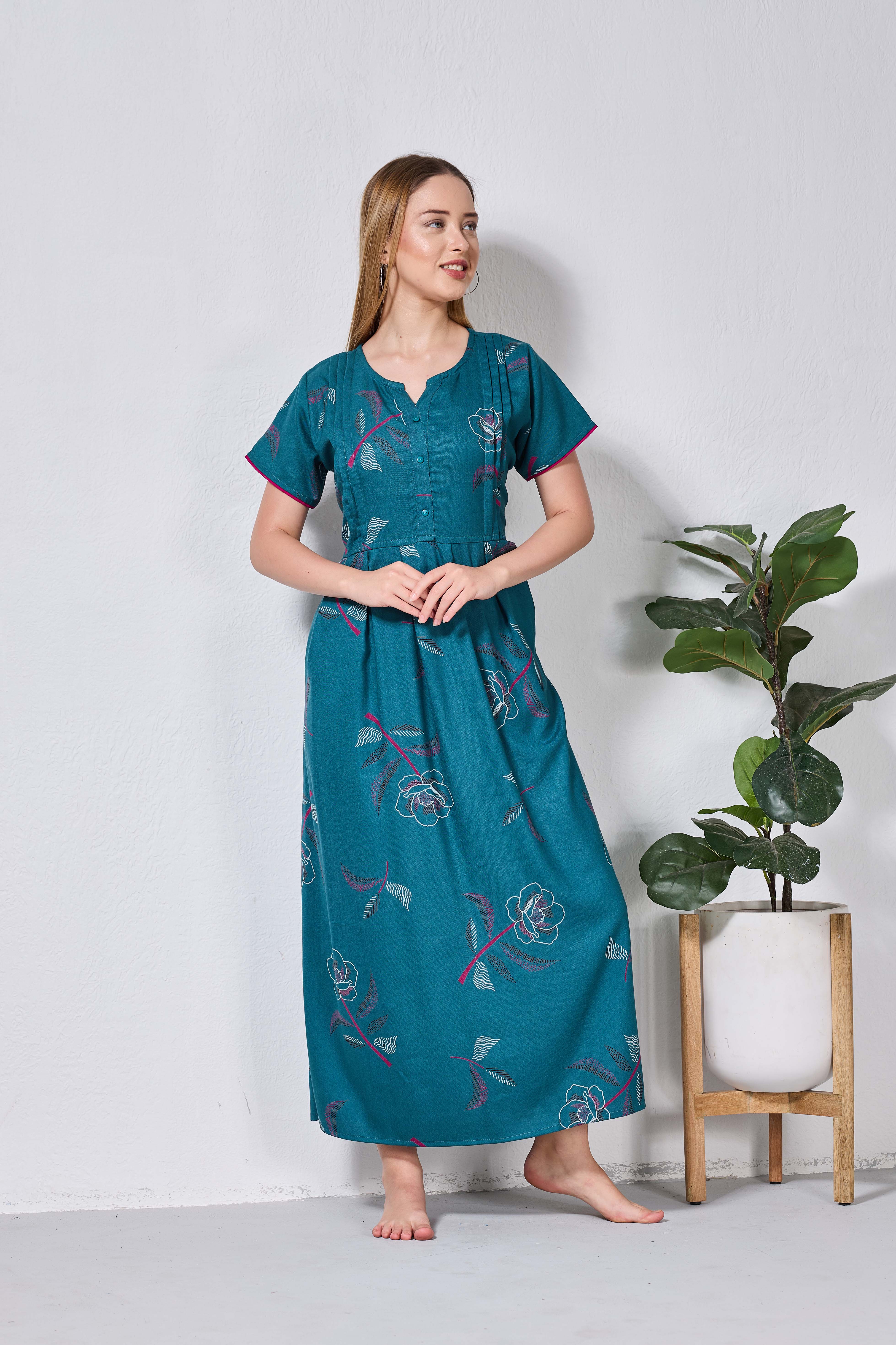 Featuring fancy Half sleeves that add a graceful touch and a stylish V-cut neckline for a flattering look, these nighties are crafted to enhance both comfort and confidence. The zipless model ensures a smooth, relaxed fit without any hassle, making it perfect for all-day and all-night wear.