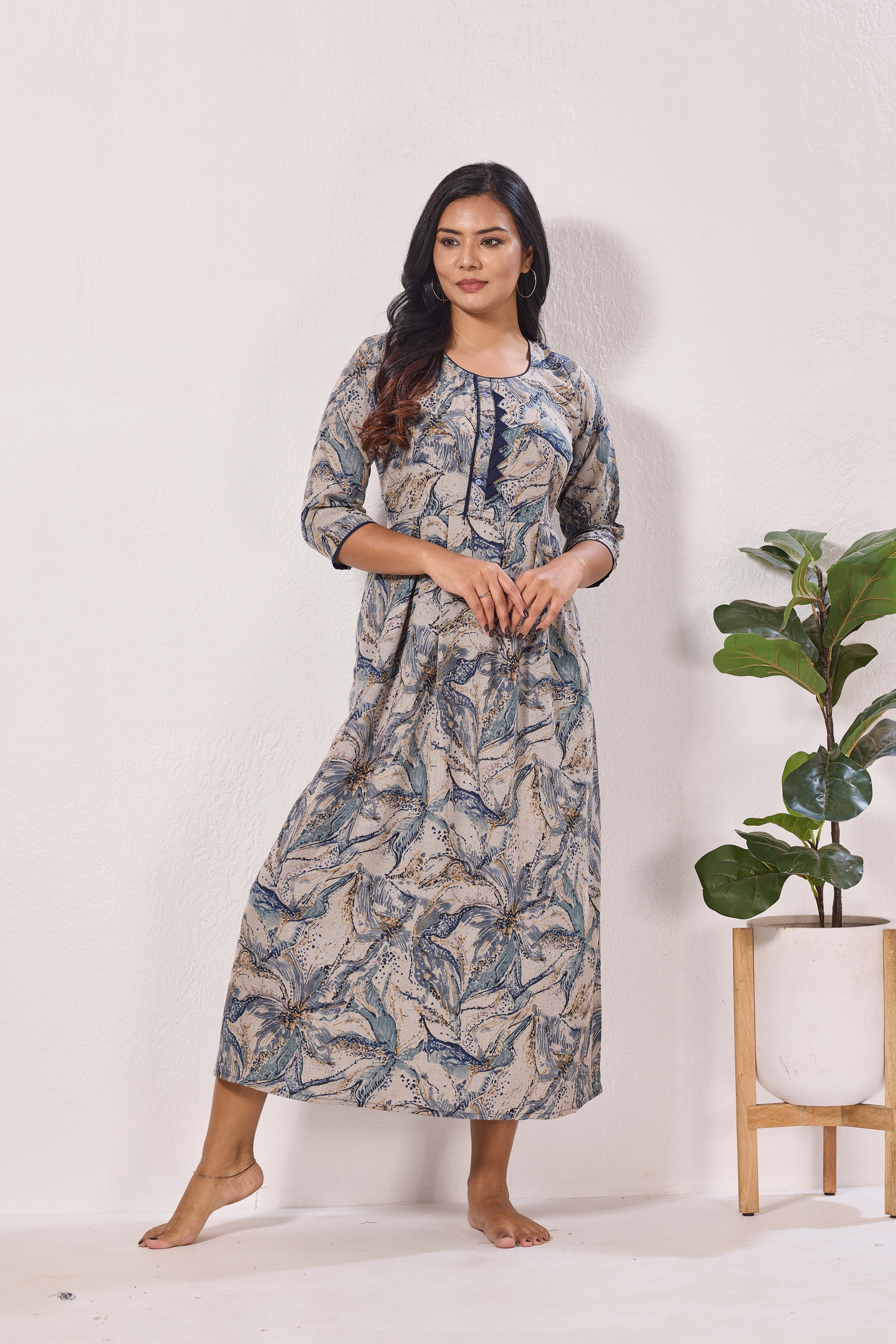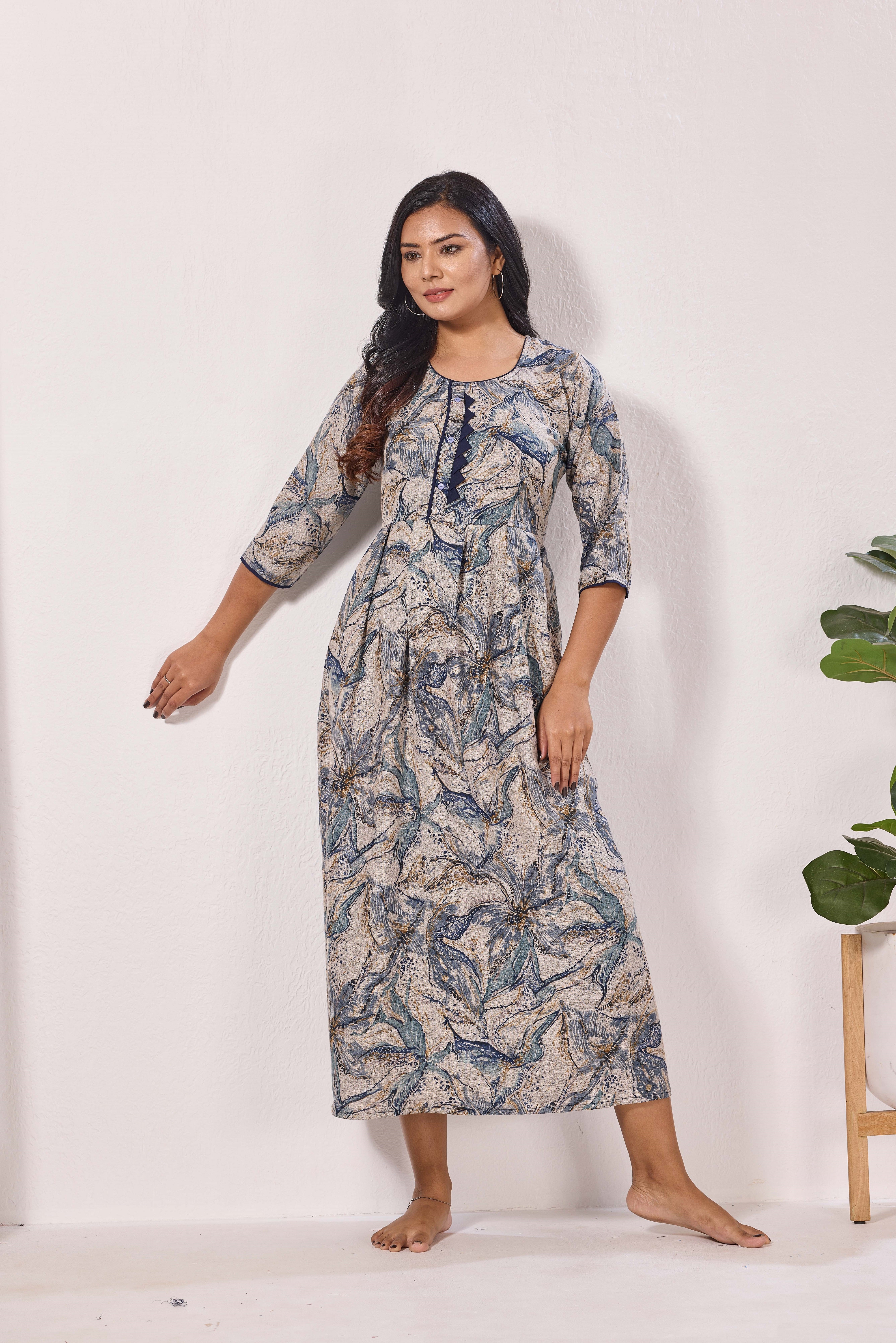 Experience the ultimate in comfort and style with the MANGAI Alpine Kurti Style Nighty. This elegant nightwear piece features a beautiful Kurti design with a relaxed fit, making it perfect for a restful night's sleep.