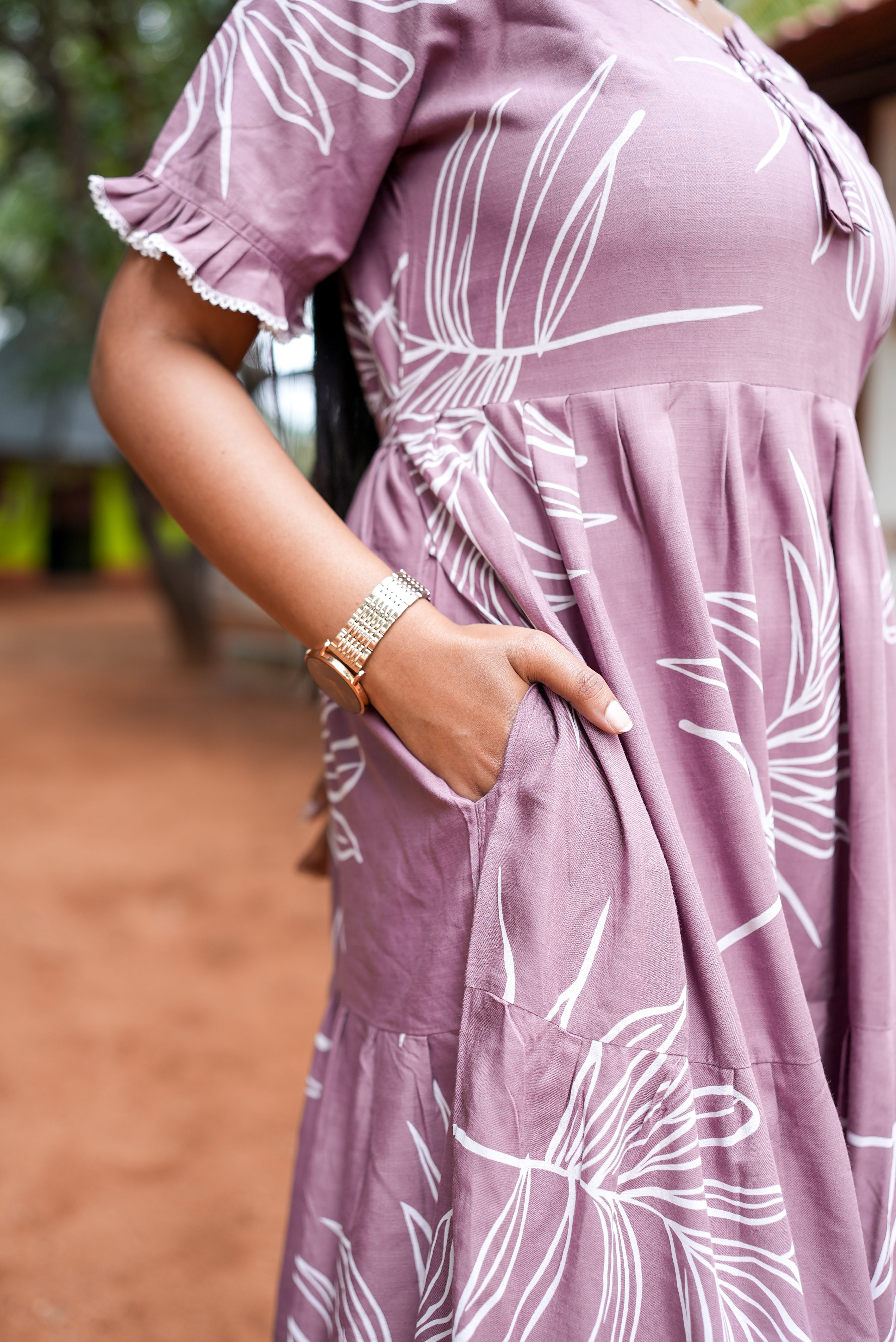 The beautiful 3-layer flared silhouette gives a graceful flow, while the fancy frilled sleeves add a stylish feminine charm. Designed with a convenient side pocket for everyday ease and a back tie rope for a perfect adjustable fit, this nighty blends functionality with fashion effortlessly.