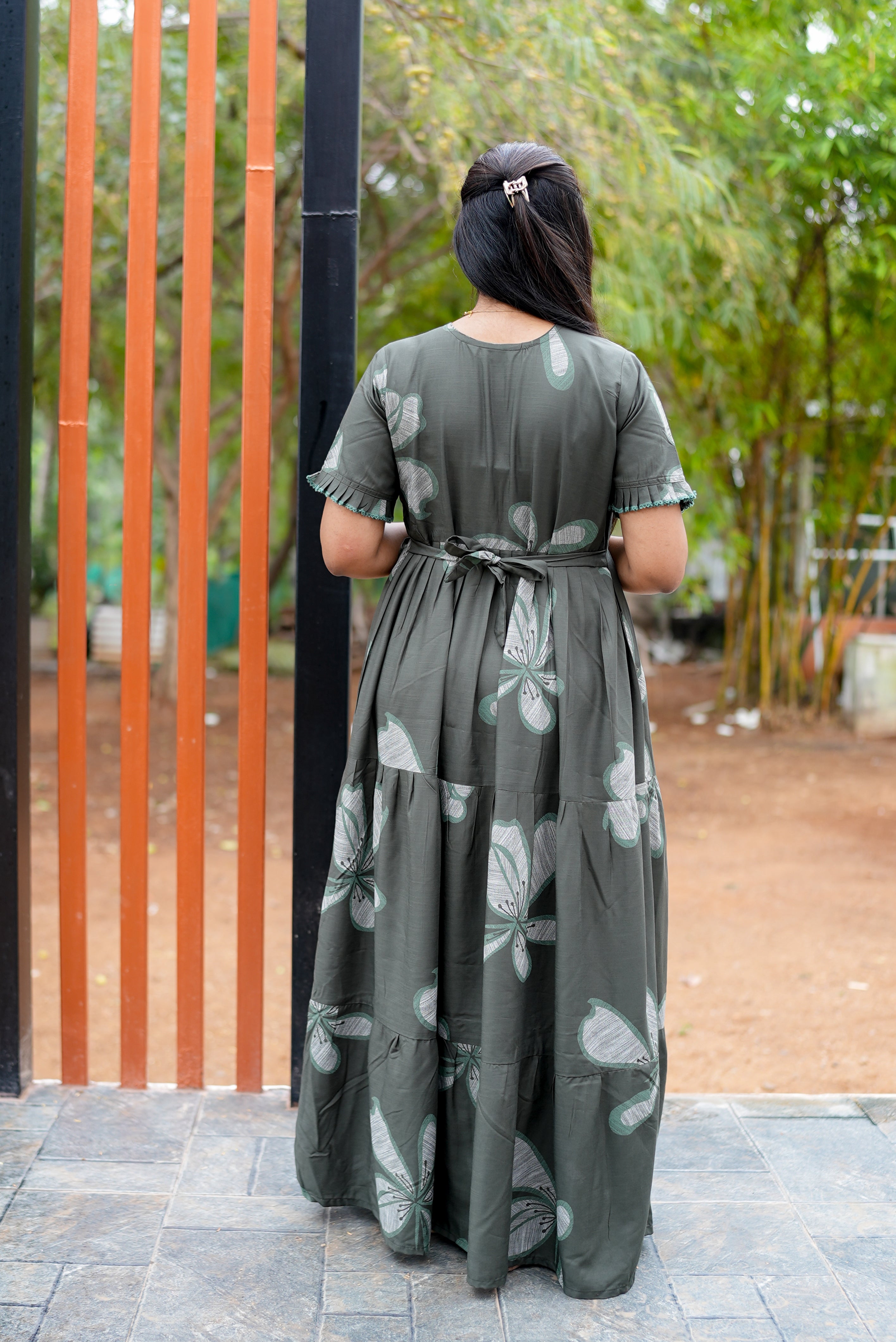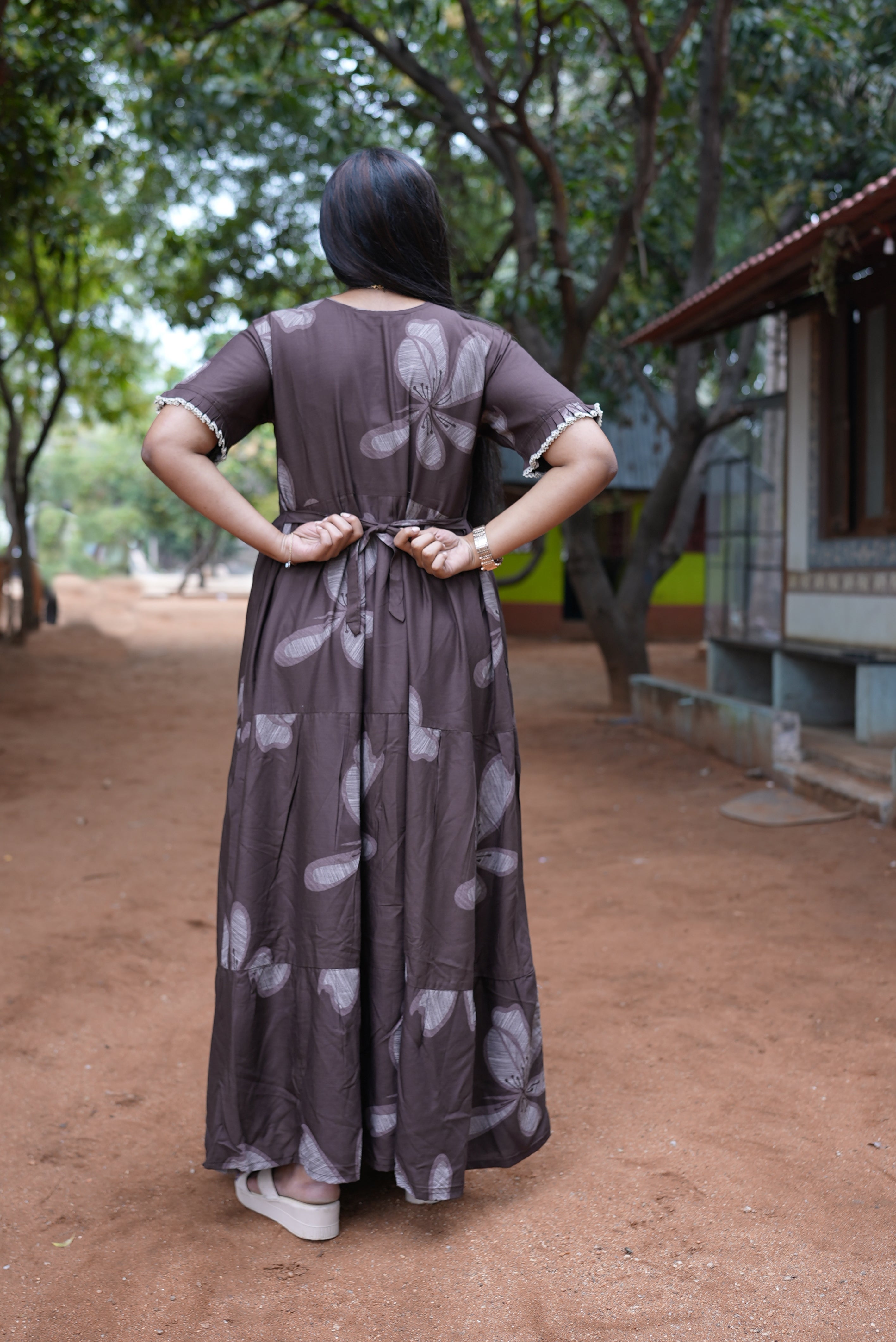 The beautiful 3-layer flared silhouette gives a graceful flow, while the fancy frilled sleeves add a stylish feminine charm. Designed with a convenient side pocket for everyday ease and a back tie rope for a perfect adjustable fit, this nighty blends functionality with fashion effortlessly.