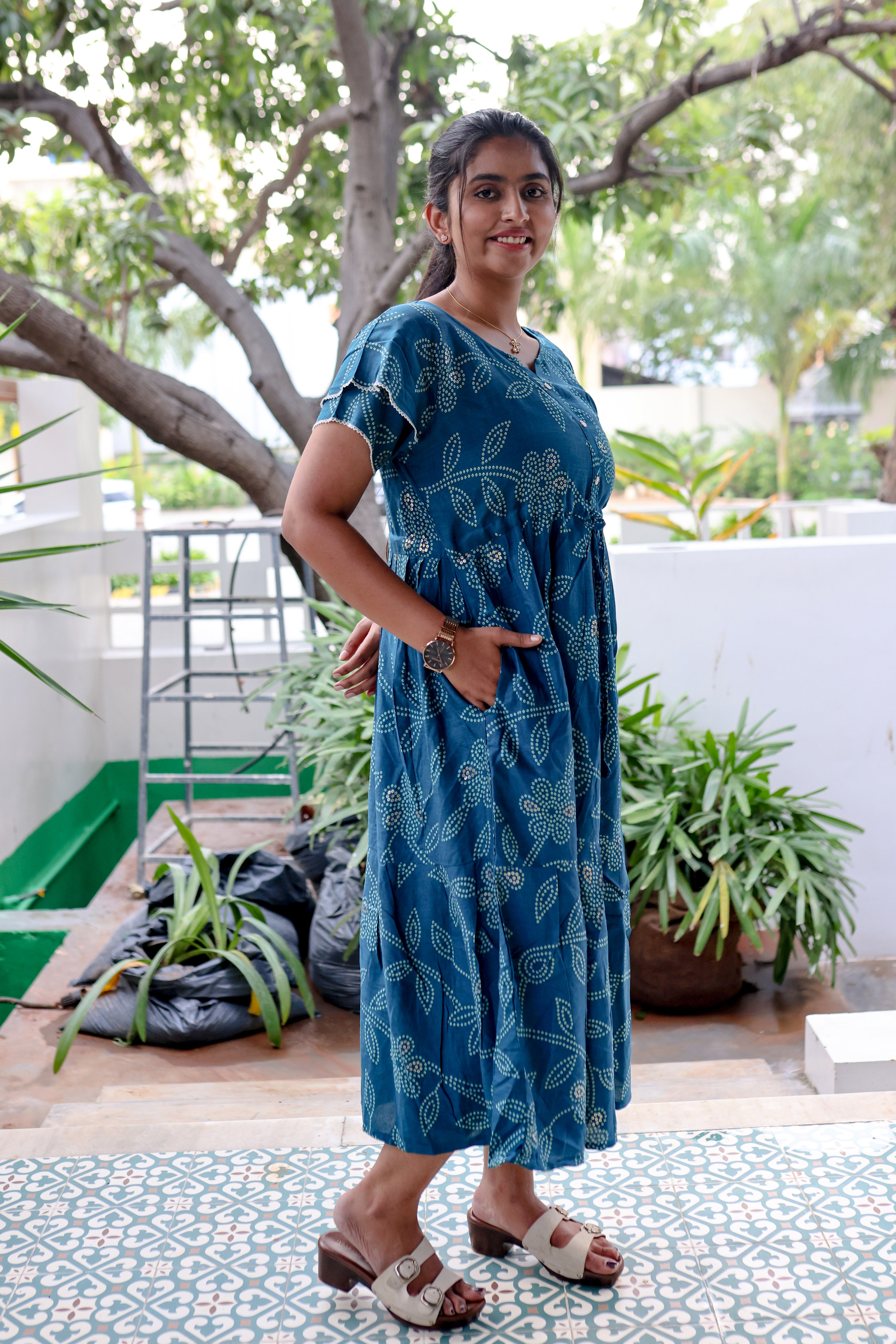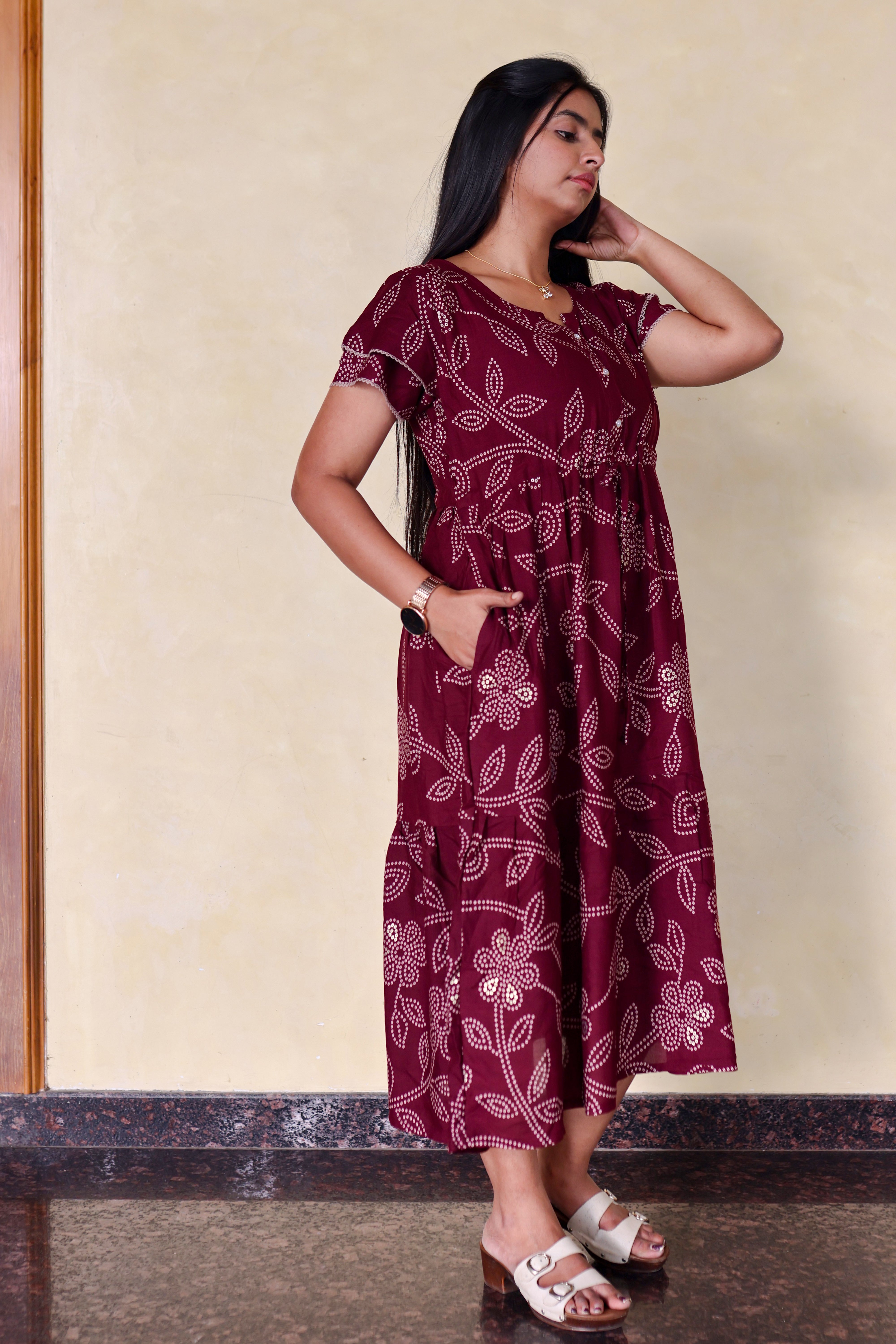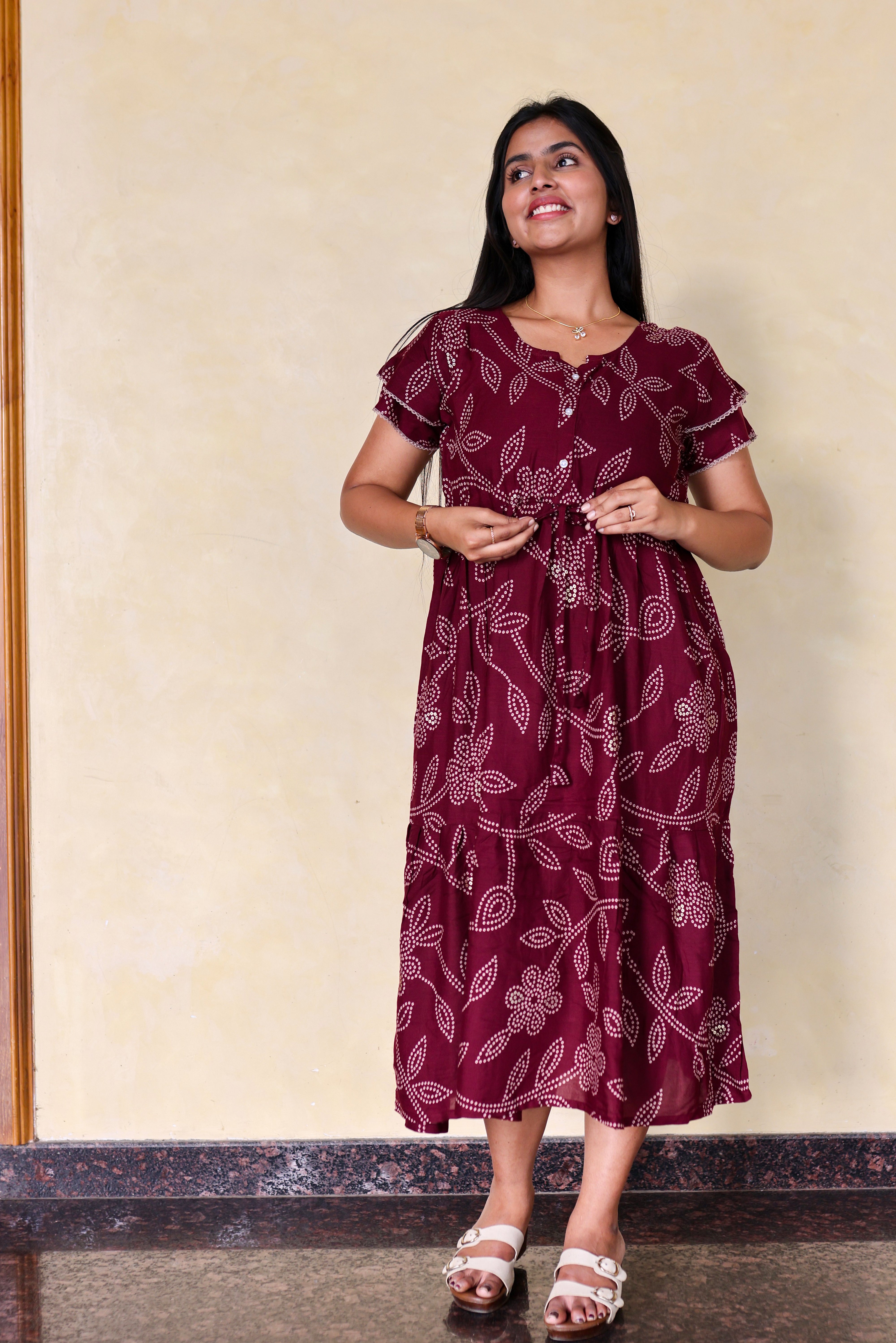 Rayon Colourful Foil Printing Gathering Frock Model Nighties | Side Pocket and Gathering Front Rope | Fancy Sleeve & Maxi Frock Nightwear for Stylish Women's (FGF)