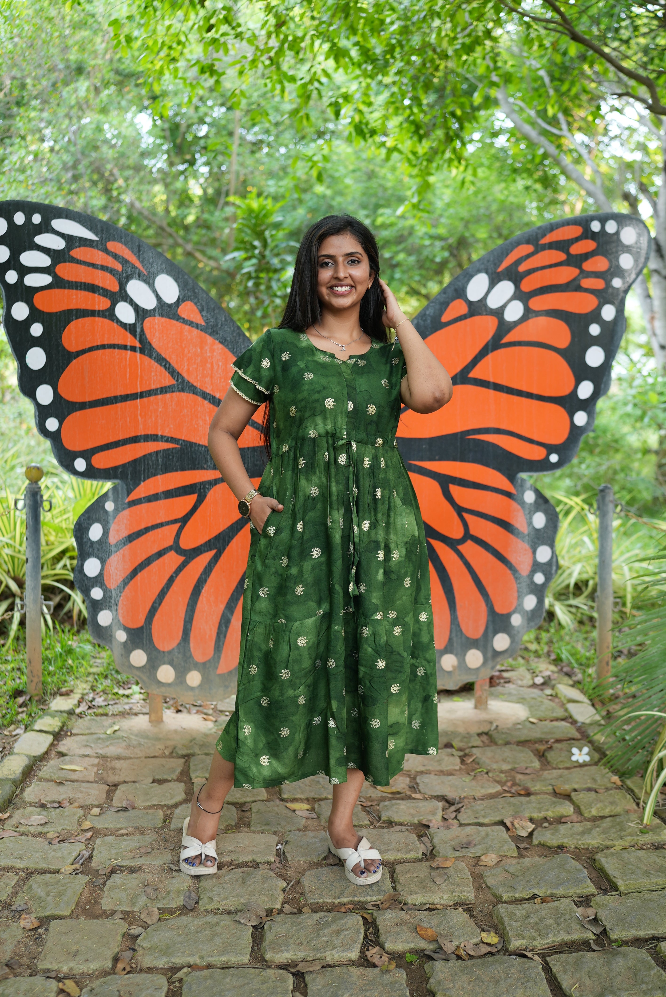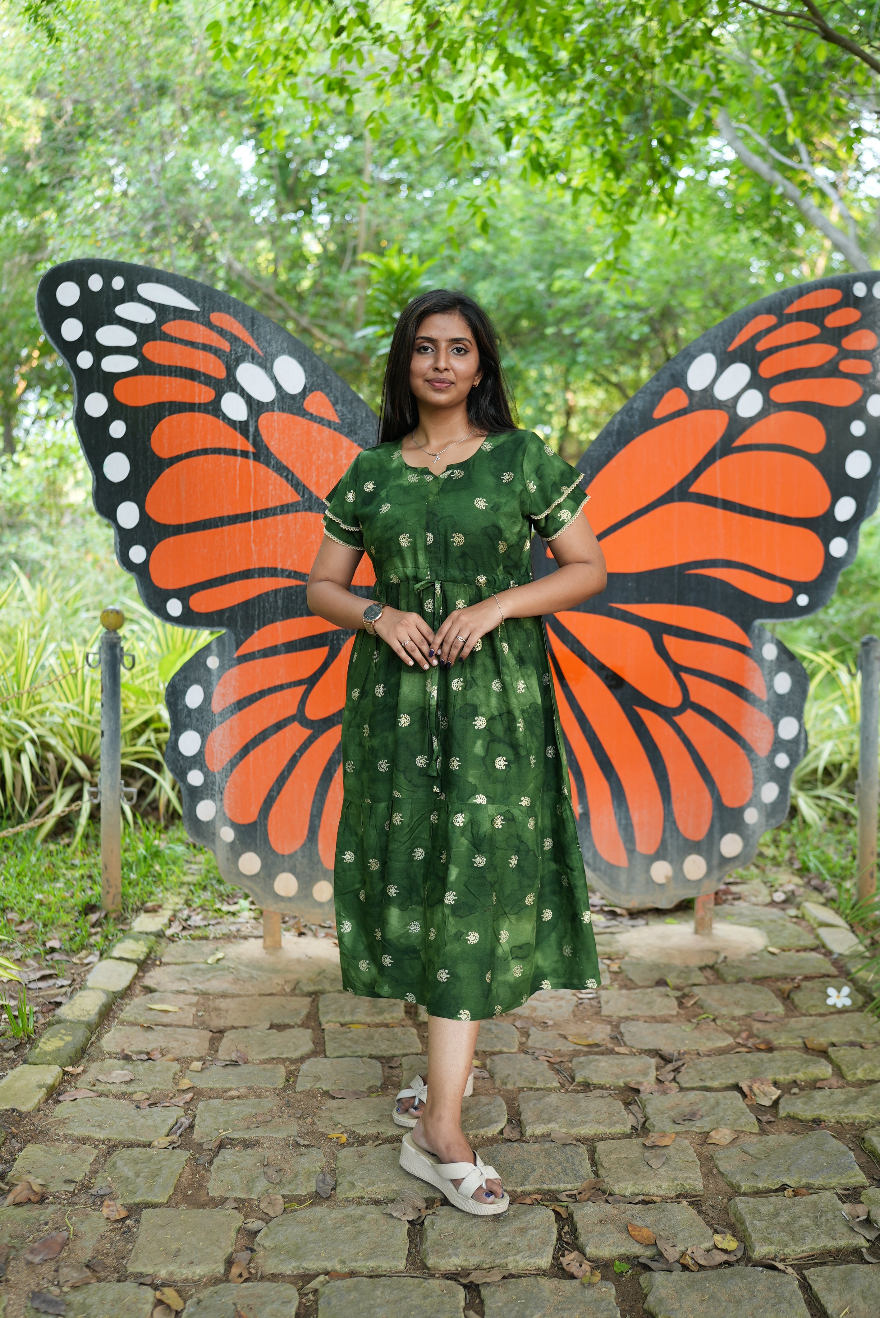 Emerald Forest Gold Foil Rayon Maxi Dress – Double Layer Flutter Sleeve Frock with Adjustable Waist & Pockets - Lightweight Breathable MAXI Frock