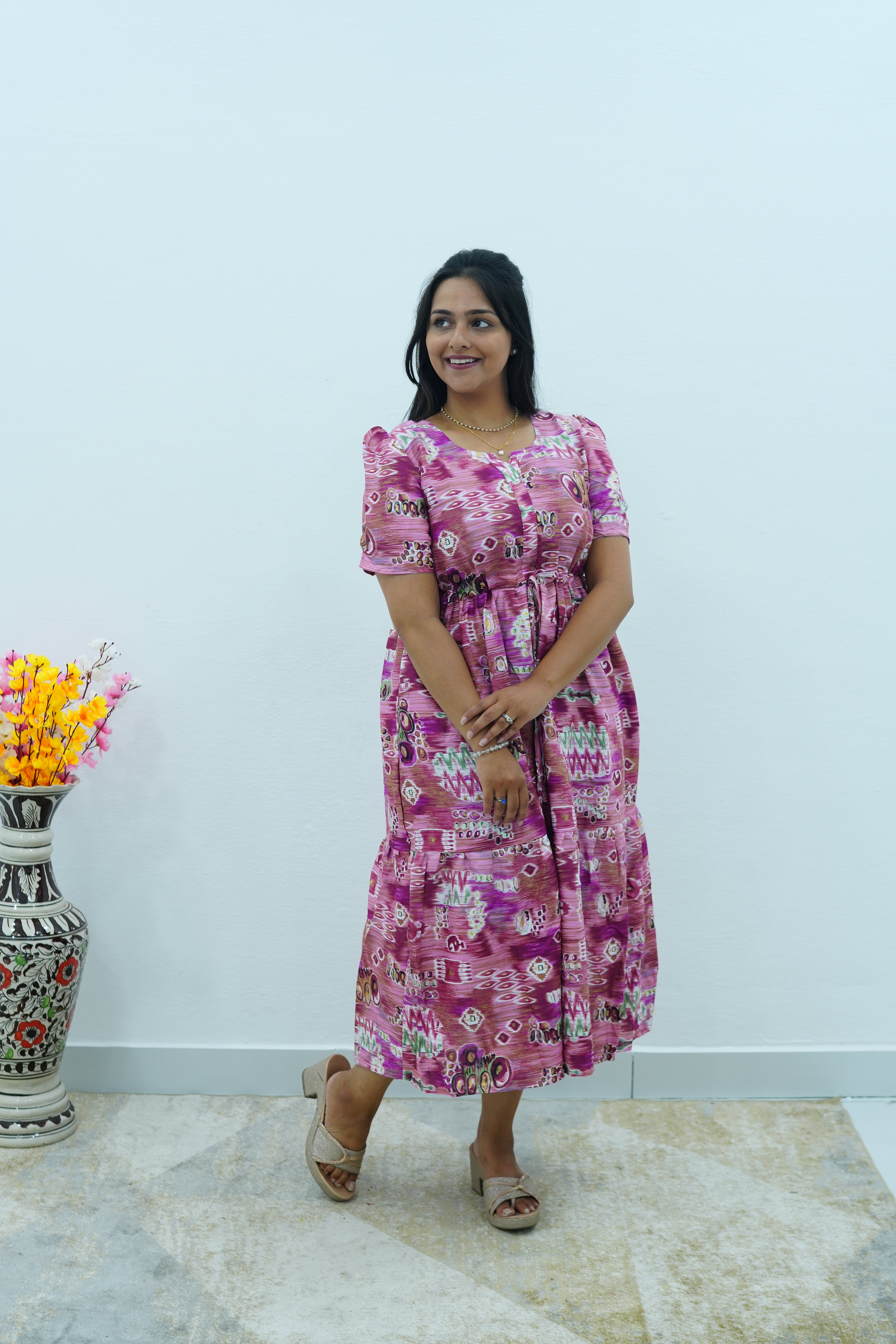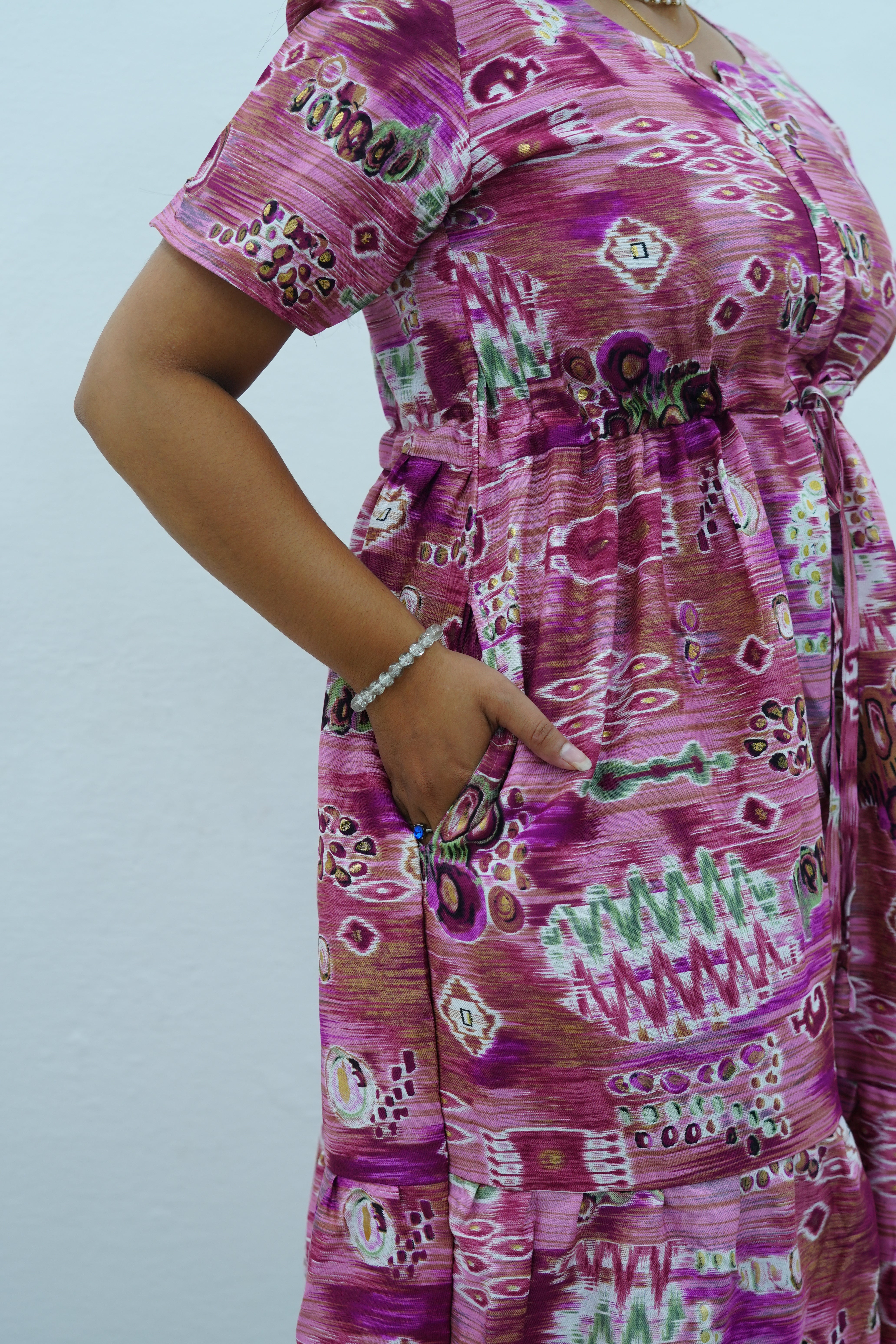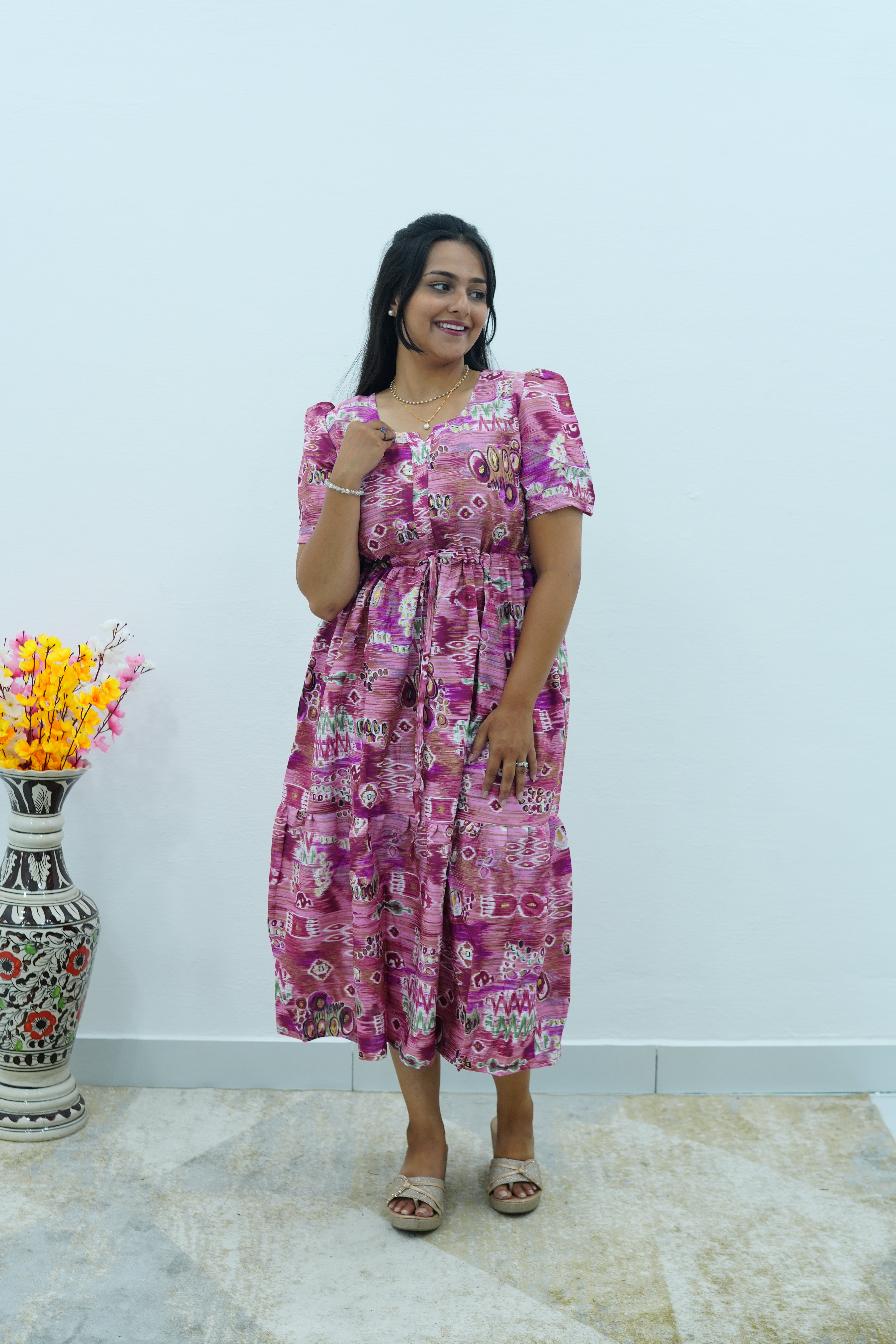 Magenta Geometric Printed Rayon Foil Maxi Dress – Adjustable Drawstring Waist Frock with Puff Sleeves & Side Pockets - Lightweight Breathable Rayon MAXI Frock