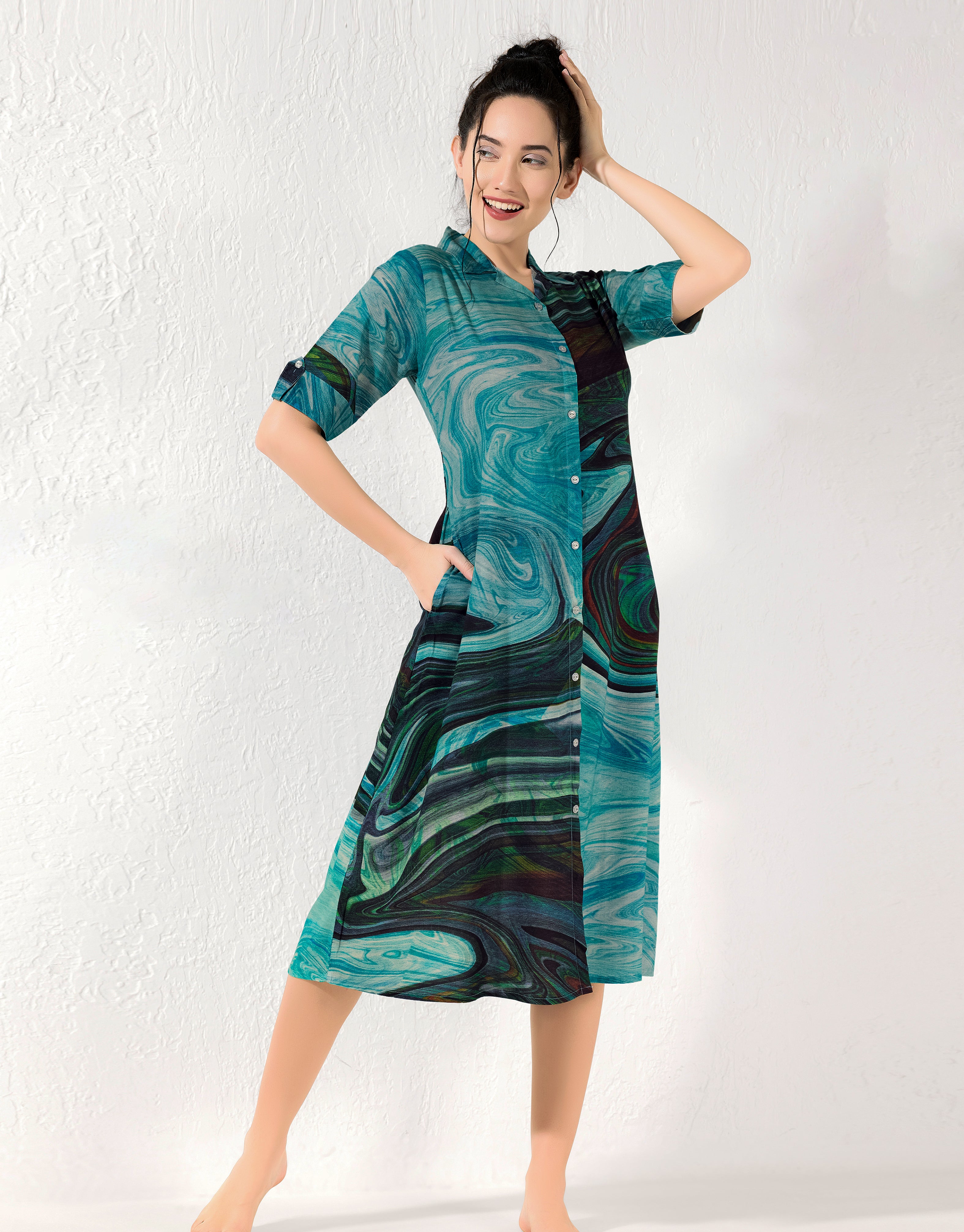 Style: New Collar MAXI Nighty (indicating a long, full-length nightgown with a collared neckline).