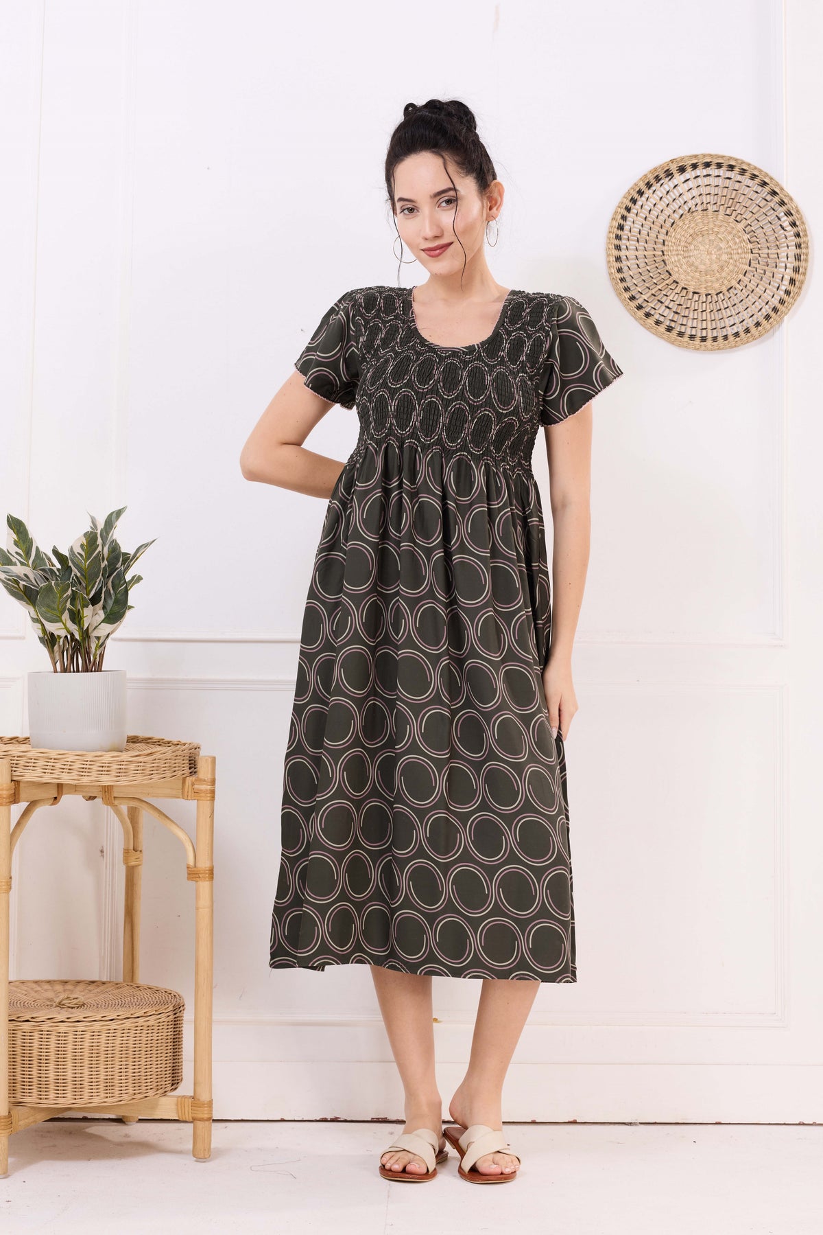 MANGAI Premium Rayon MAXI Frock Smocking Night Gown | Stretchable & Comfort Fit | Fancy Pleated Style with Side Pocket | Round Neck Nightwear for Stylish Women (SRM)