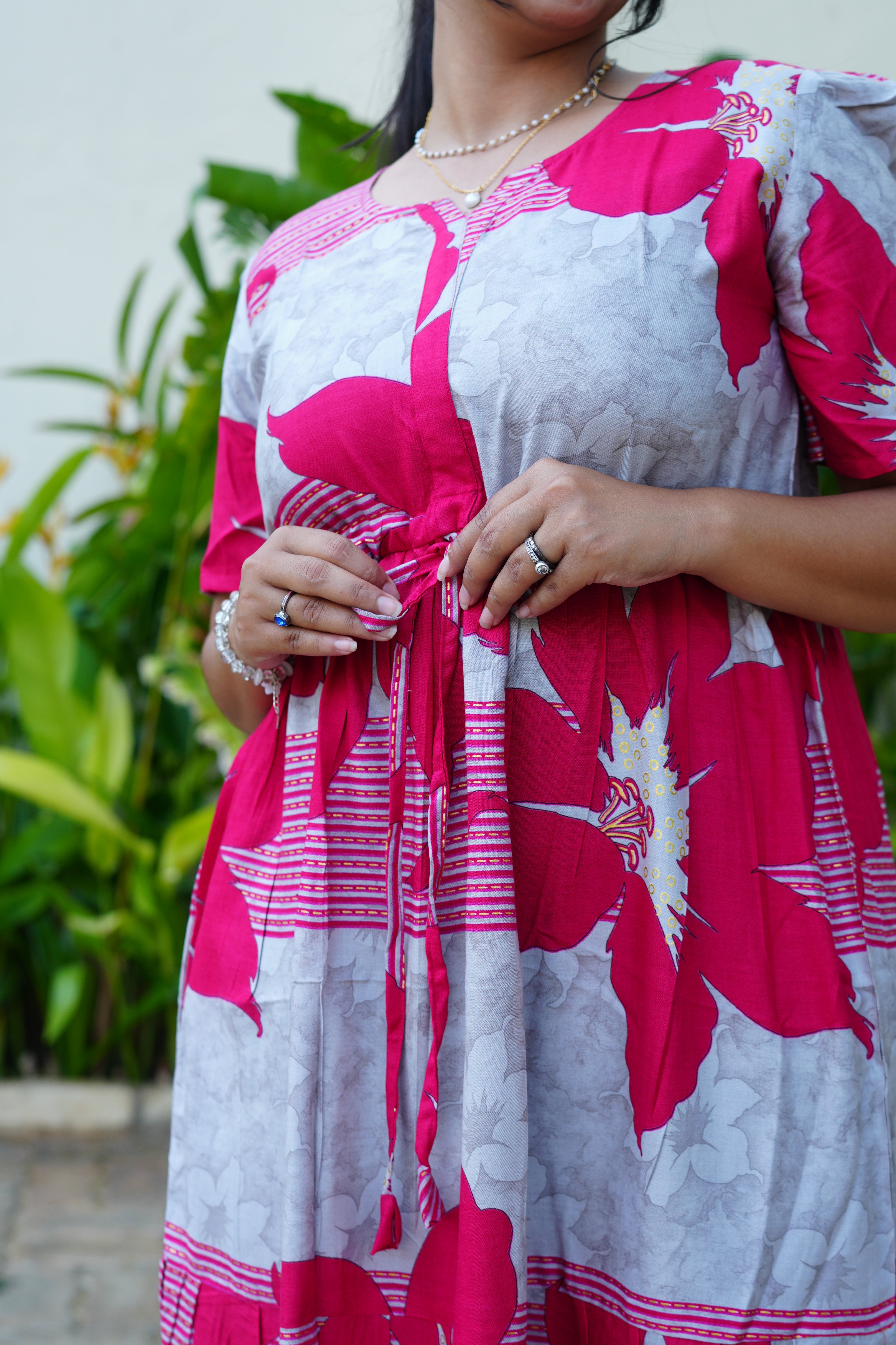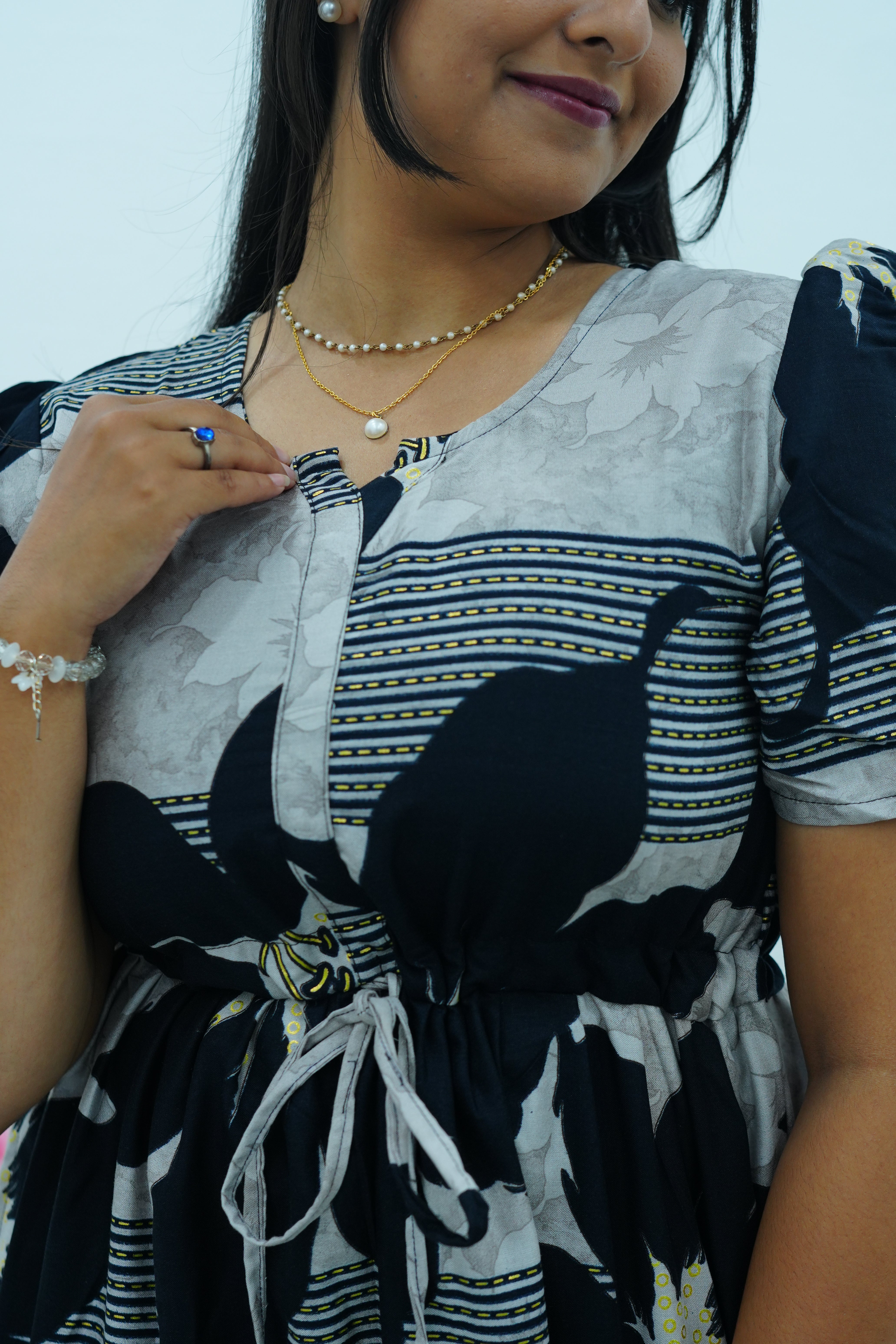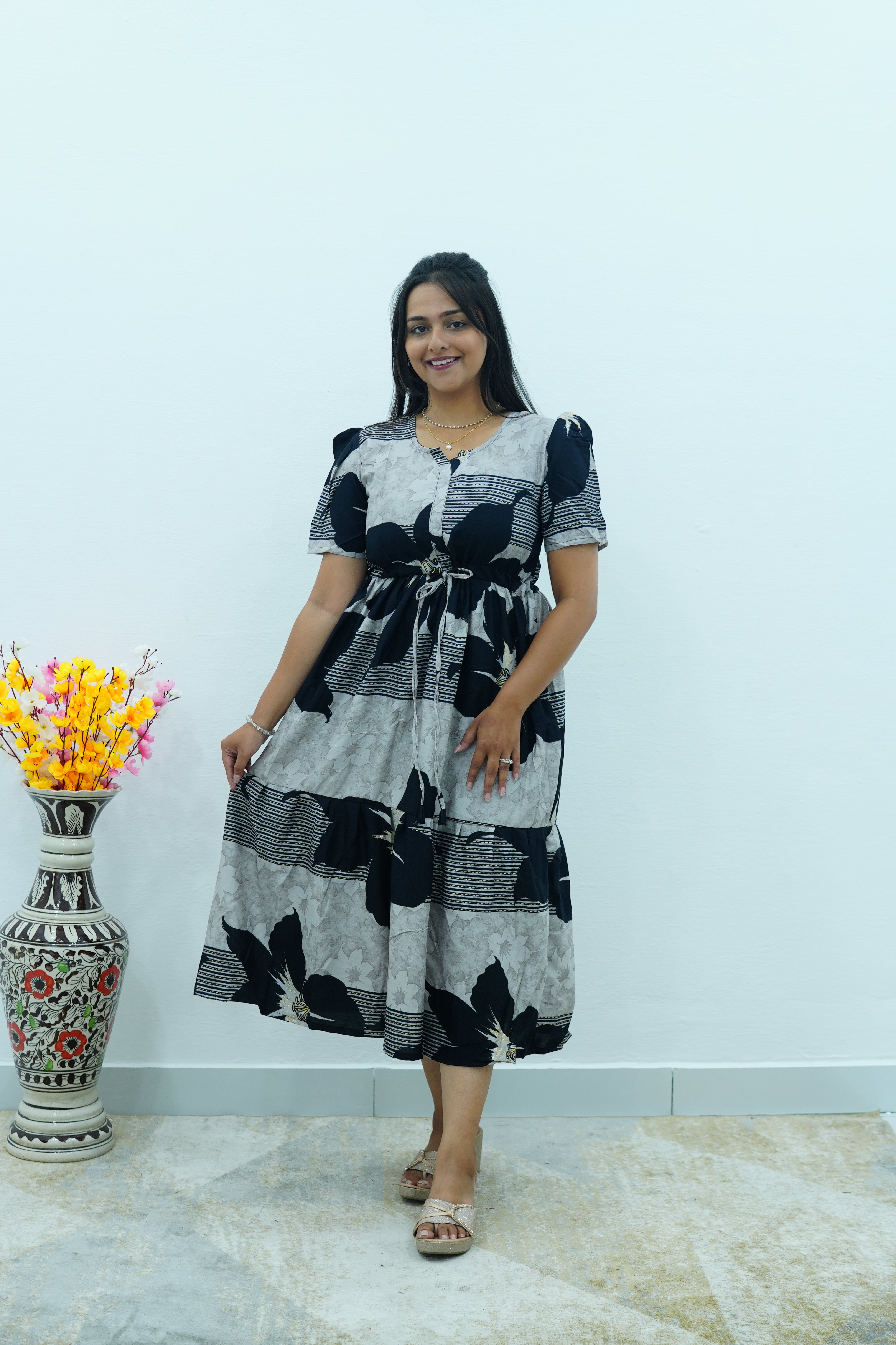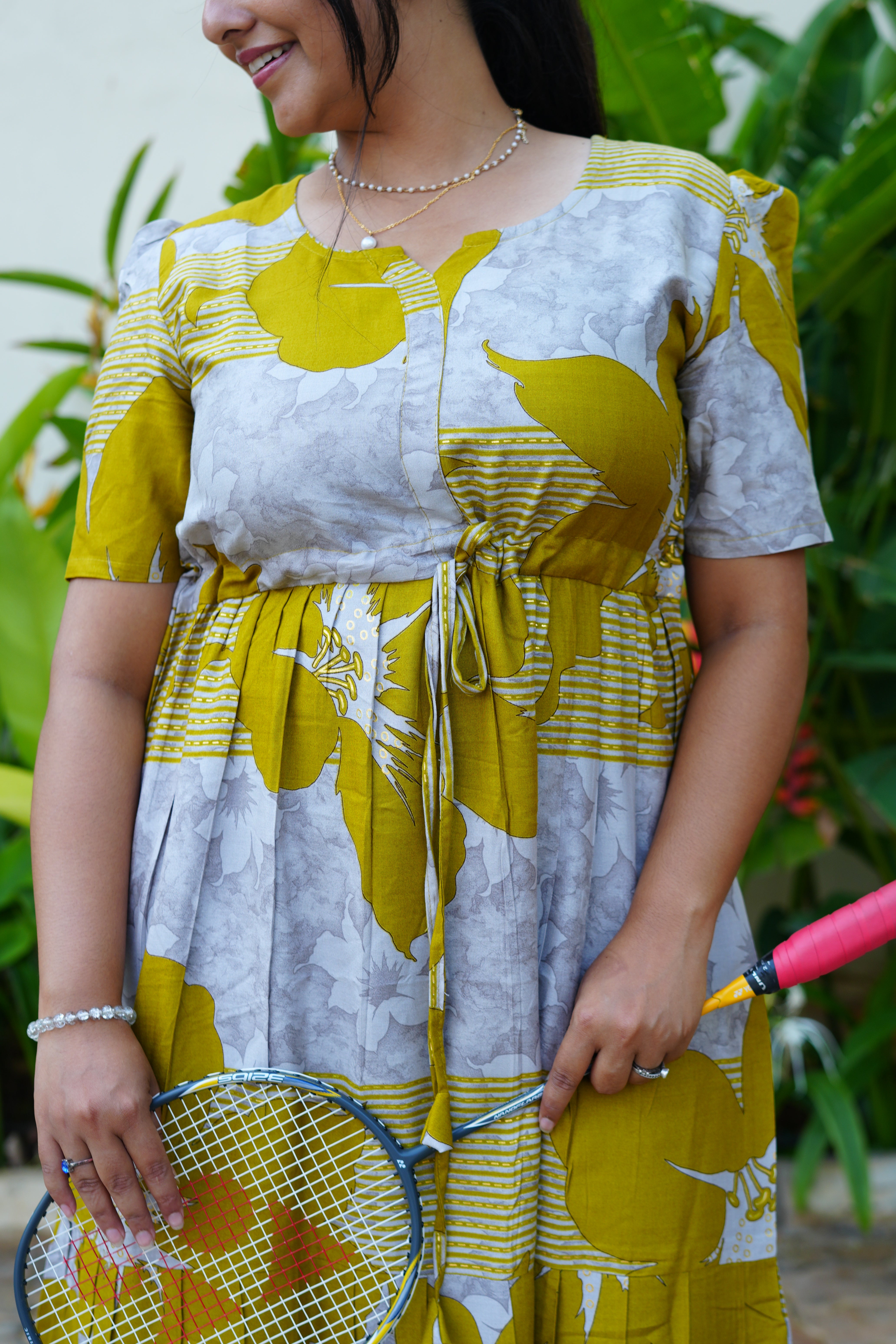 Mustard & Slate Grey Bold Botanical Rayon Foil Maxi Frock – Designer Puff Sleeve Tiered Dress with Adjustable Waist & Pockets