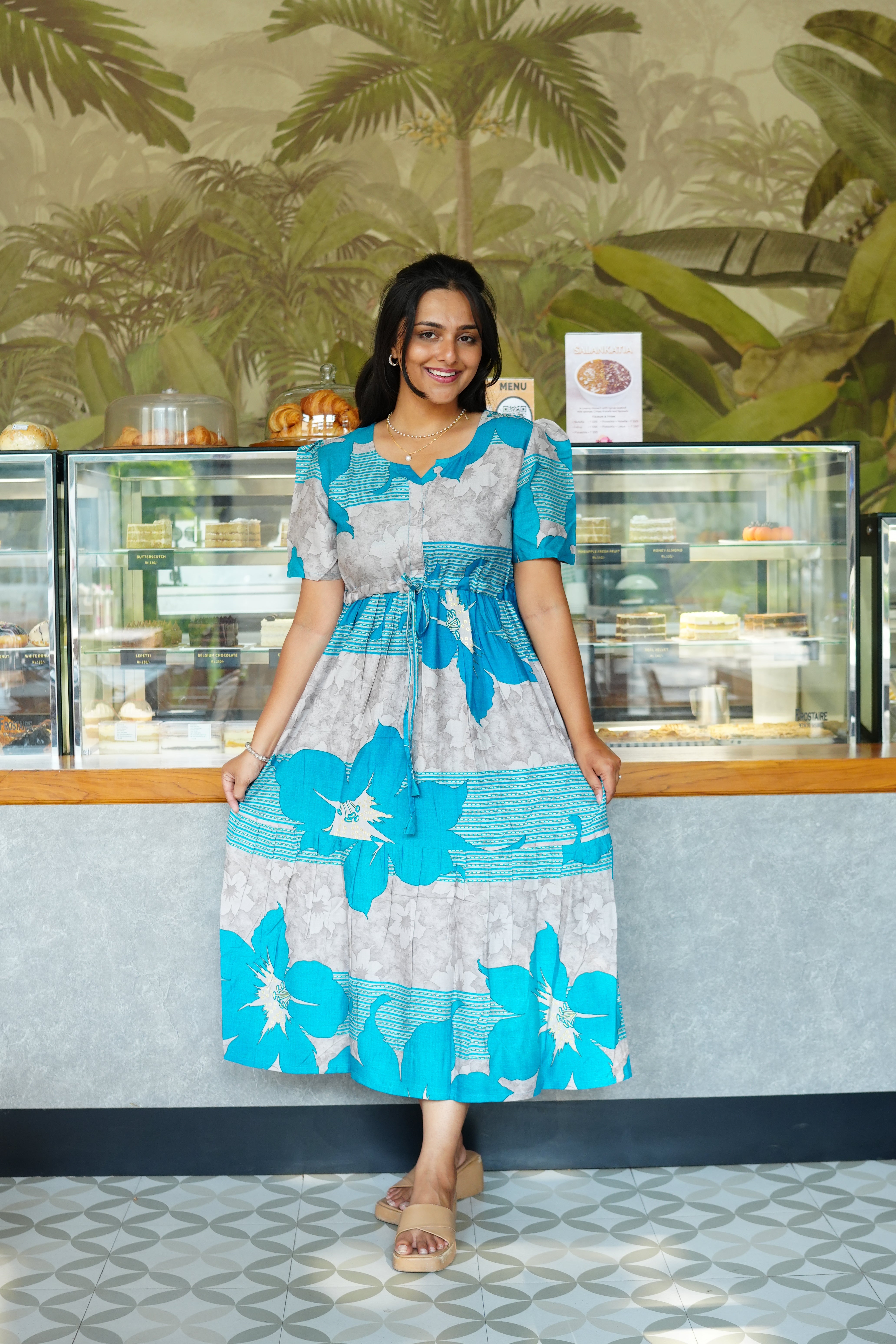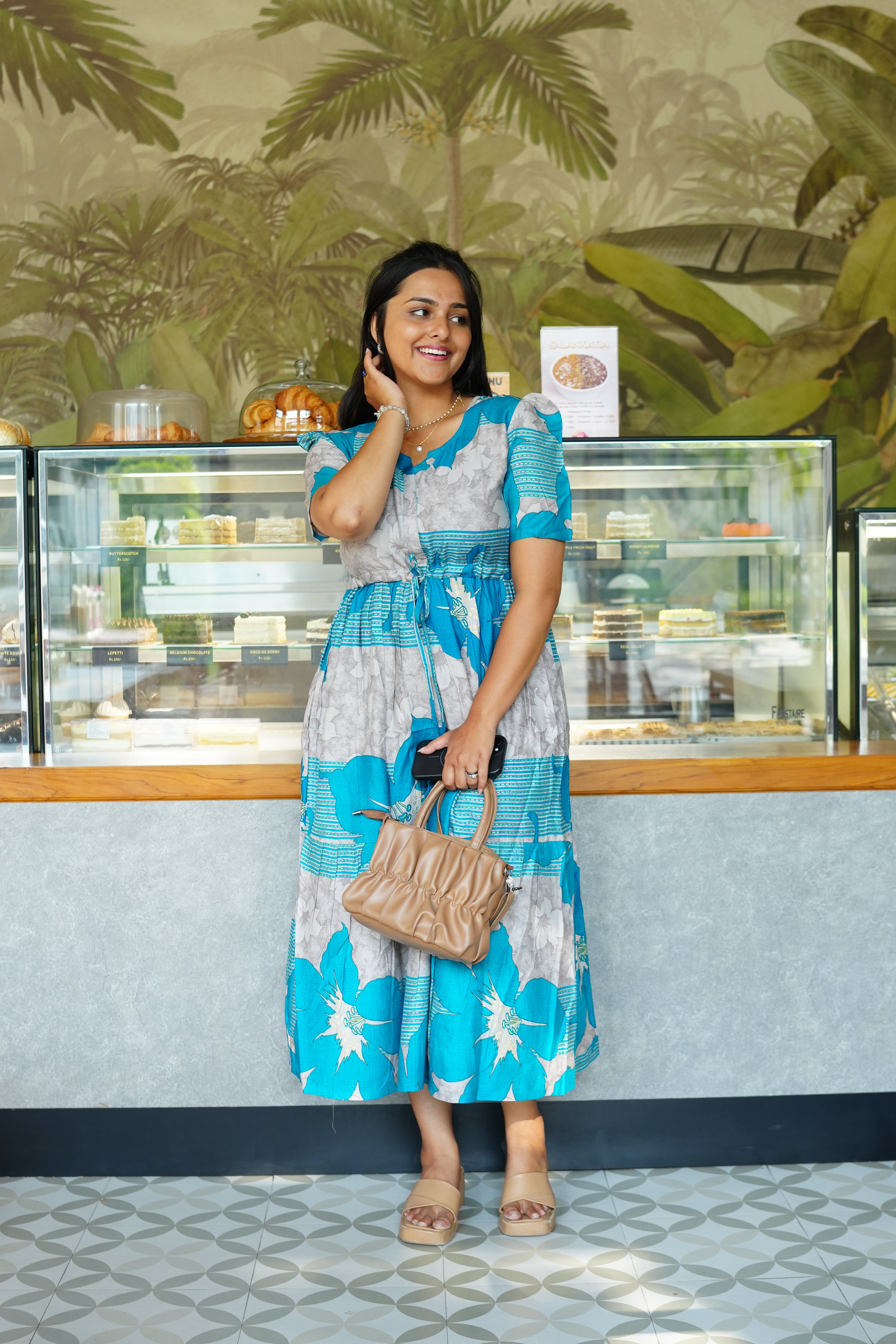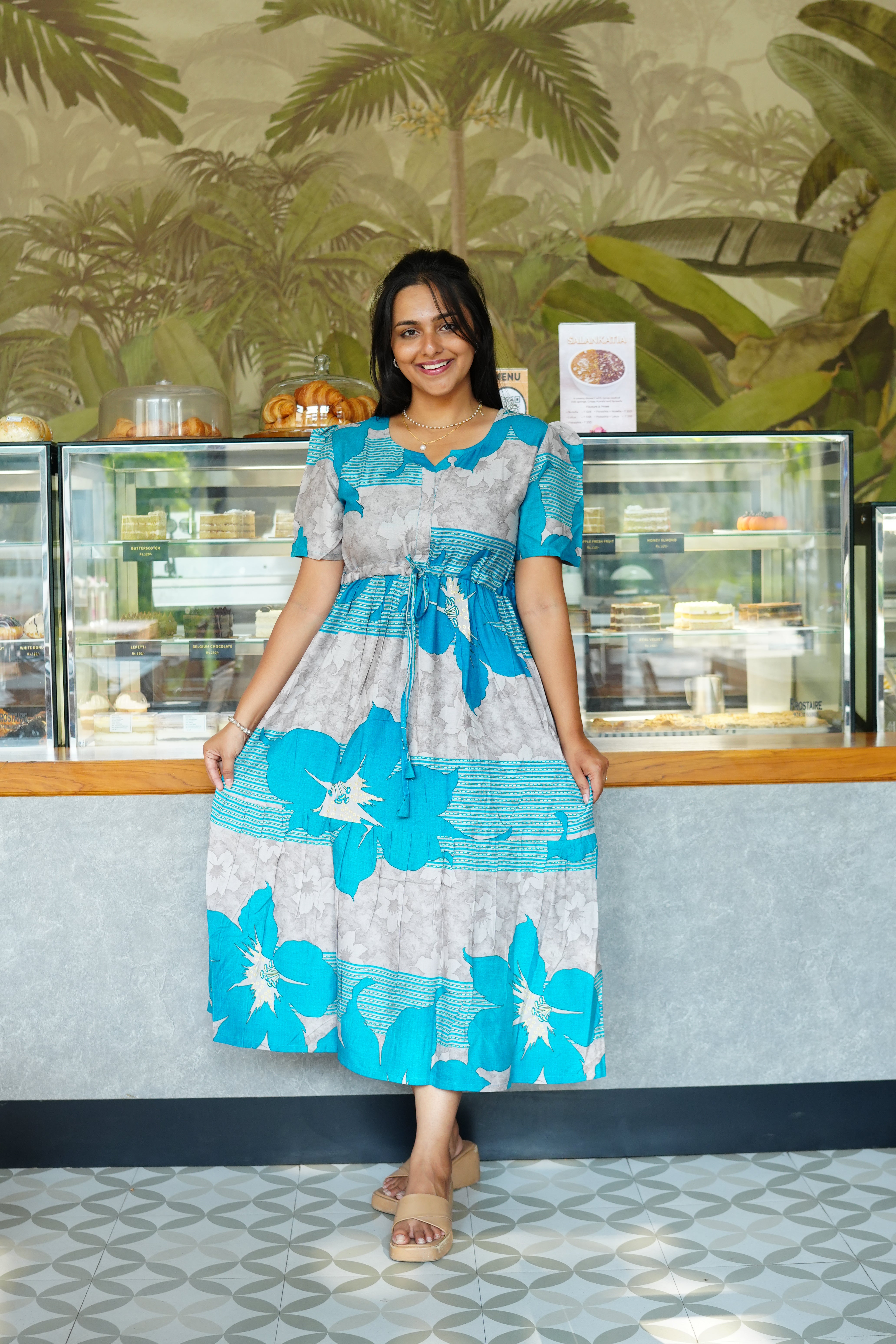 Redefine your summer style with this Mustard & Slate Grey Botanical Maxi Frock. Designed for the woman who appreciates modern art and effortless fashion, this dress features high-contrast florals and a premium foil-printed finish that radiates elegance.