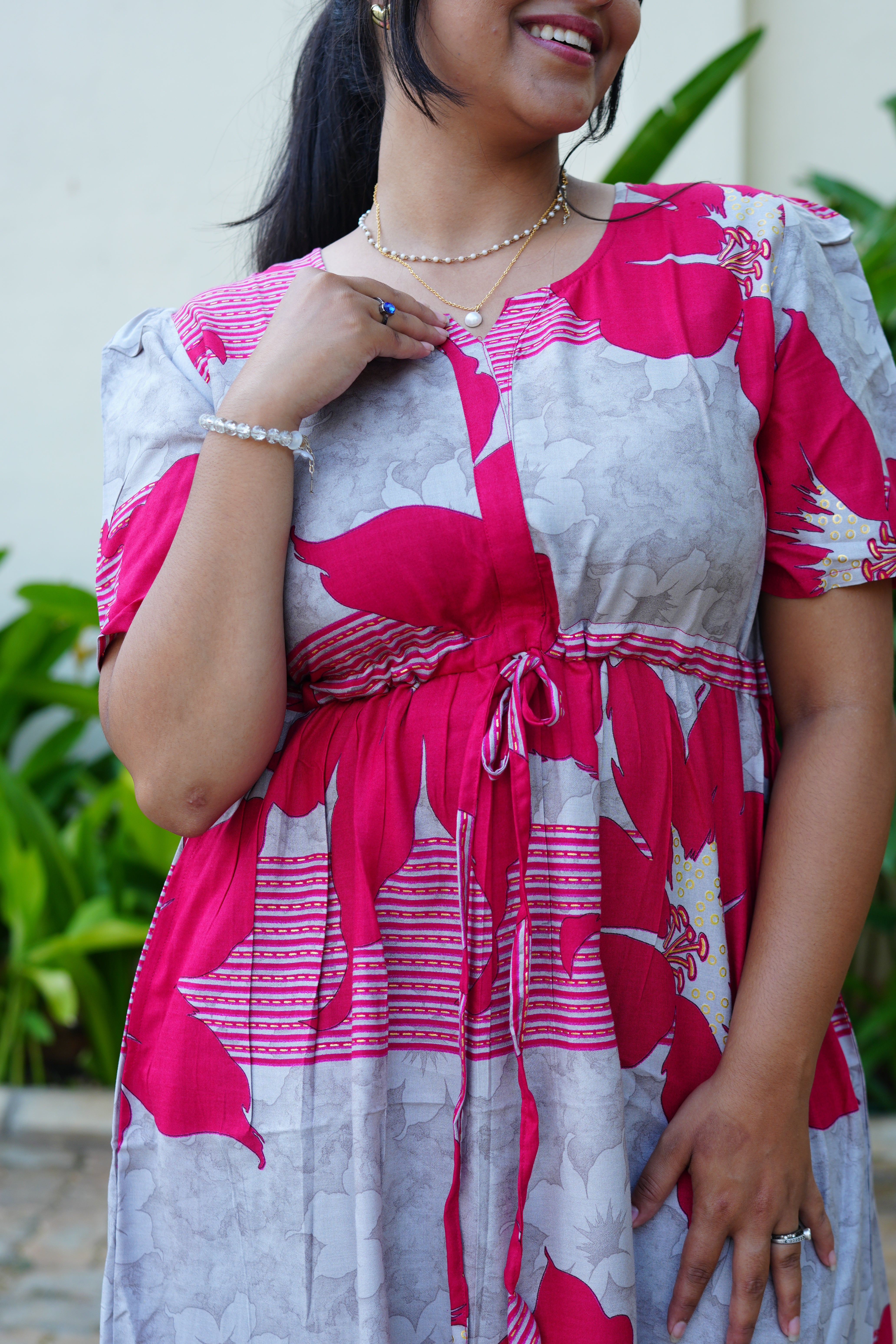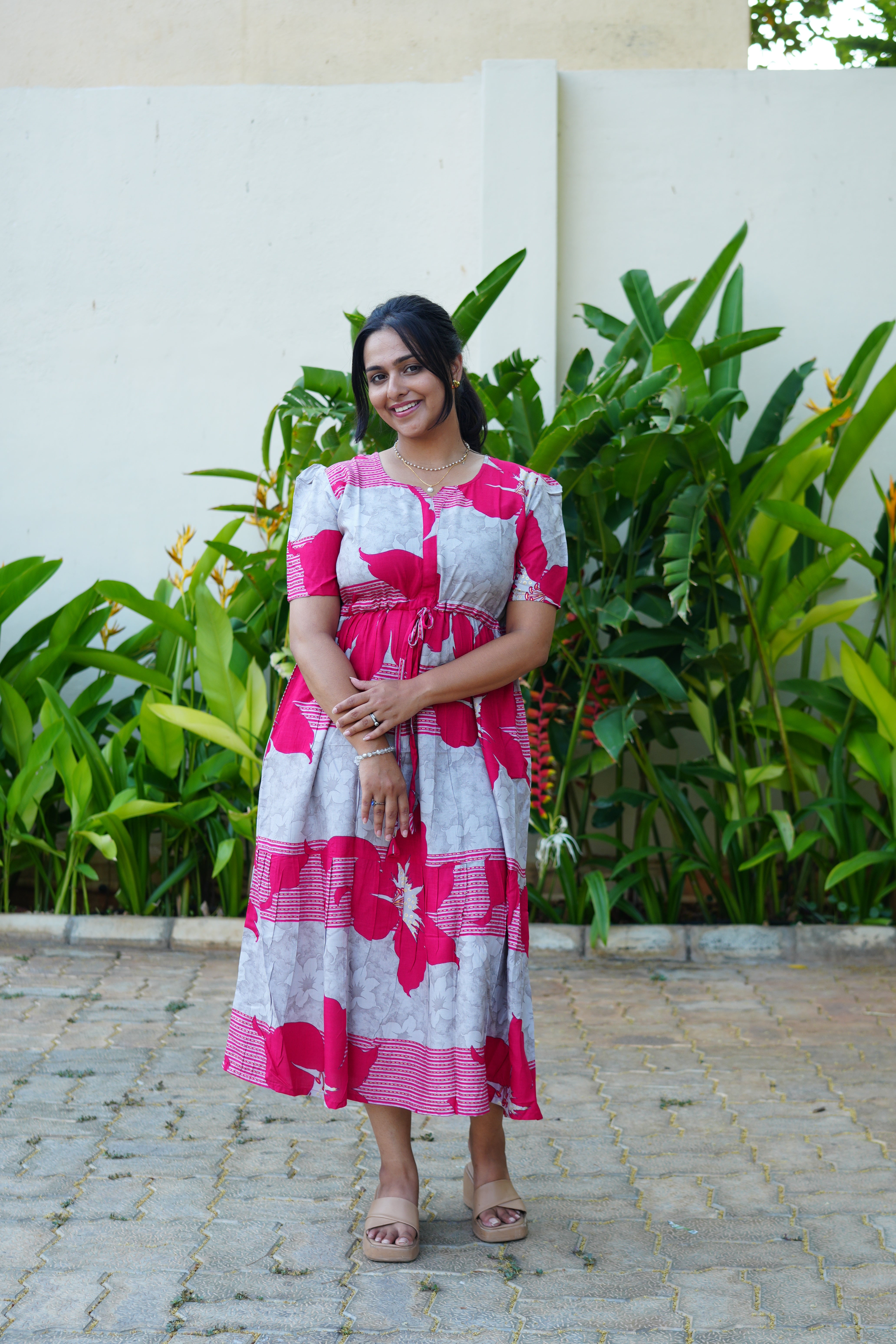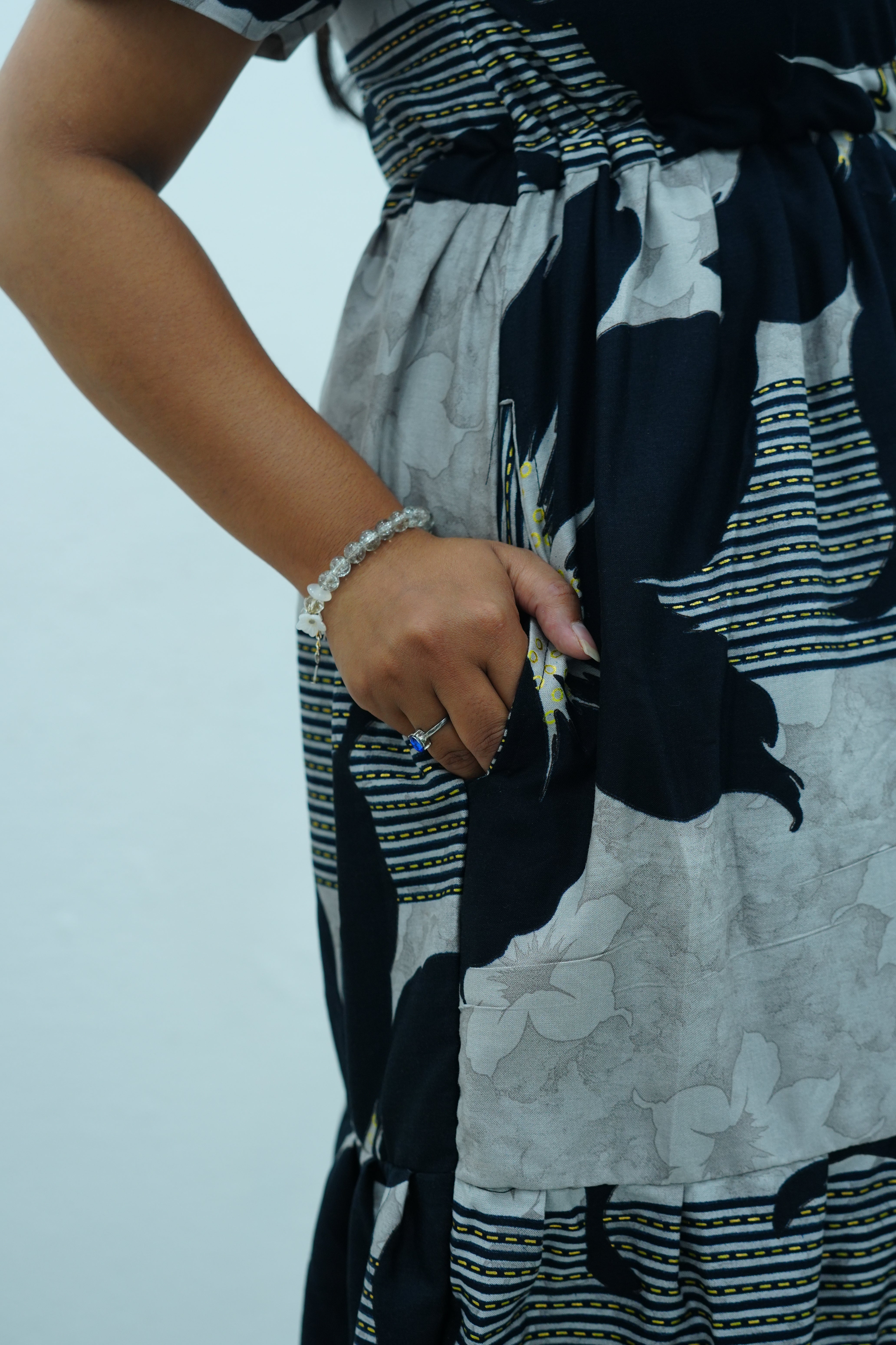 Redefine your summer style with this Mustard & Slate Grey Botanical Maxi Frock. Designed for the woman who appreciates modern art and effortless fashion, this dress features high-contrast florals and a premium foil-printed finish that radiates elegance.