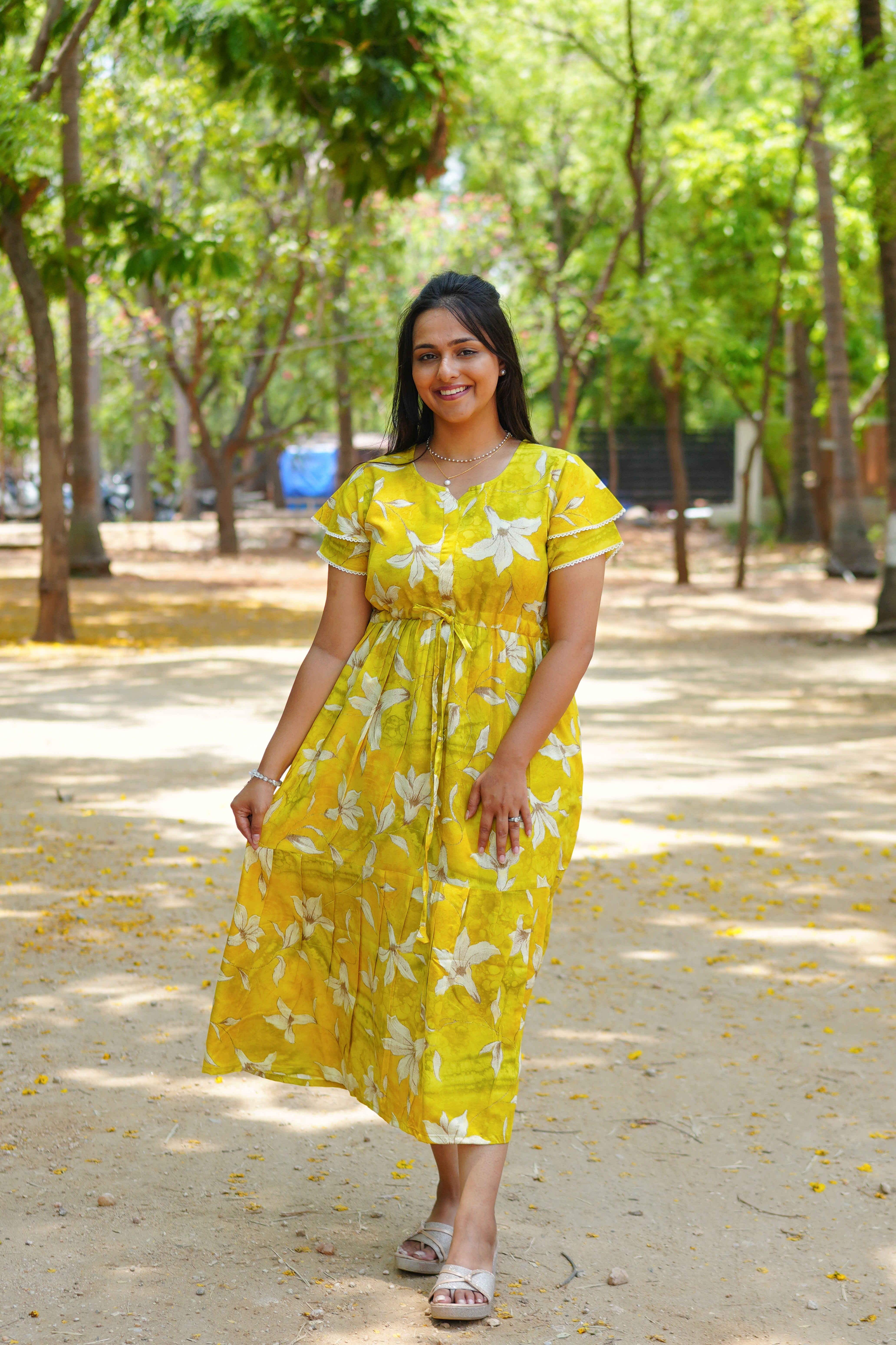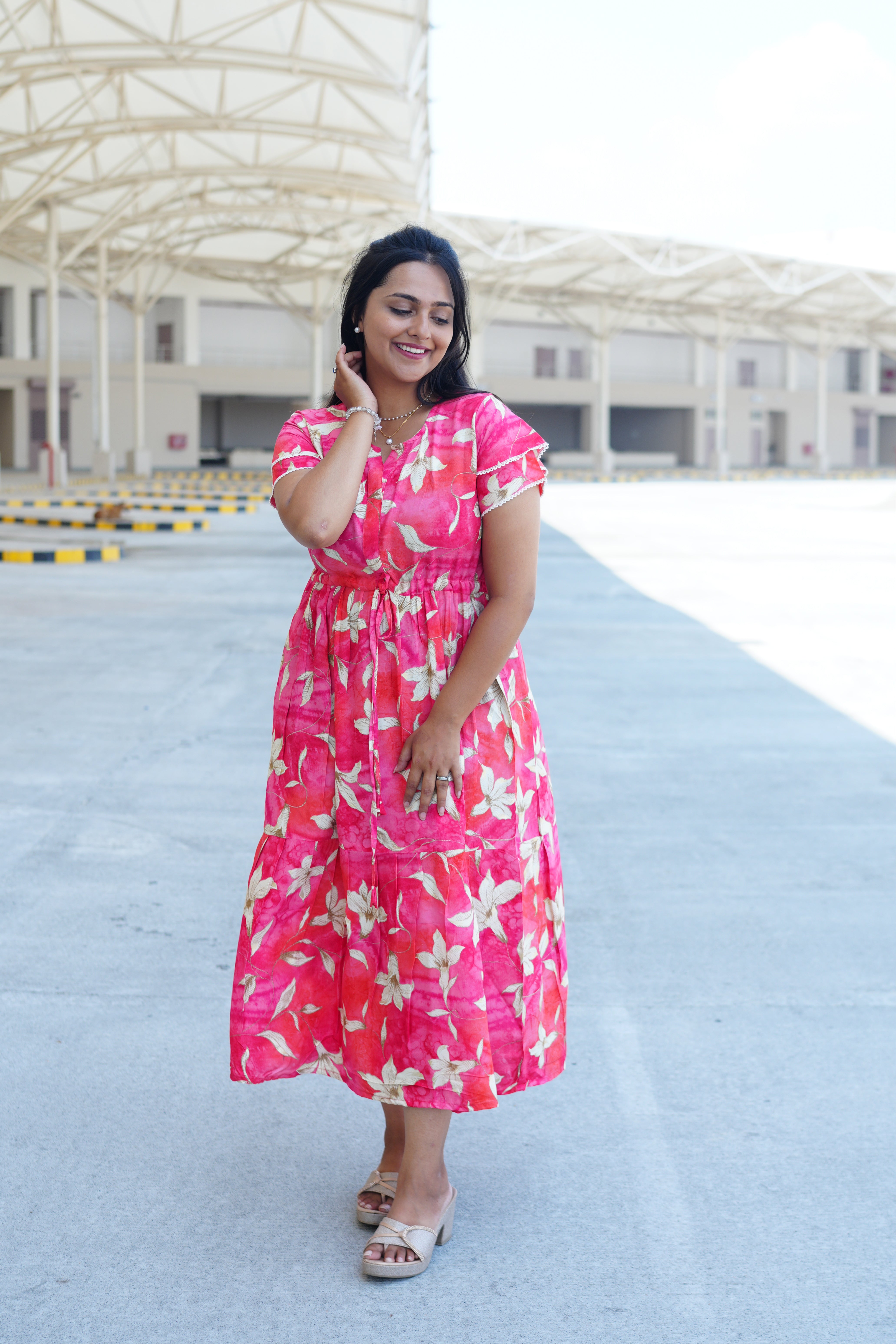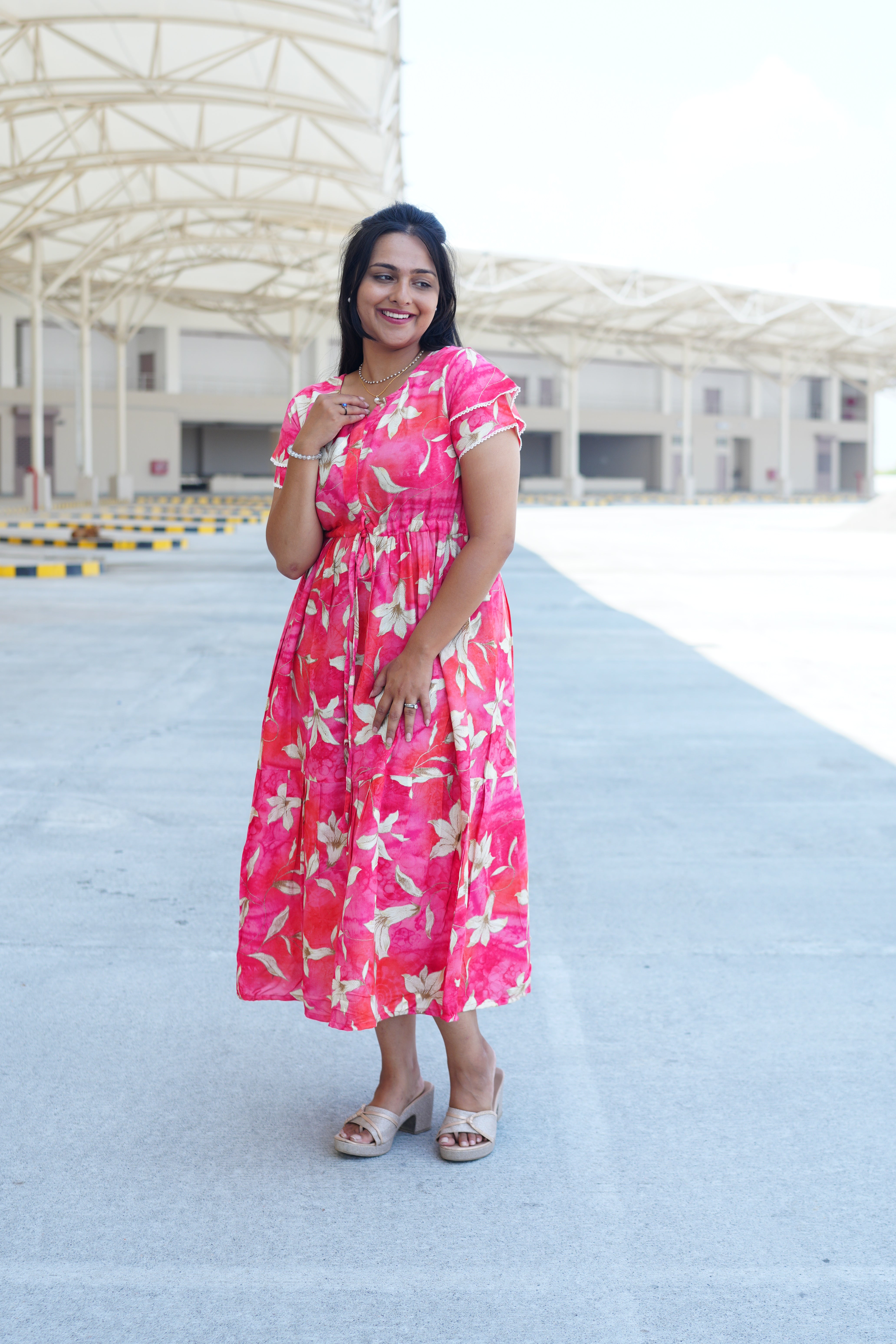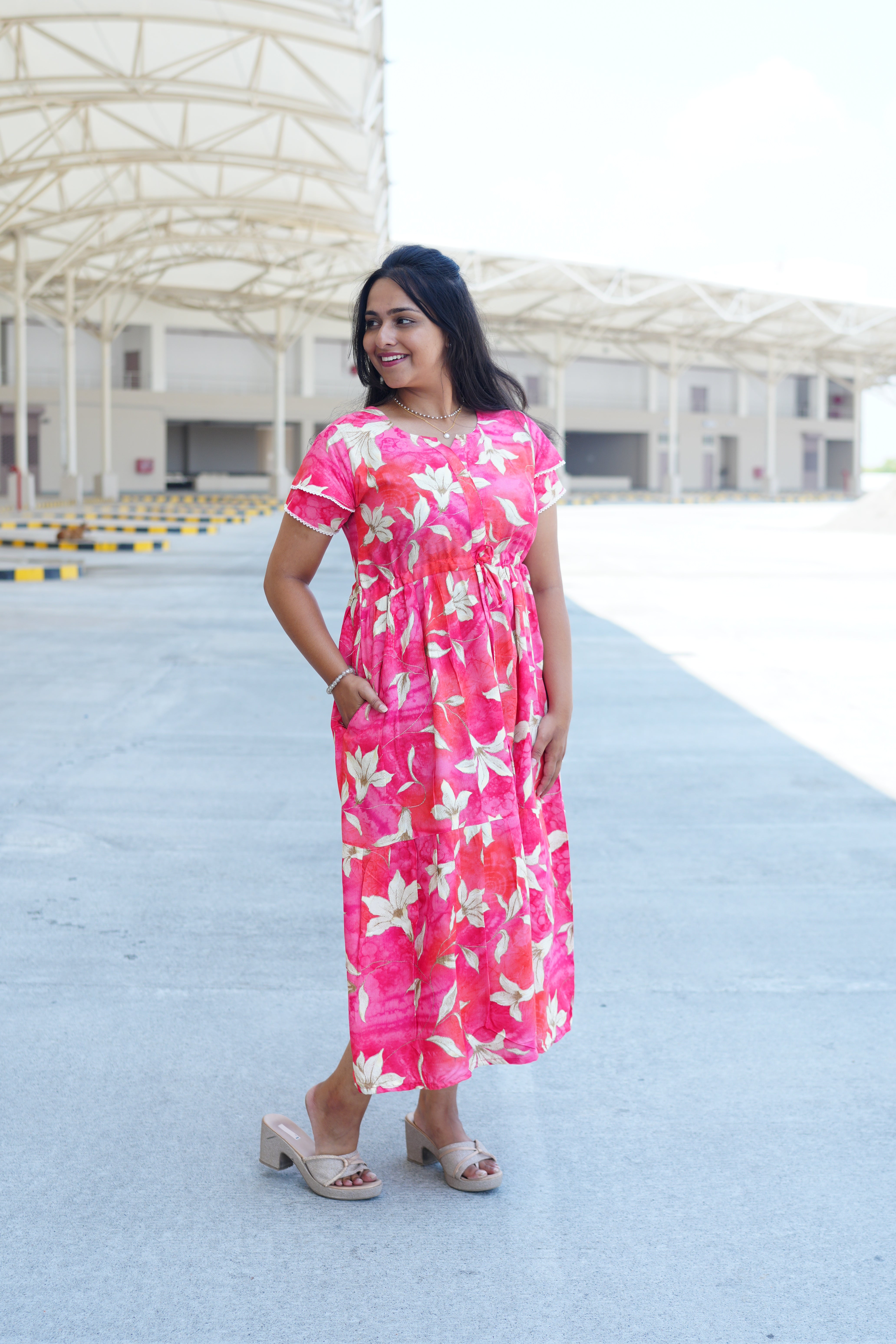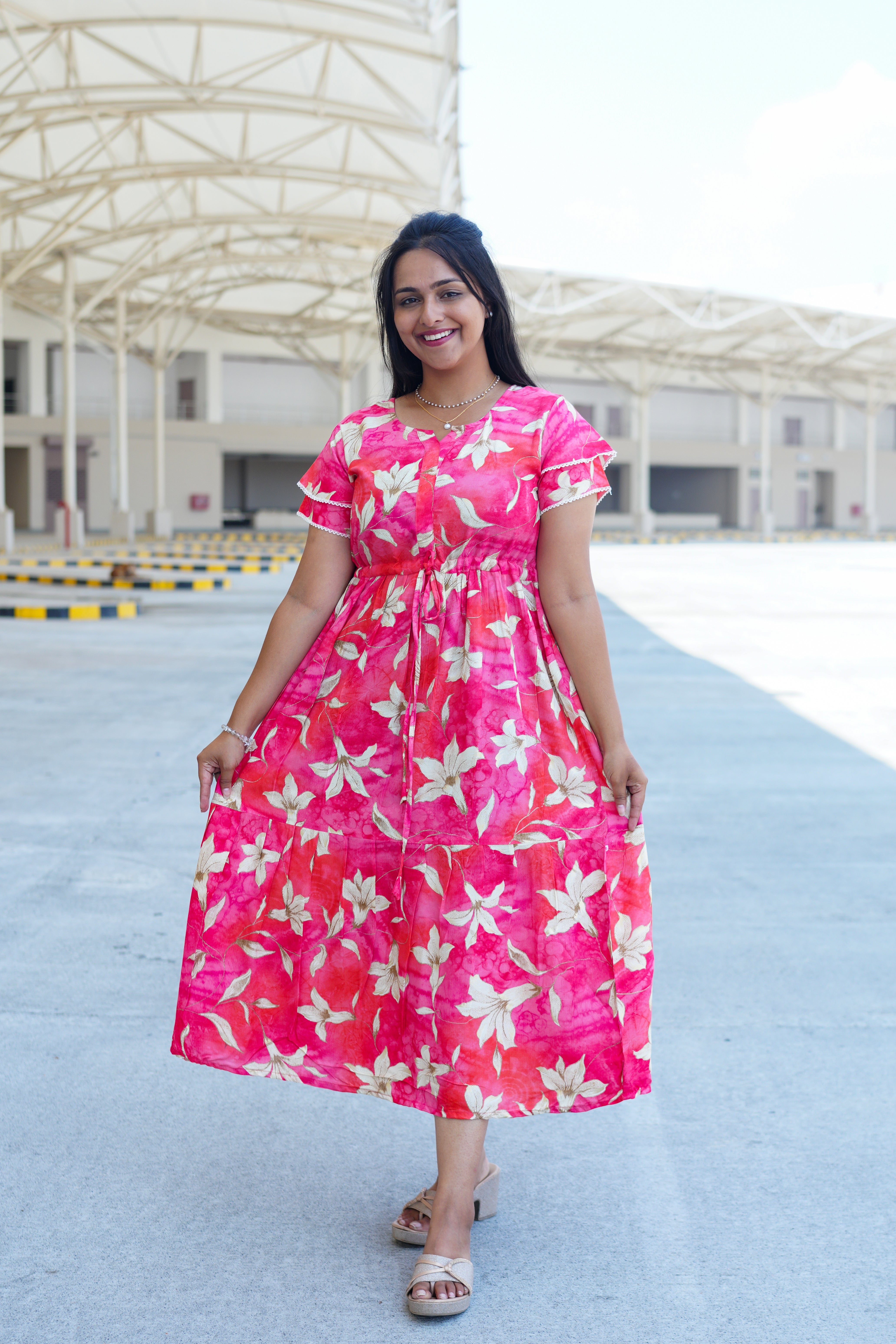 Radiant Fuchsia Lily Rayon Foil Maxi Frock – Butterfly Frill Sleeve Summer Dress with Adjustable Tie Waist & Pockets - Foil Embellished Design MAXI Frock