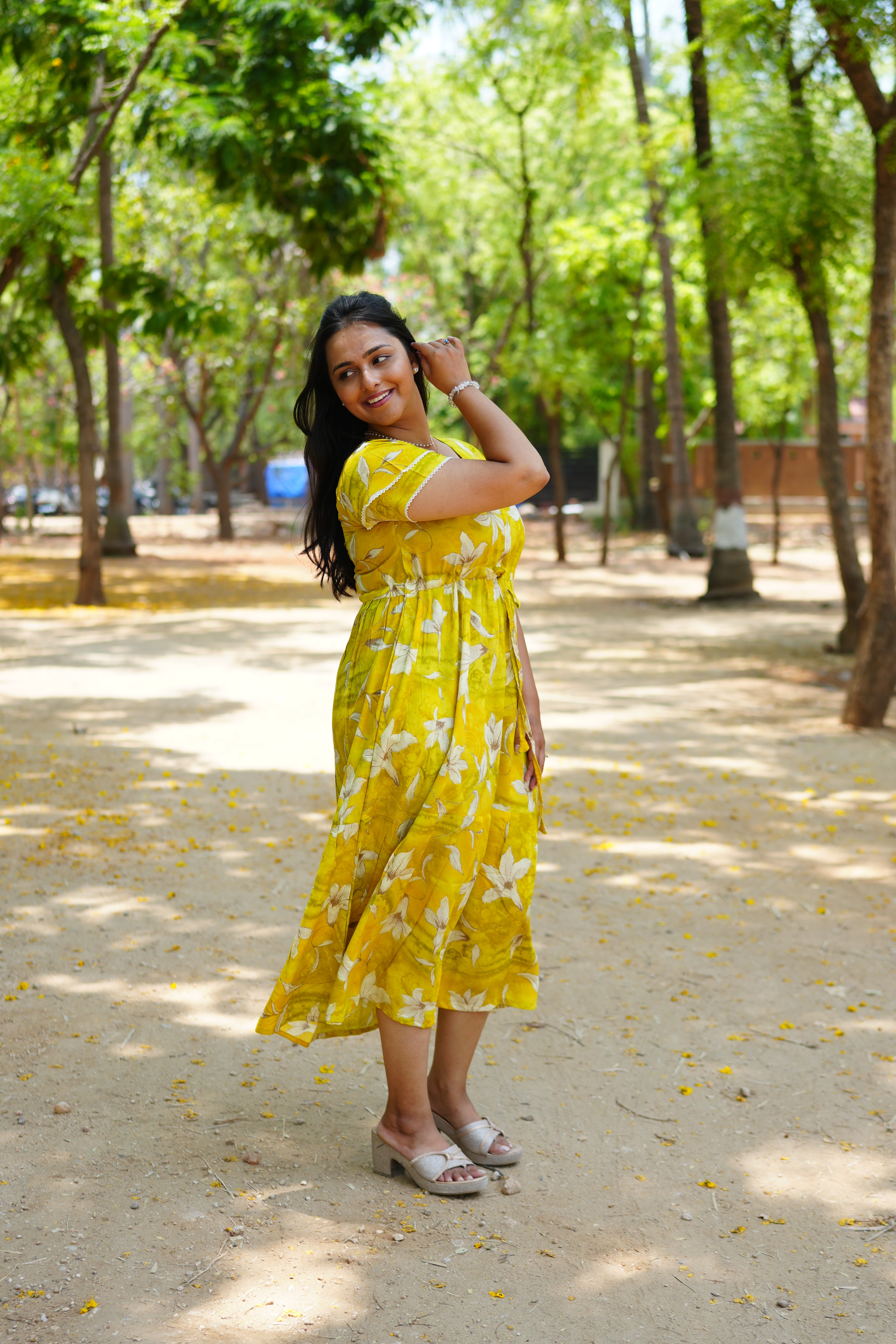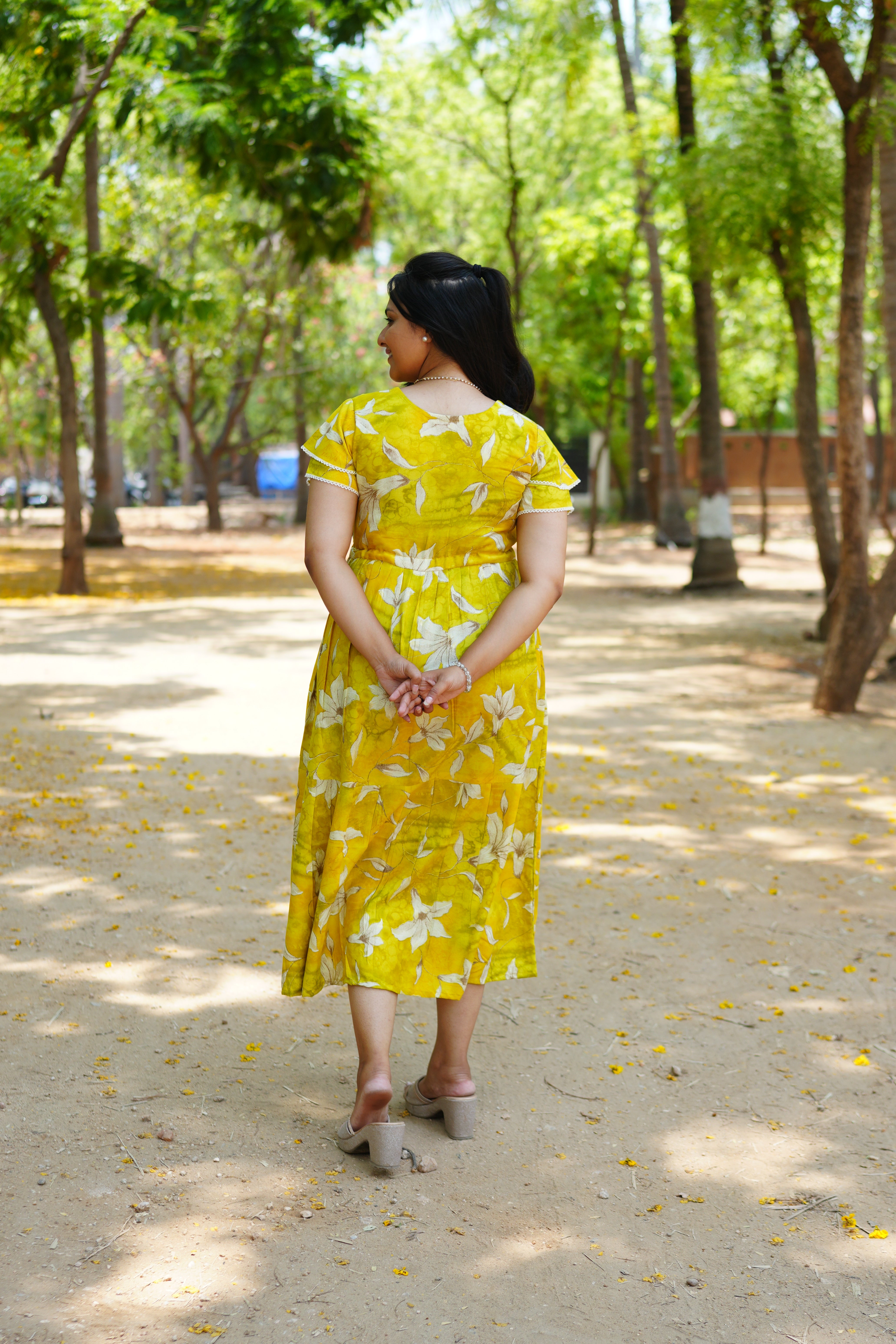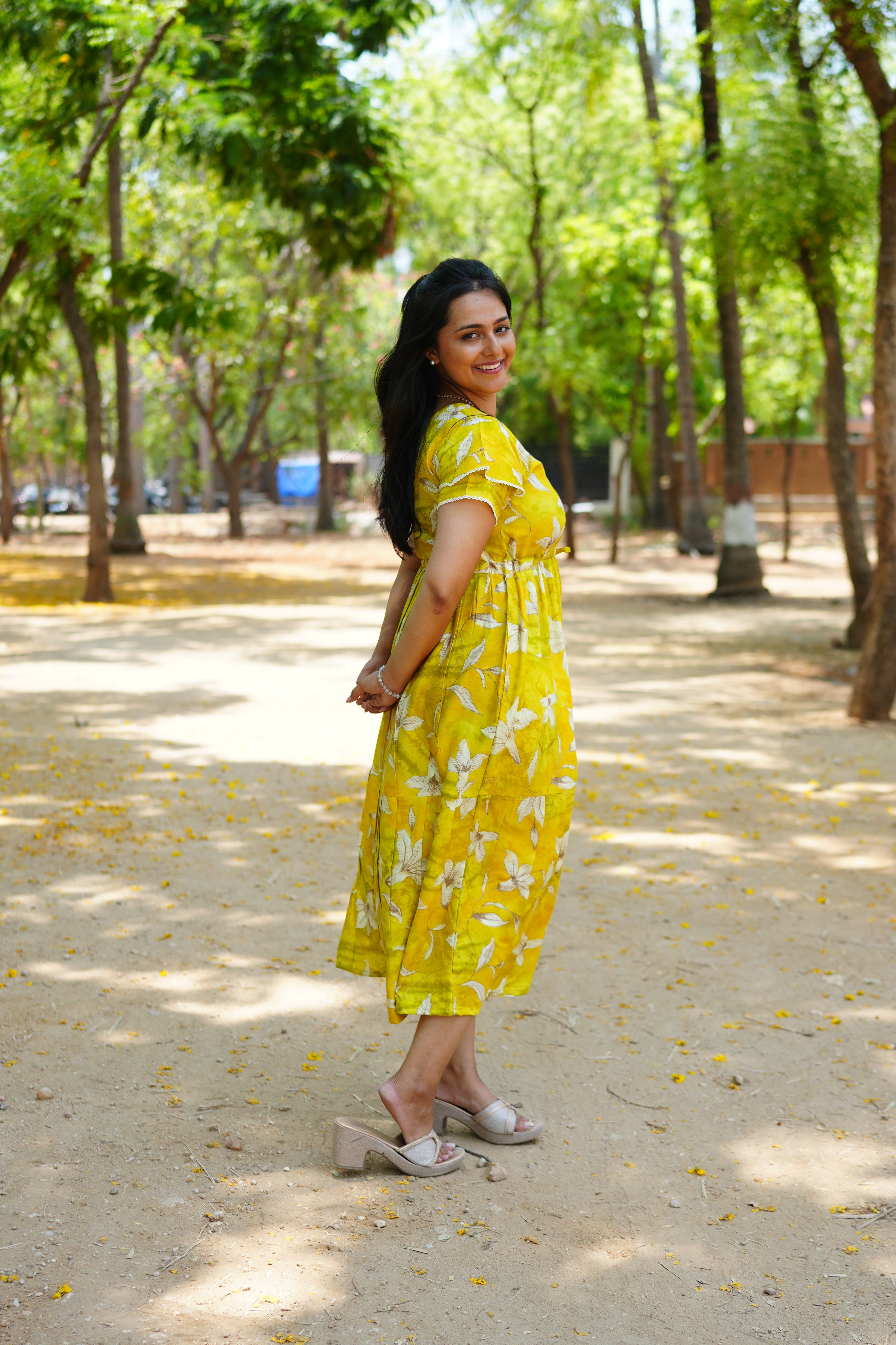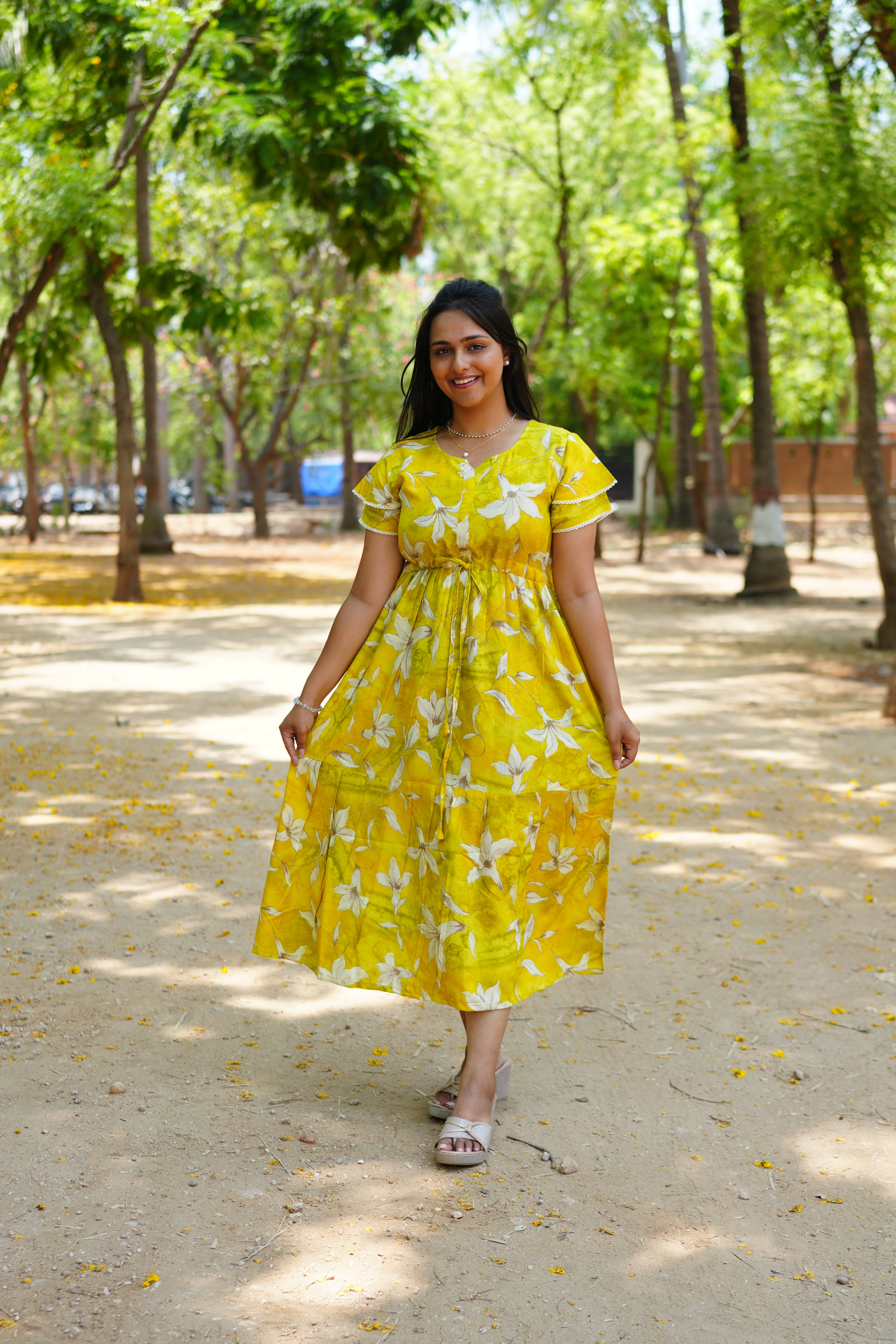 Tiered Gathering Skirt: The skirt features a tiered construction that provides a graceful, voluminous flare, making it ideal for everything from resort wear to afternoon socials.