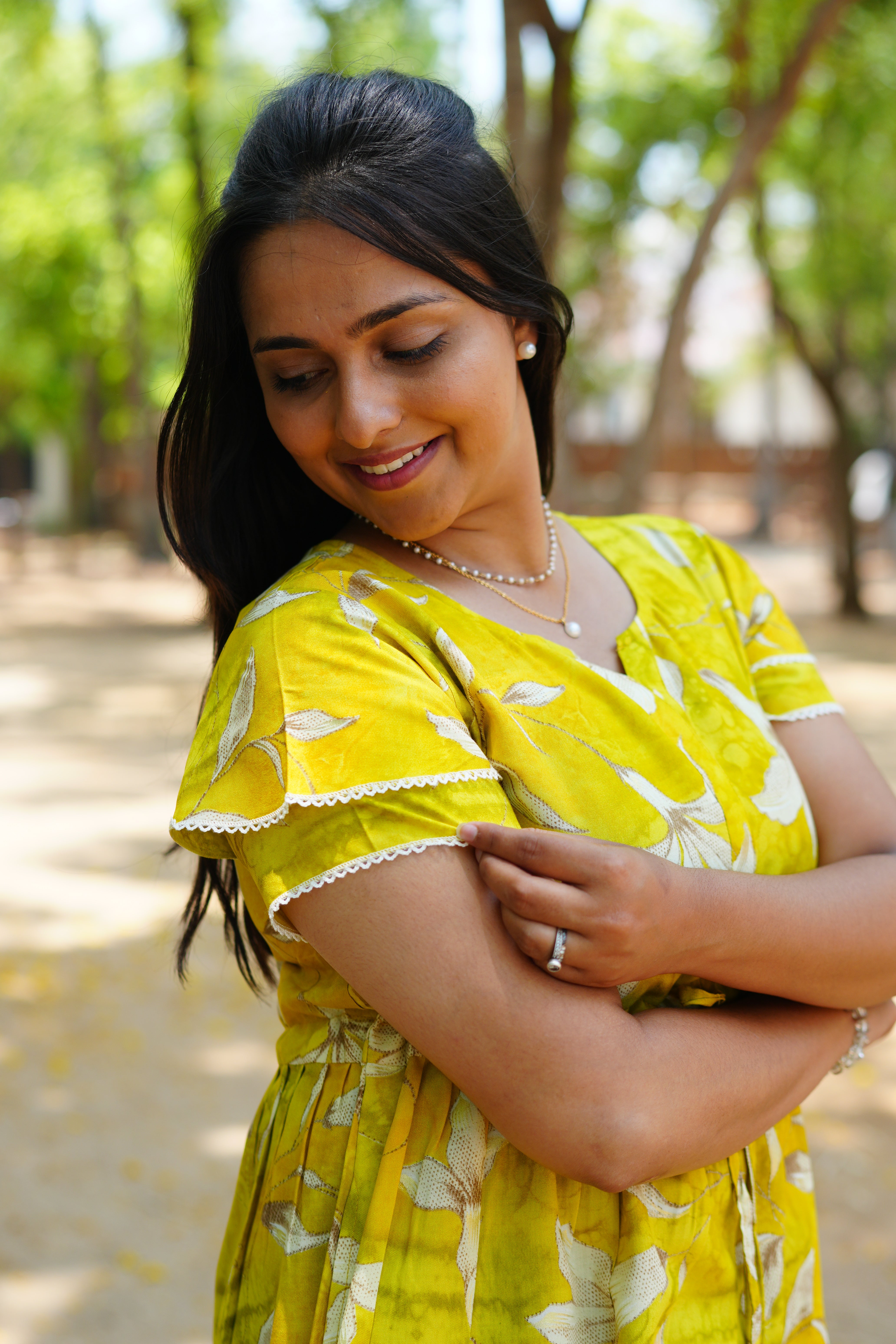 Everyday Convenience: Integrated side pockets provide functional utility without interrupting the flowing lines of the dress.