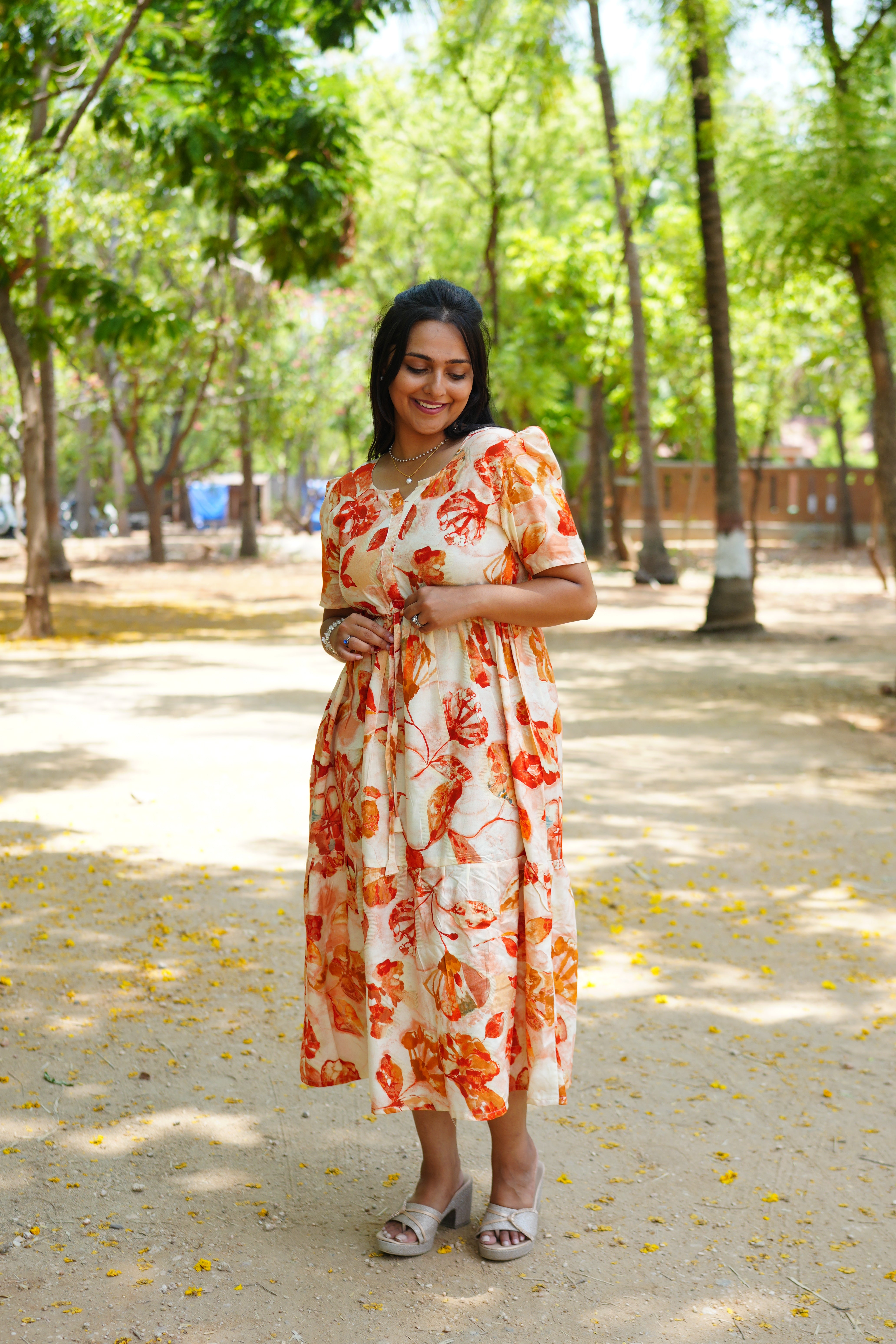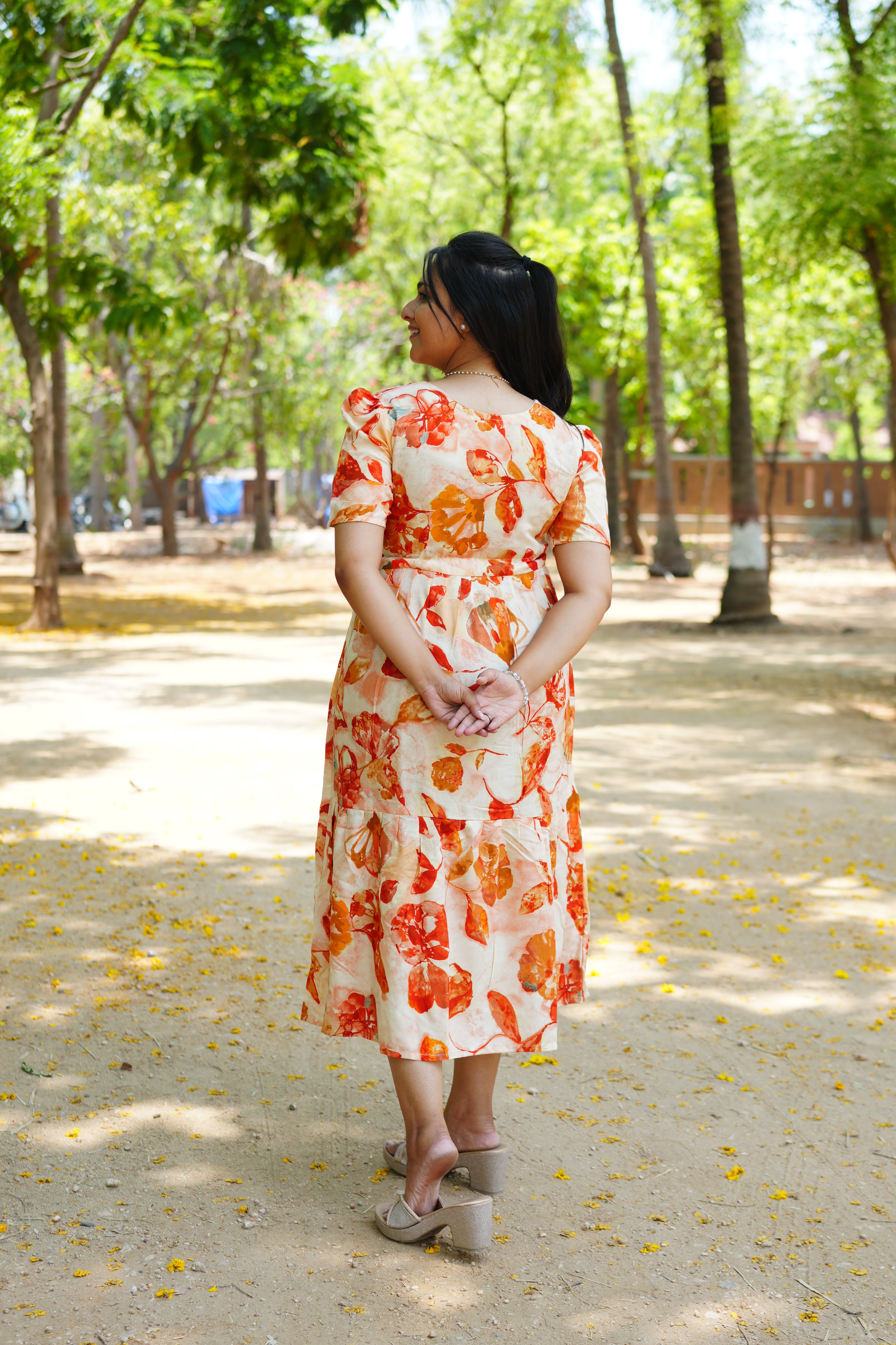 Stylish Details: Romantic puff sleeves add a touch of vintage charm, while the tiered "Gathering" skirt provides graceful movement.