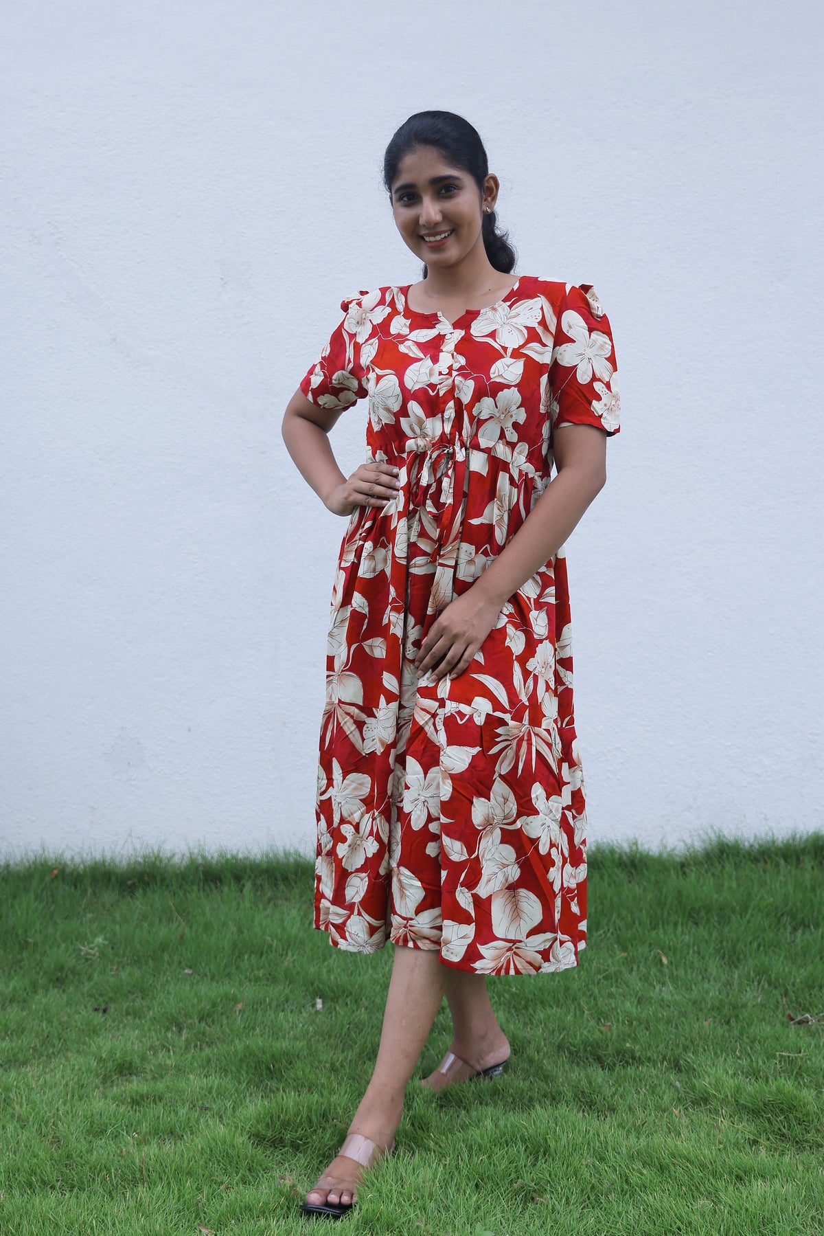 Rayon Colourful Foil Printing Gathering Frock Model Nighties | Side Pocket and Gathering Front Rope | Fancy Sleeve & Maxi Frock Nightwear for Stylish Women's (FGF)
