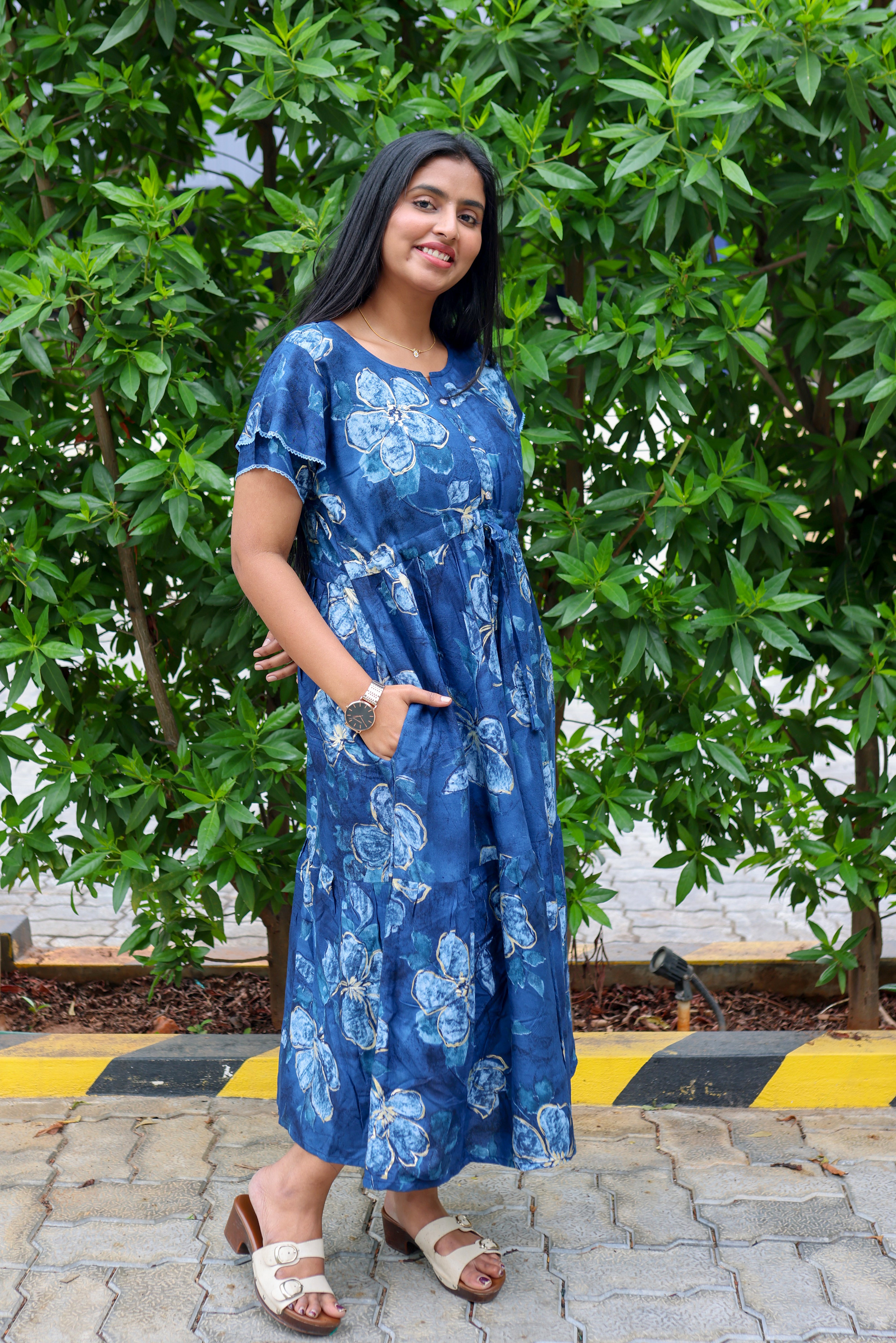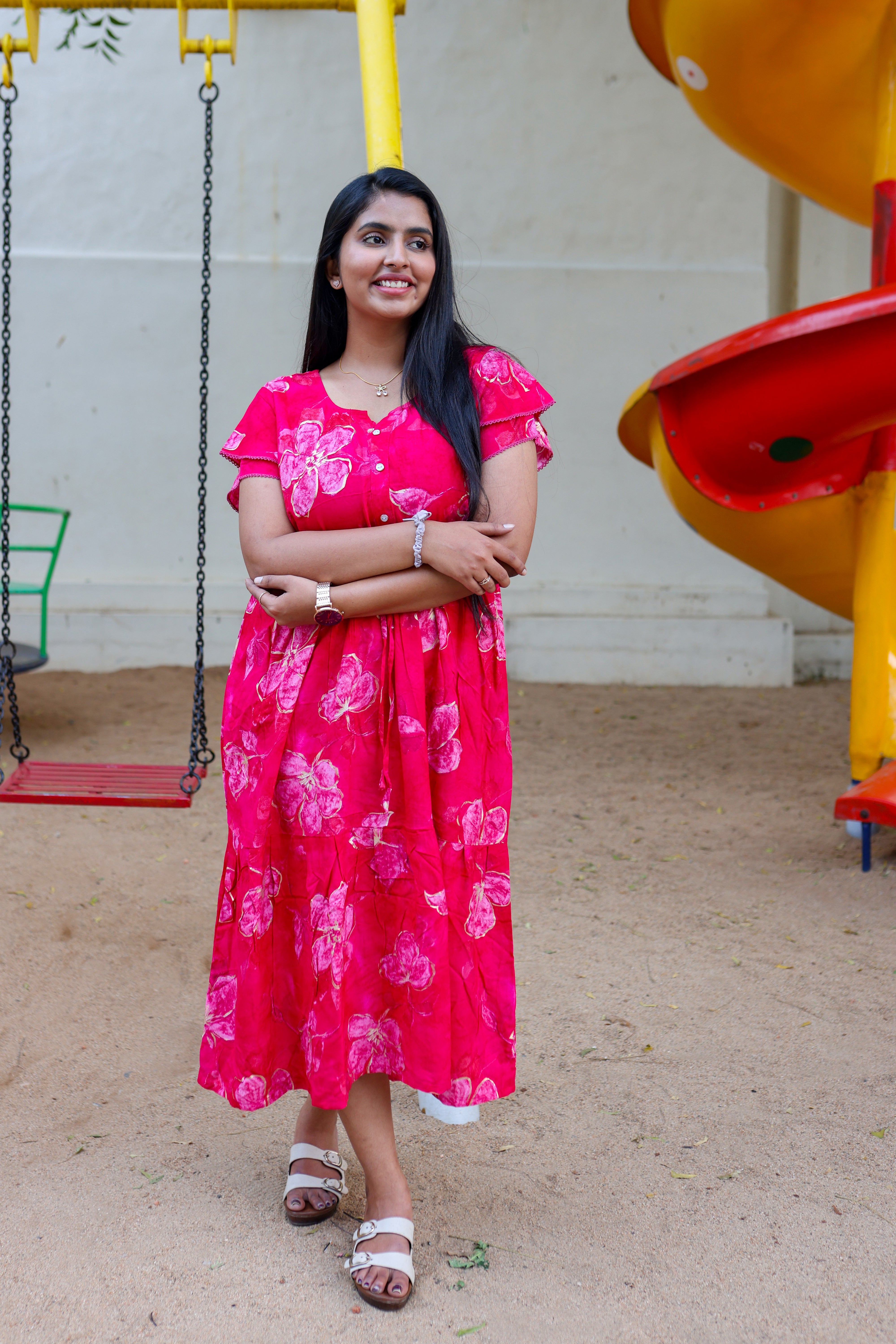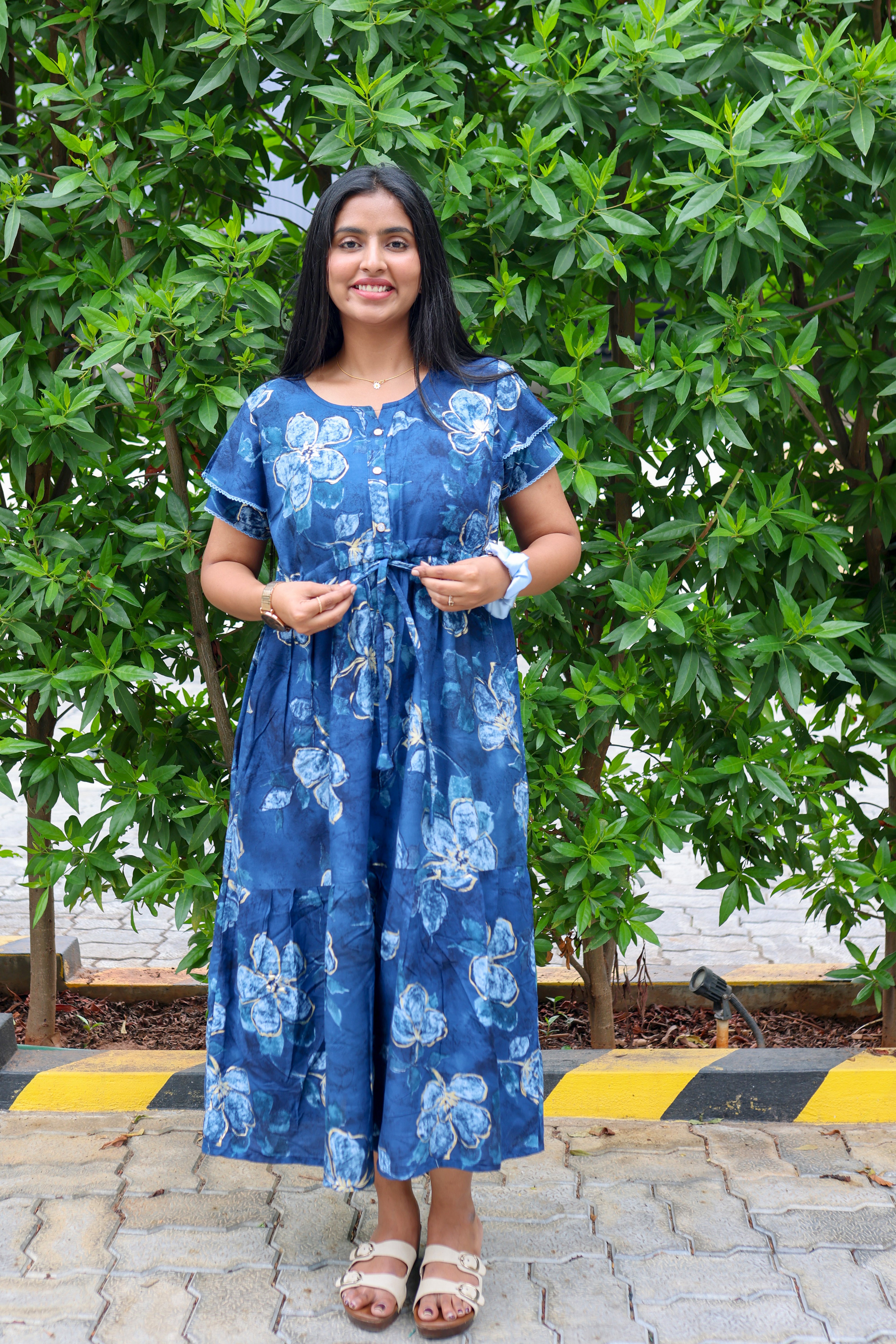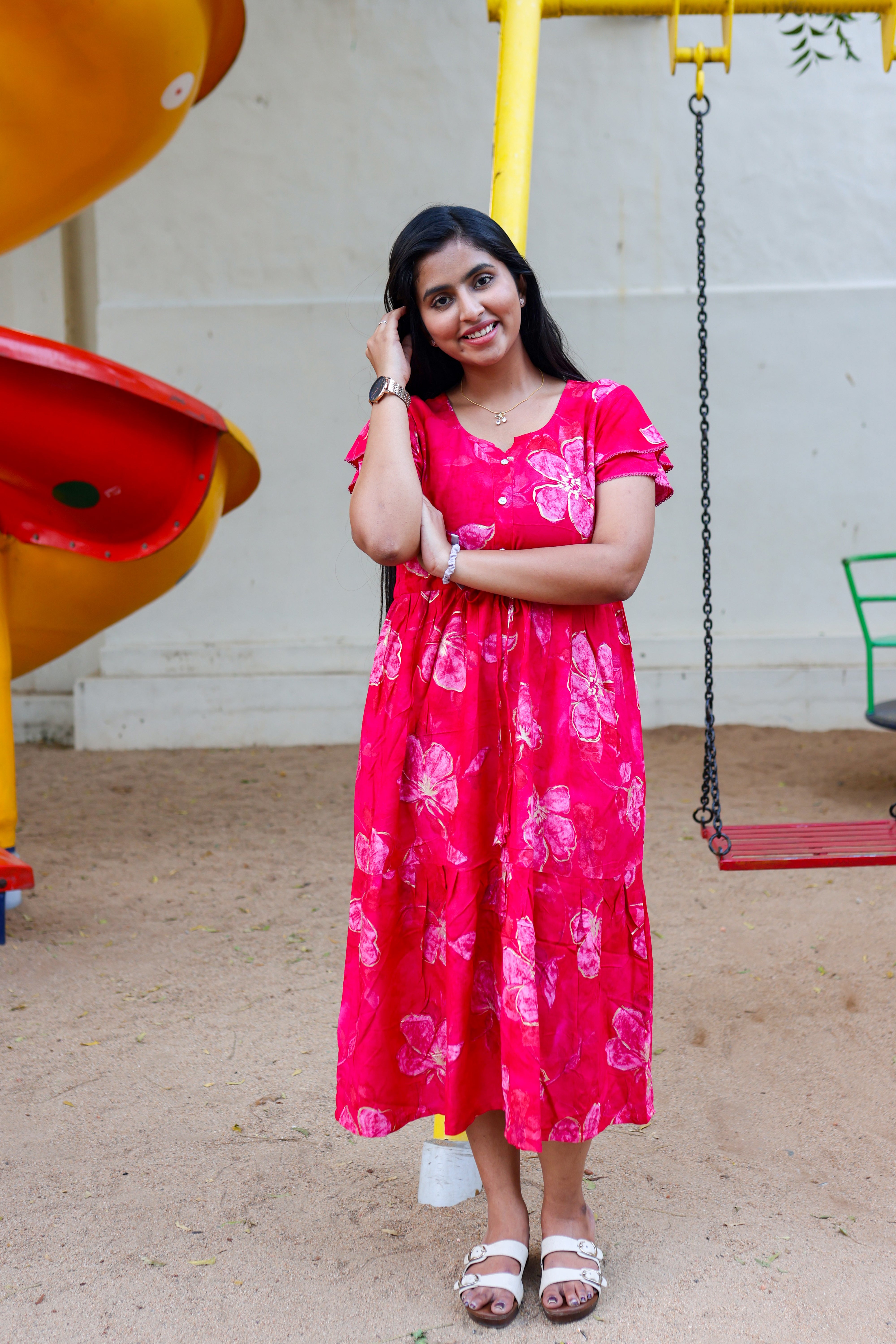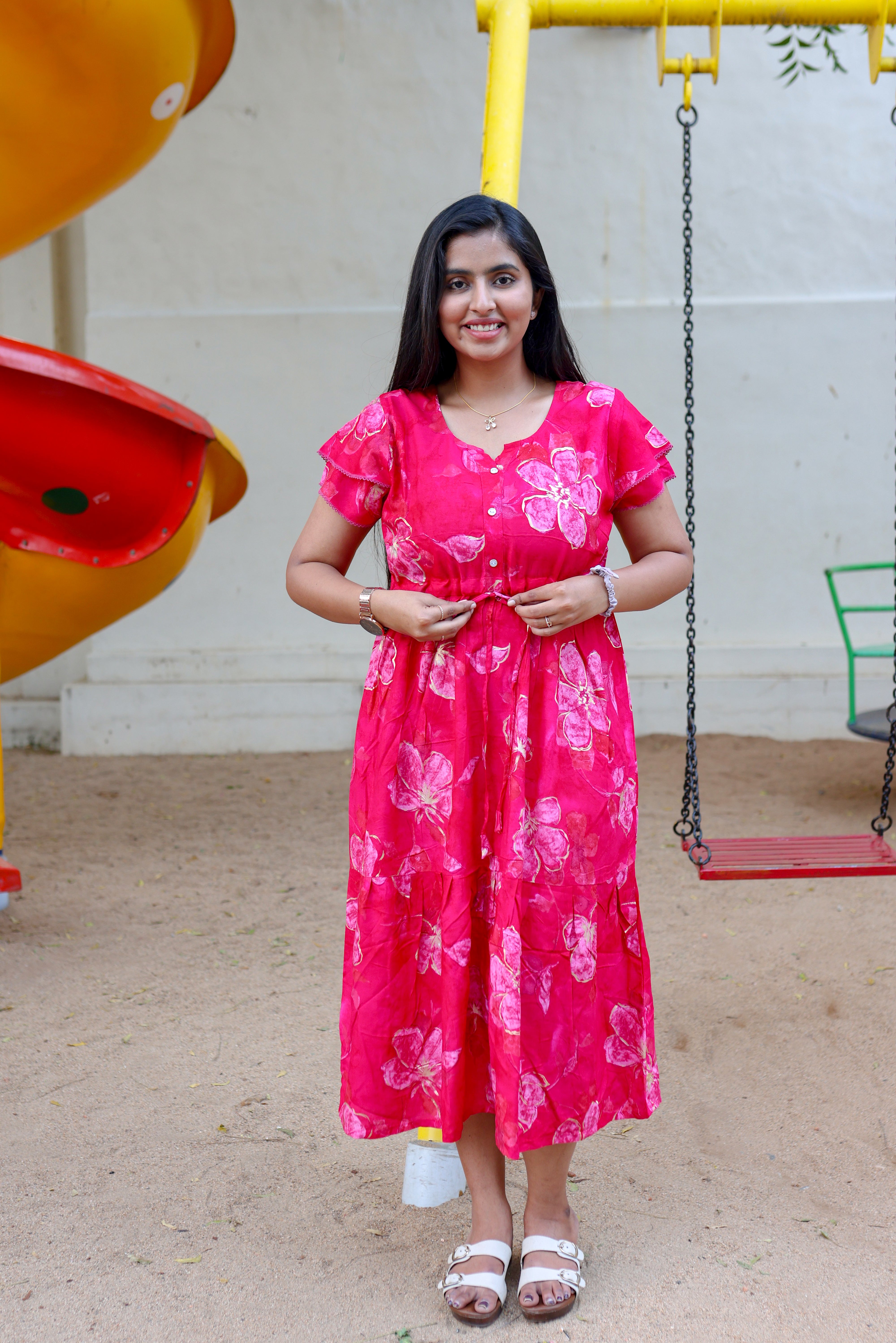 Upgrade your nightwear collection with this beautifully designed rayon nighty, blending style, comfort, and convenience. Featuring a vibrant foil print, gathering frock design, and front adjustable rope, this piece is a perfect mix of elegance and ease.