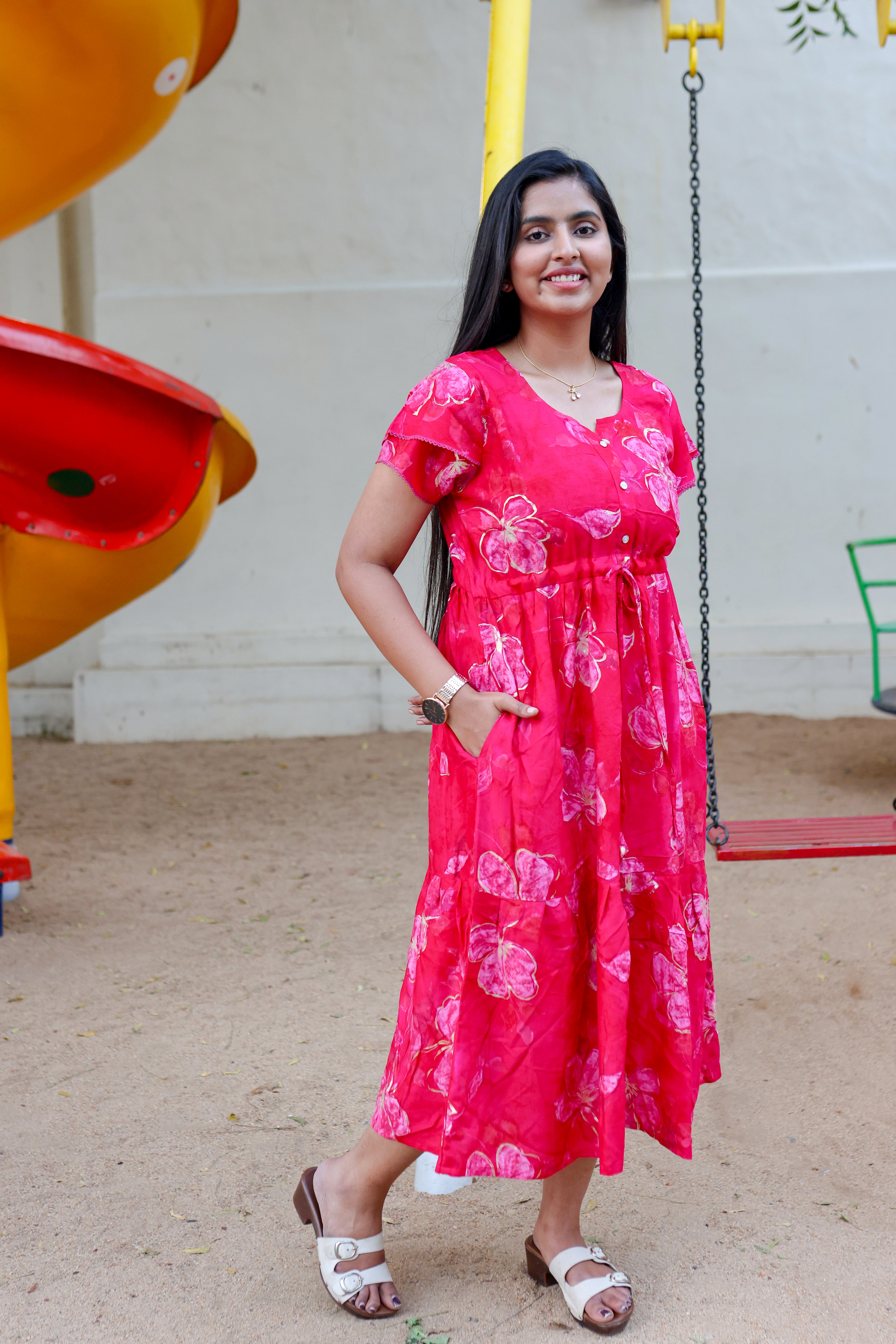 Rayon Colourful Foil Printing Gathering Frock Model Nighties | Side Pocket and Gathering Front Rope | Fancy Sleeve & Maxi Frock Nightwear for Stylish Women's (FGF)