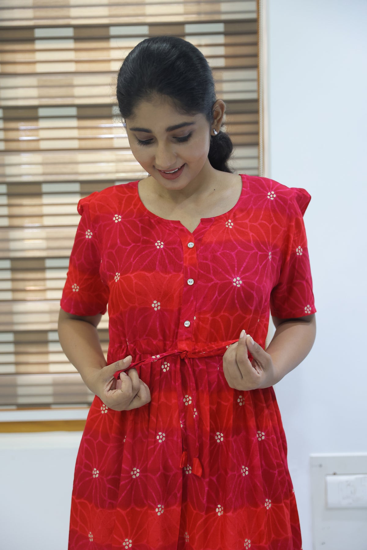 Upgrade your nightwear collection with this beautifully designed rayon nighty, blending style, comfort, and convenience. Featuring a vibrant foil print, gathering frock design, and front adjustable rope, this piece is a perfect mix of elegance and ease.
