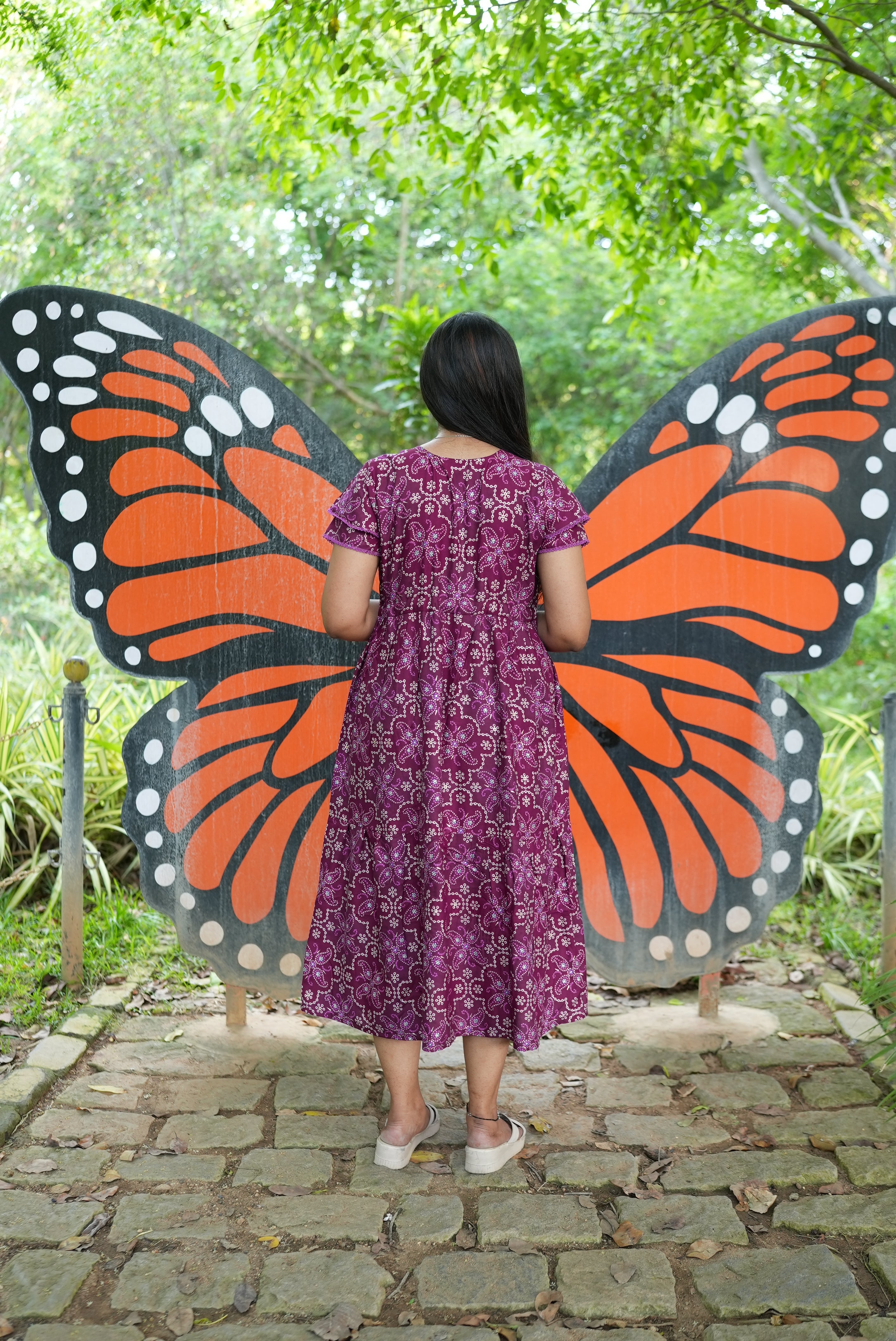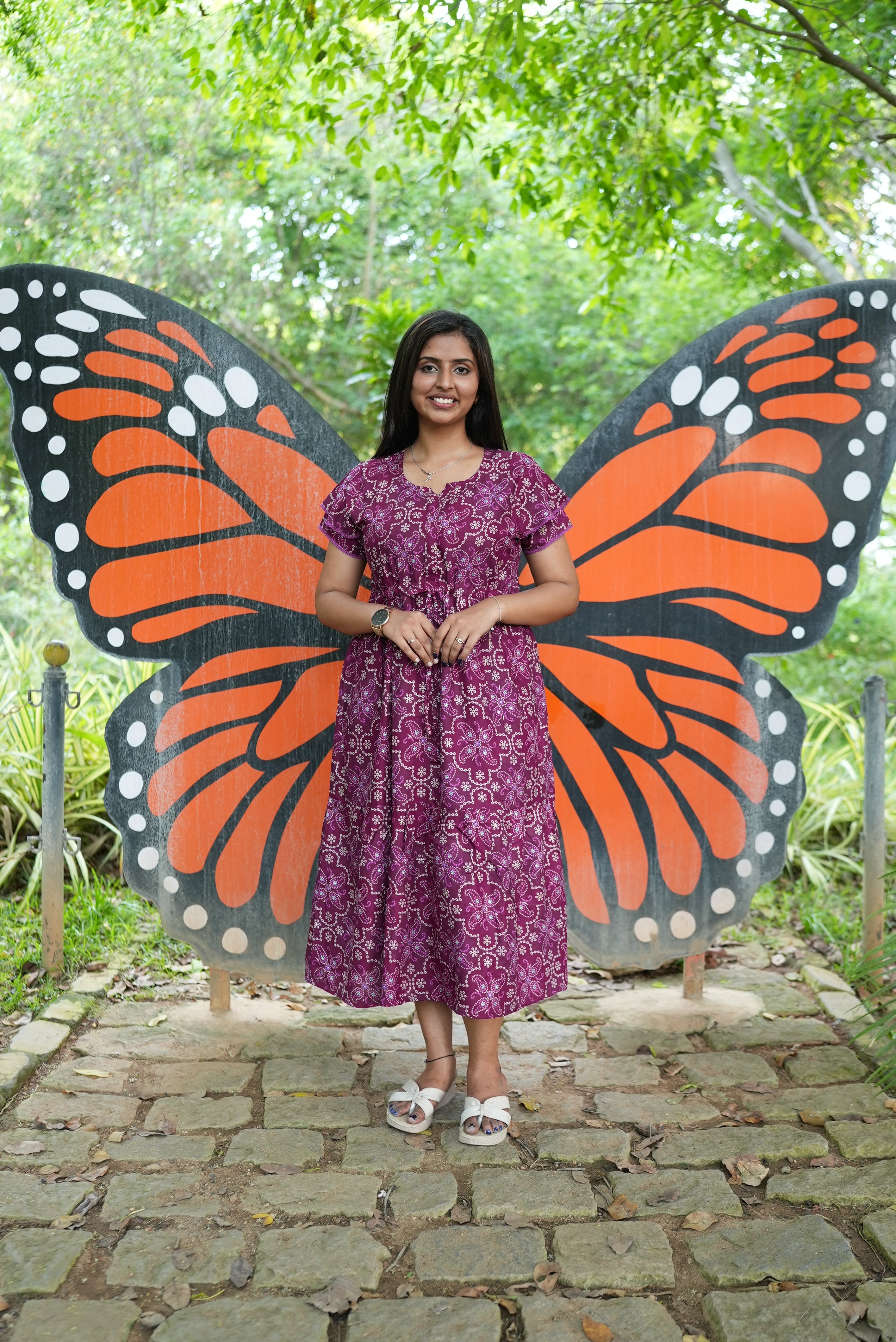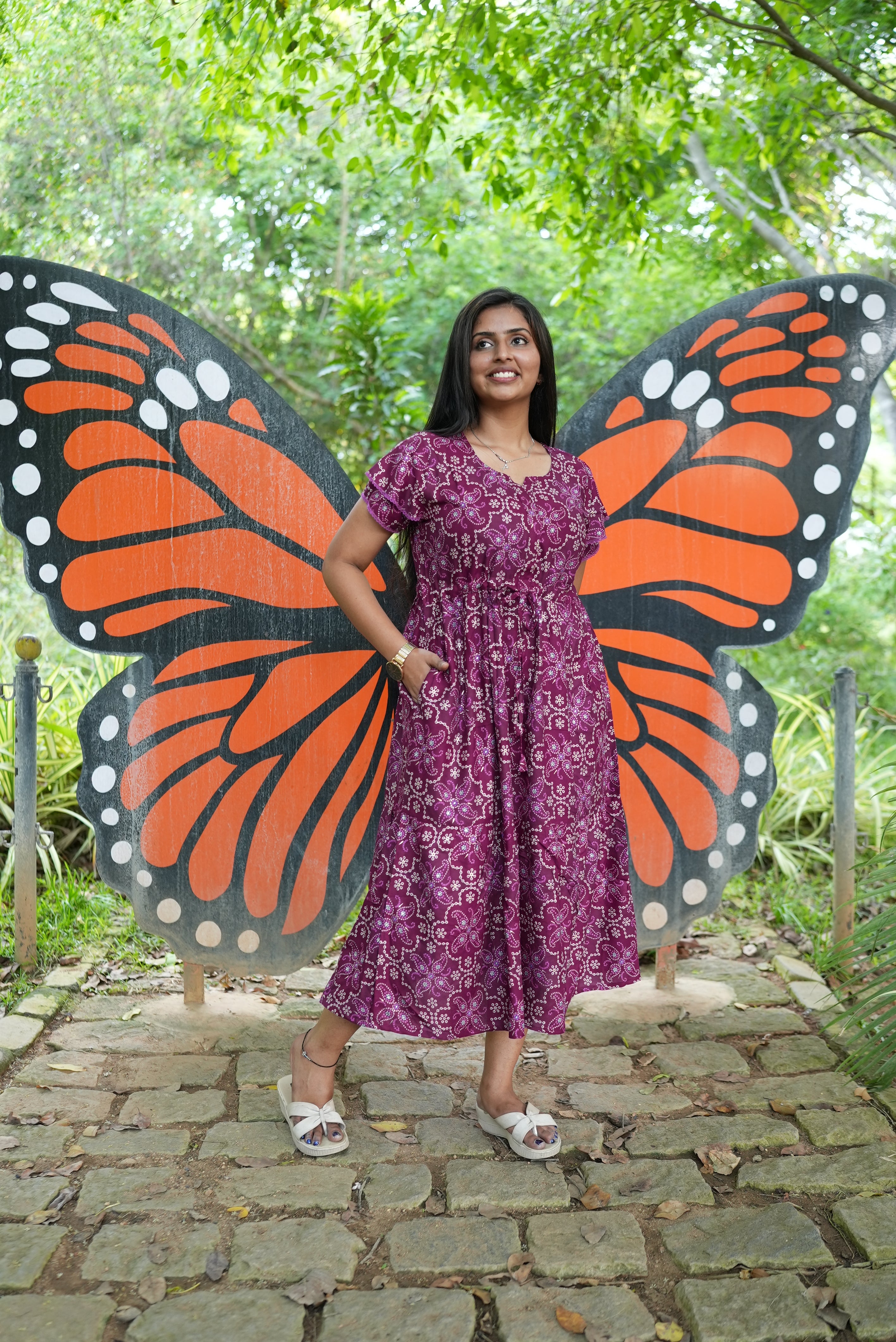 Royal Plum Floral Foil Rayon Maxi Dress – Double Layer Flutter Sleeve Frock with Adjustable Waist Tie & Side Pockets -