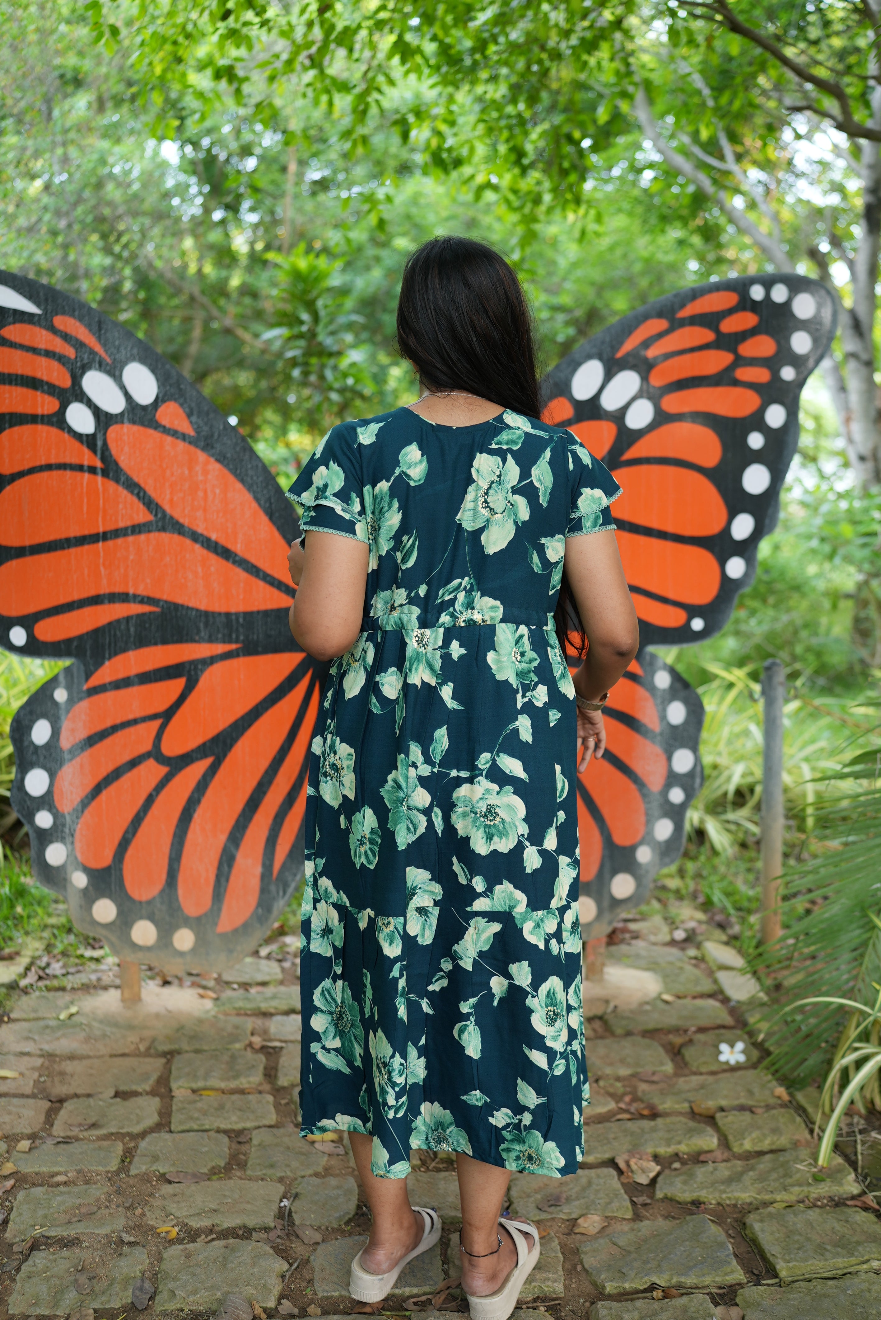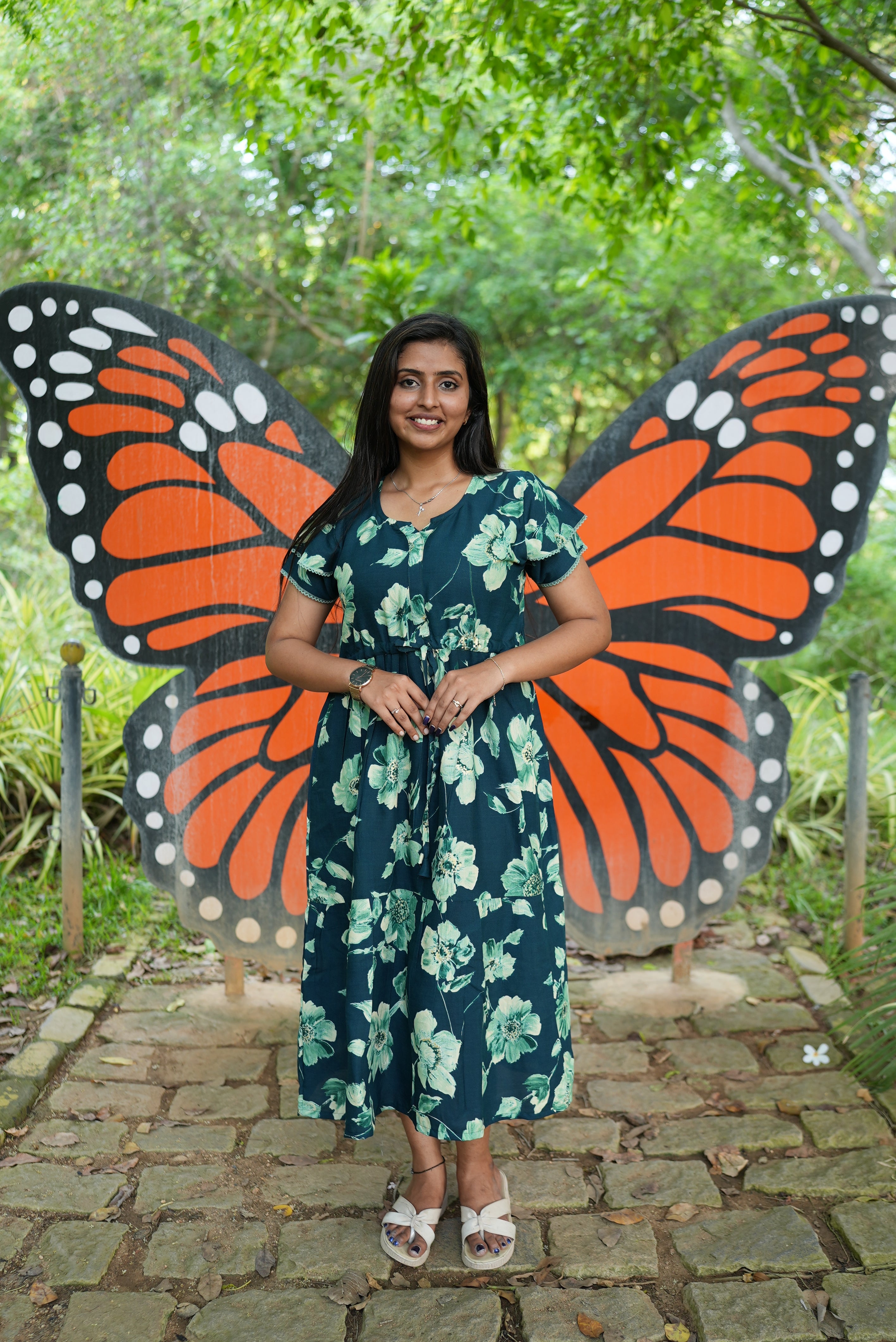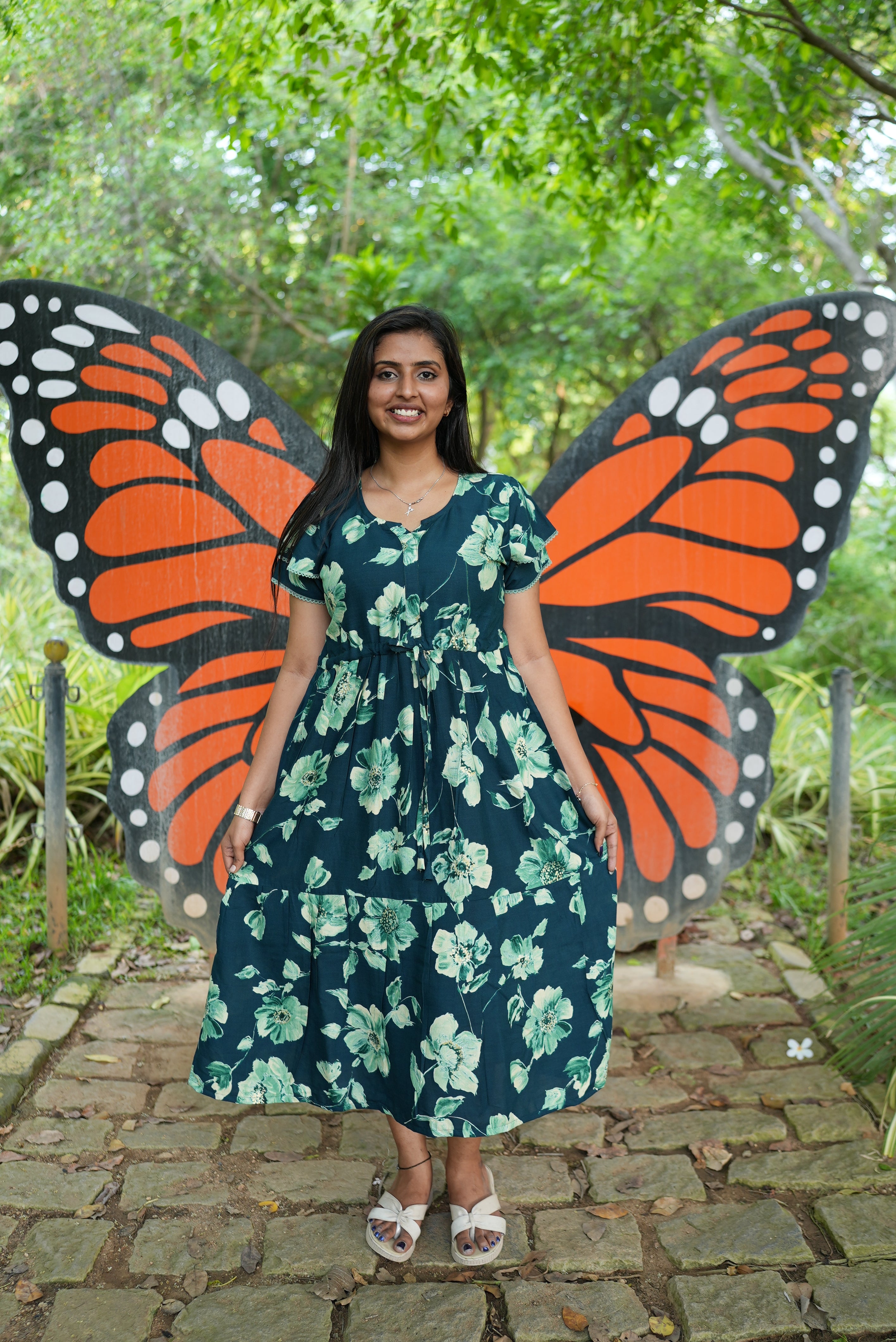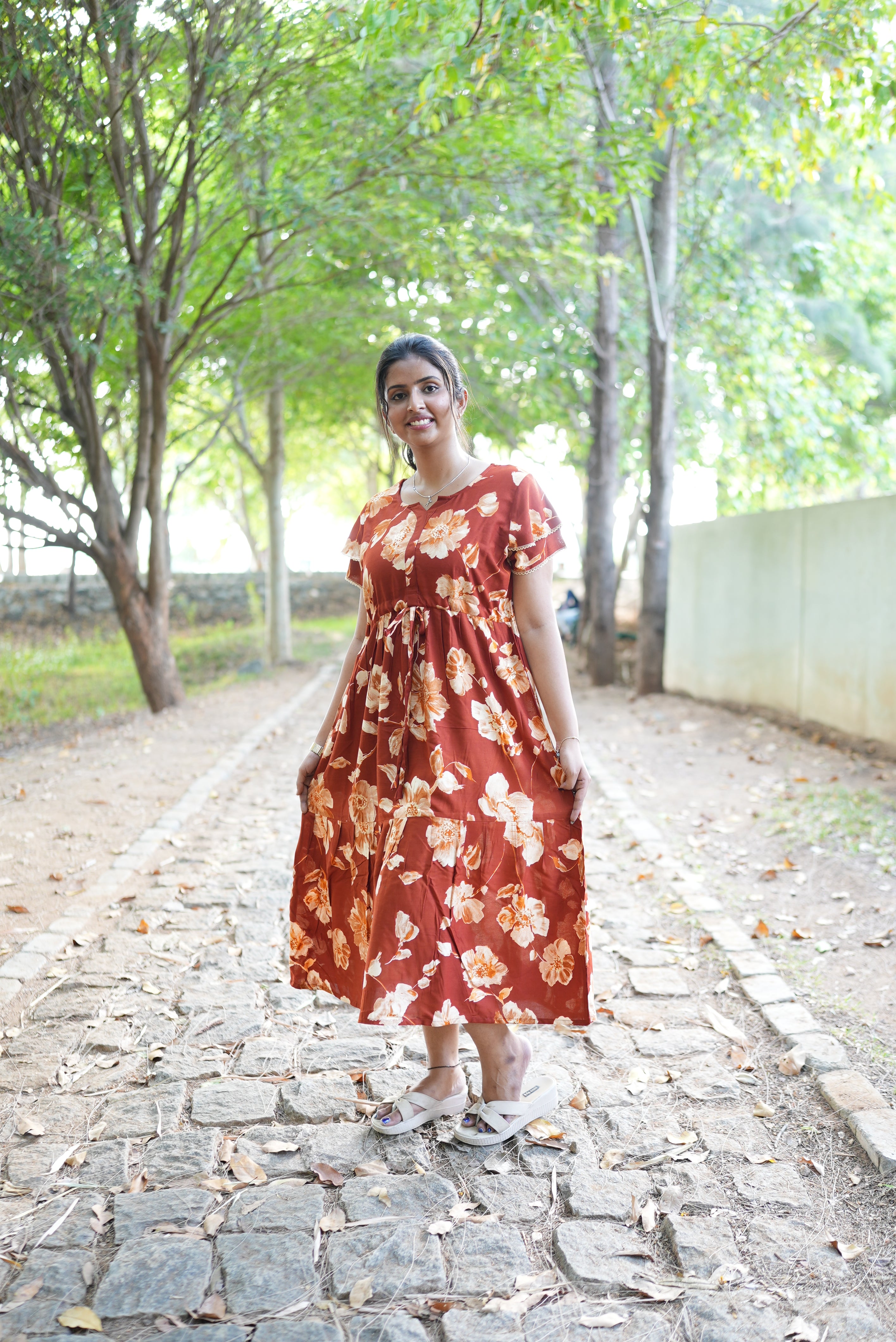 Terracotta Bloom Rayon Foil Maxi Frock – Double Layer Frill Sleeve Summer Dress with Adjustable Waist Tie & Side Pockets - Breathable Summer Wear MAXI Frock