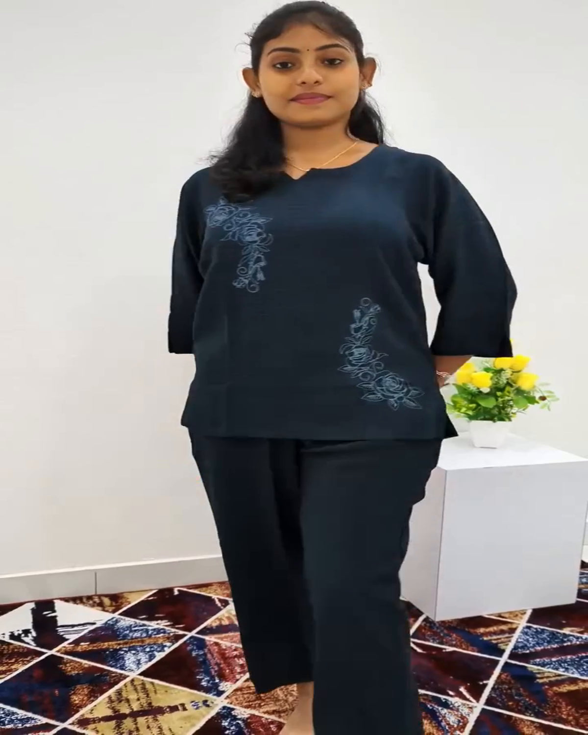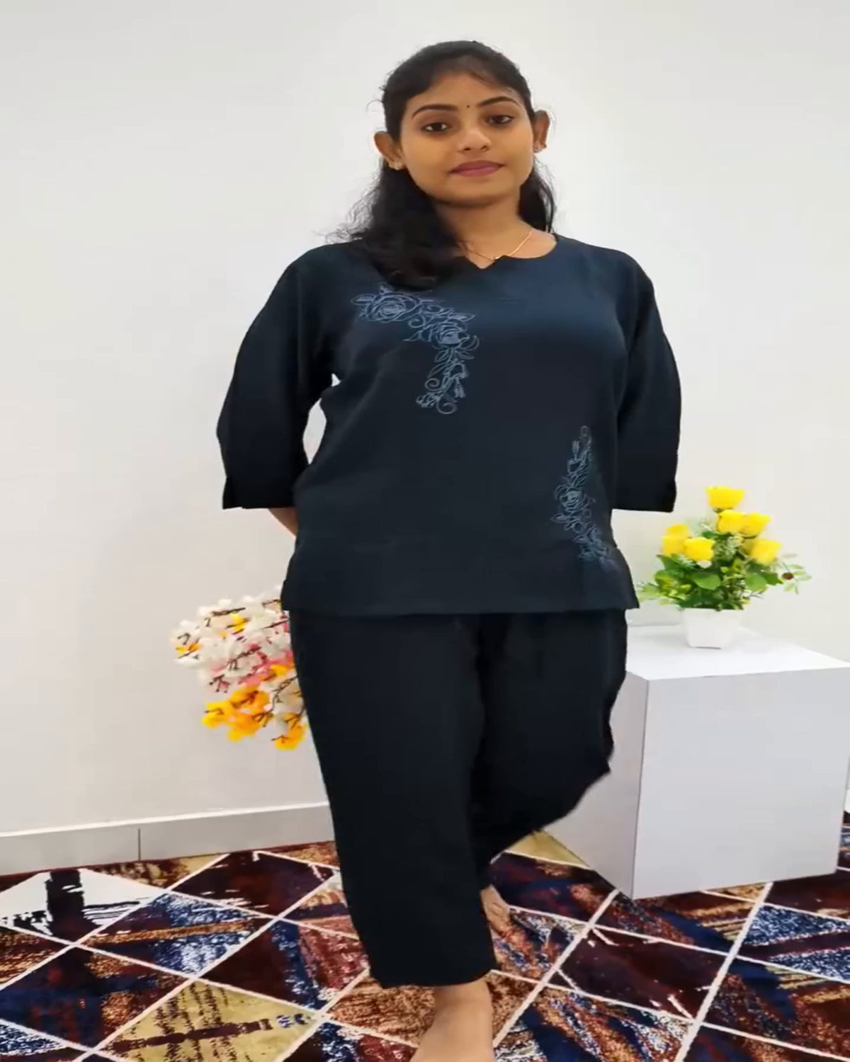 Crafted from premium linen, these cord set night suits offer breathable comfort ideal for teenagers and women. The natural fabric ensures softness and durability, promoting a restful night's sleep. Designed for a relaxed fit, this nightwear keeps you comfortable without compromising style. Perfect for evening relaxation, it combines practicality with elegant simplicity.