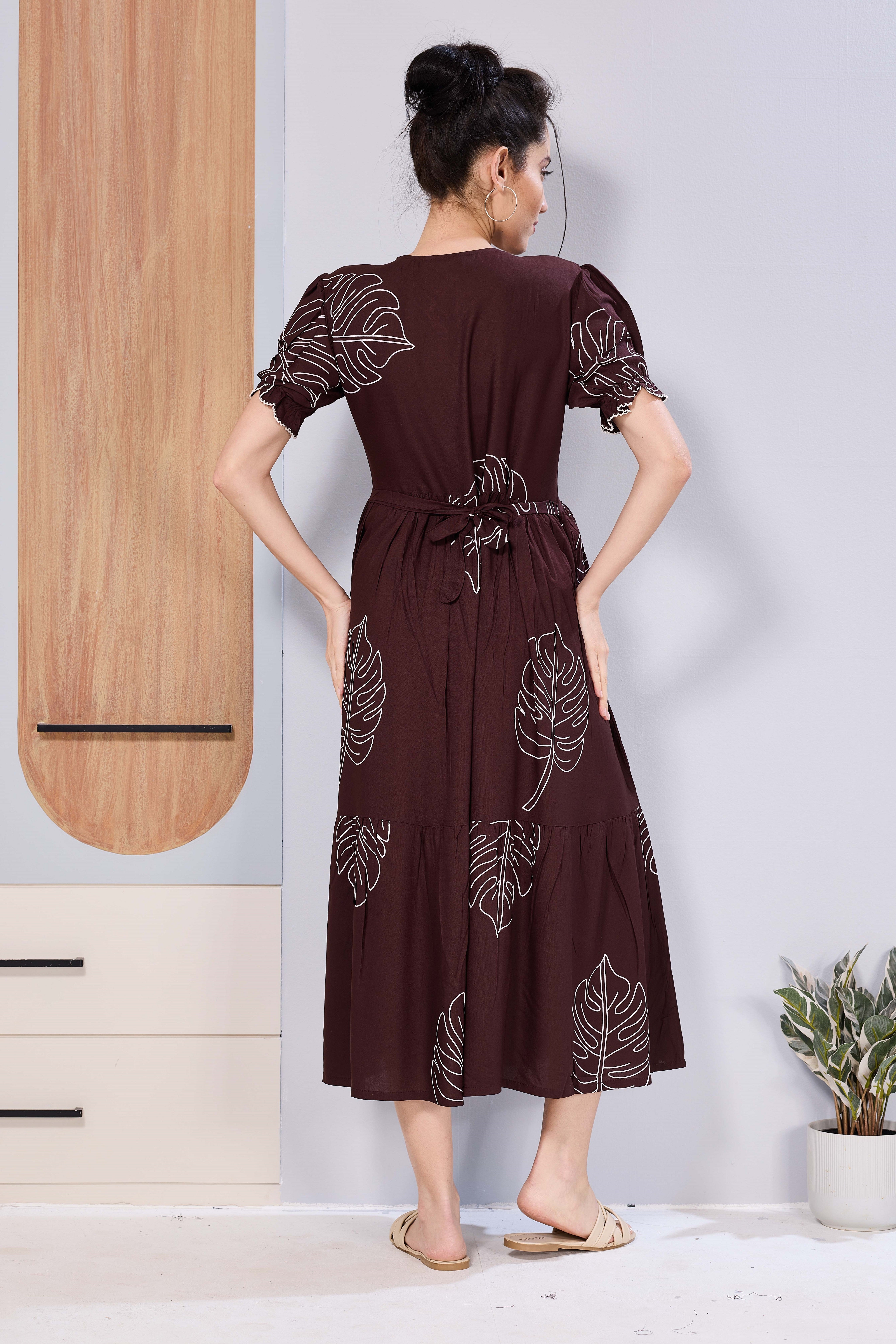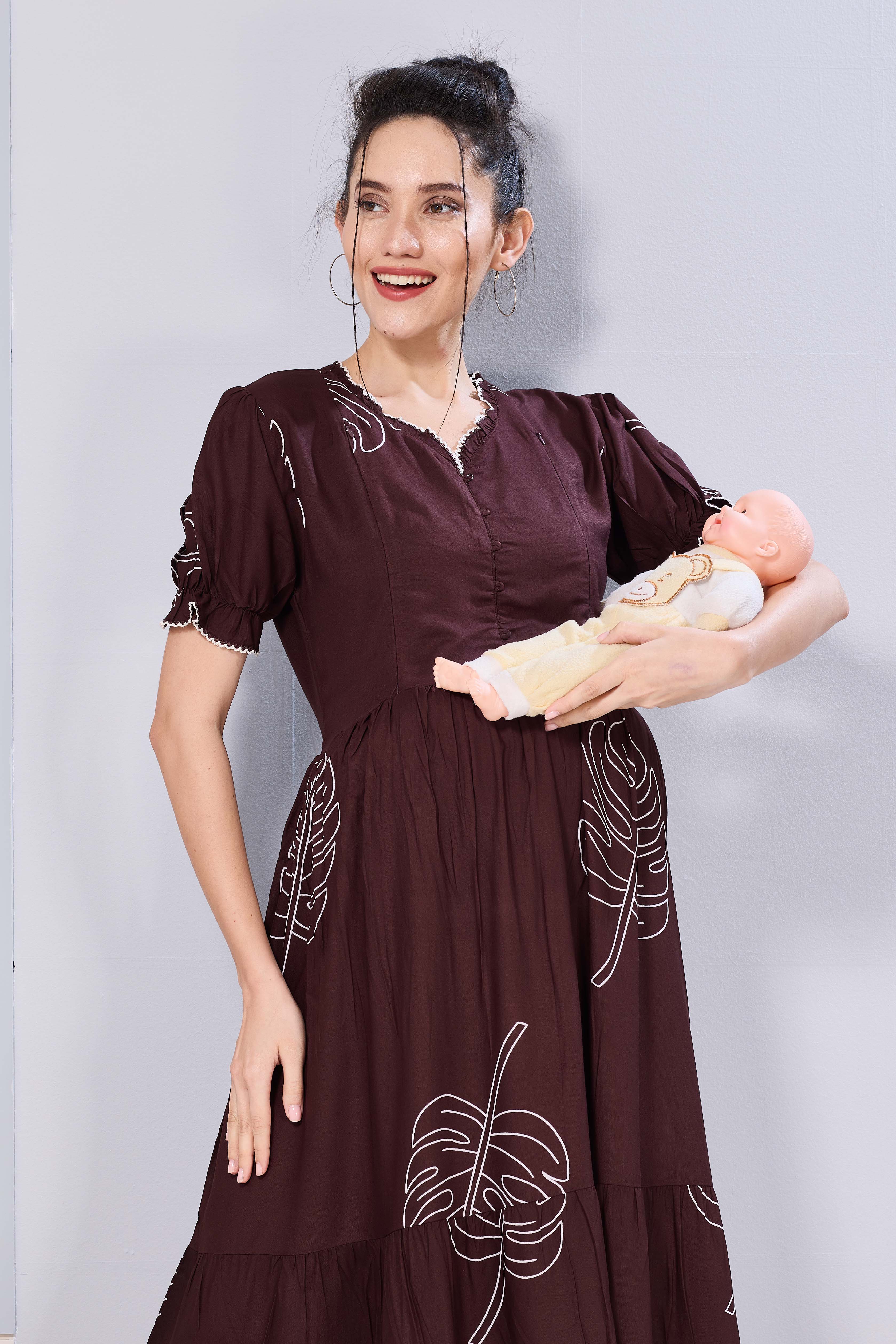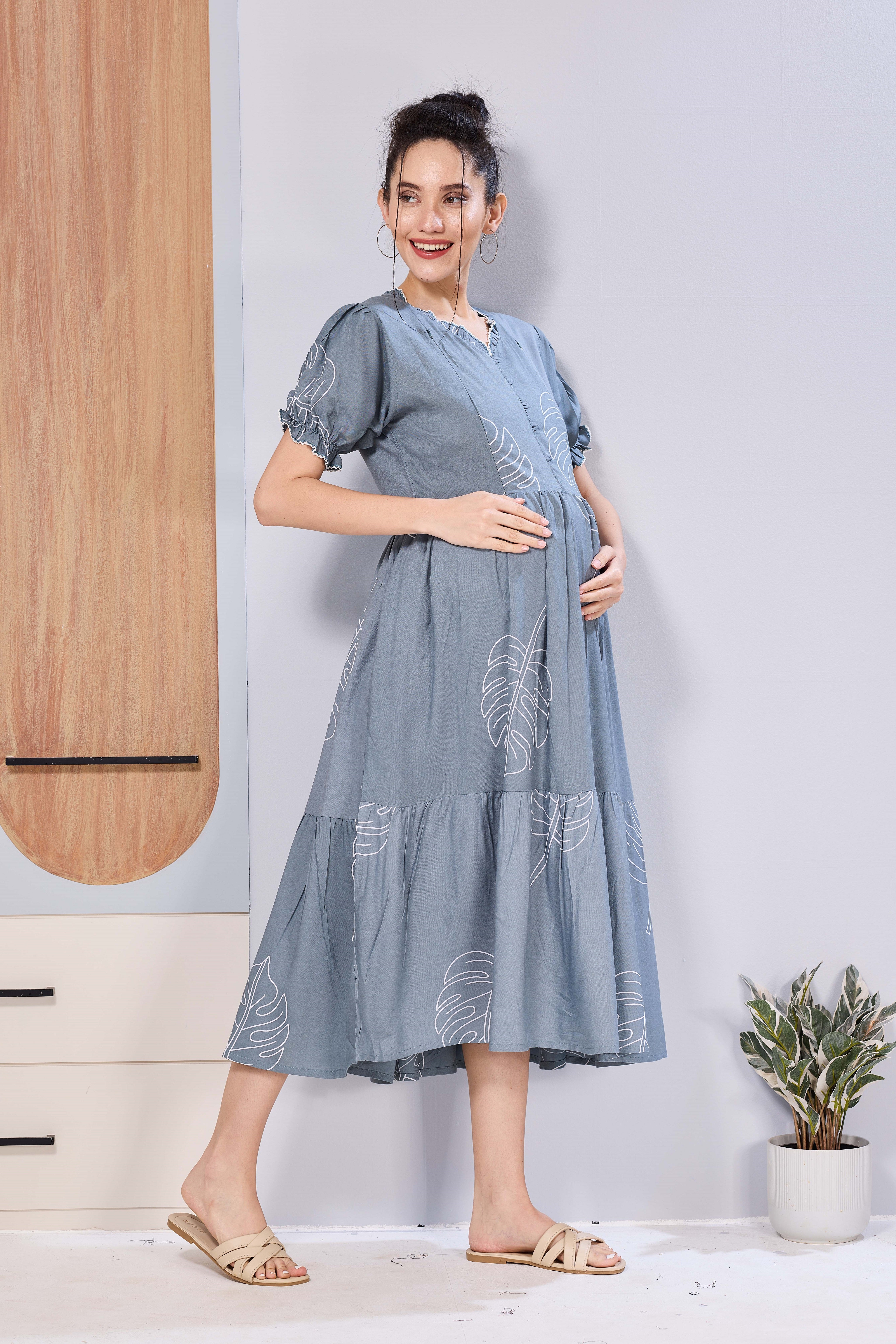 Balance modern geometric style with effortless motherhood in this navy and cream abstract maxi dress. Designed with a structured, professional aesthetic, this nursing frock provides a flattering fit through every trimester. The integration of high-end picoting craftsmanship and discreet feeding access makes it a versatile staple for the modern mom’s wardrobe.