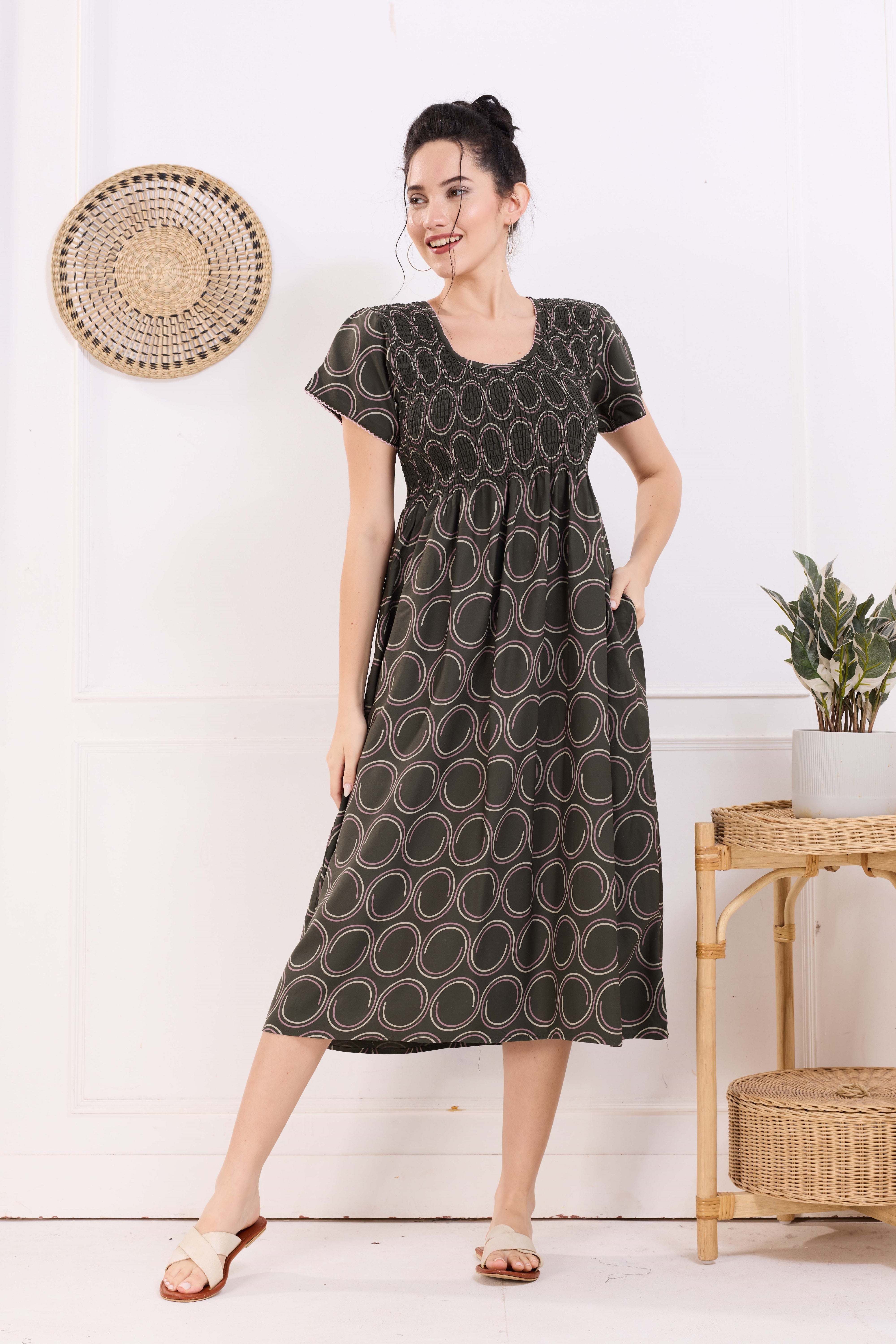 MANGAI Premium Rayon MAXI Frock Smocking Night Gown | Stretchable & Comfort Fit | Fancy Pleated Style with Side Pocket | Round Neck Nightwear for Stylish Women (SRM)