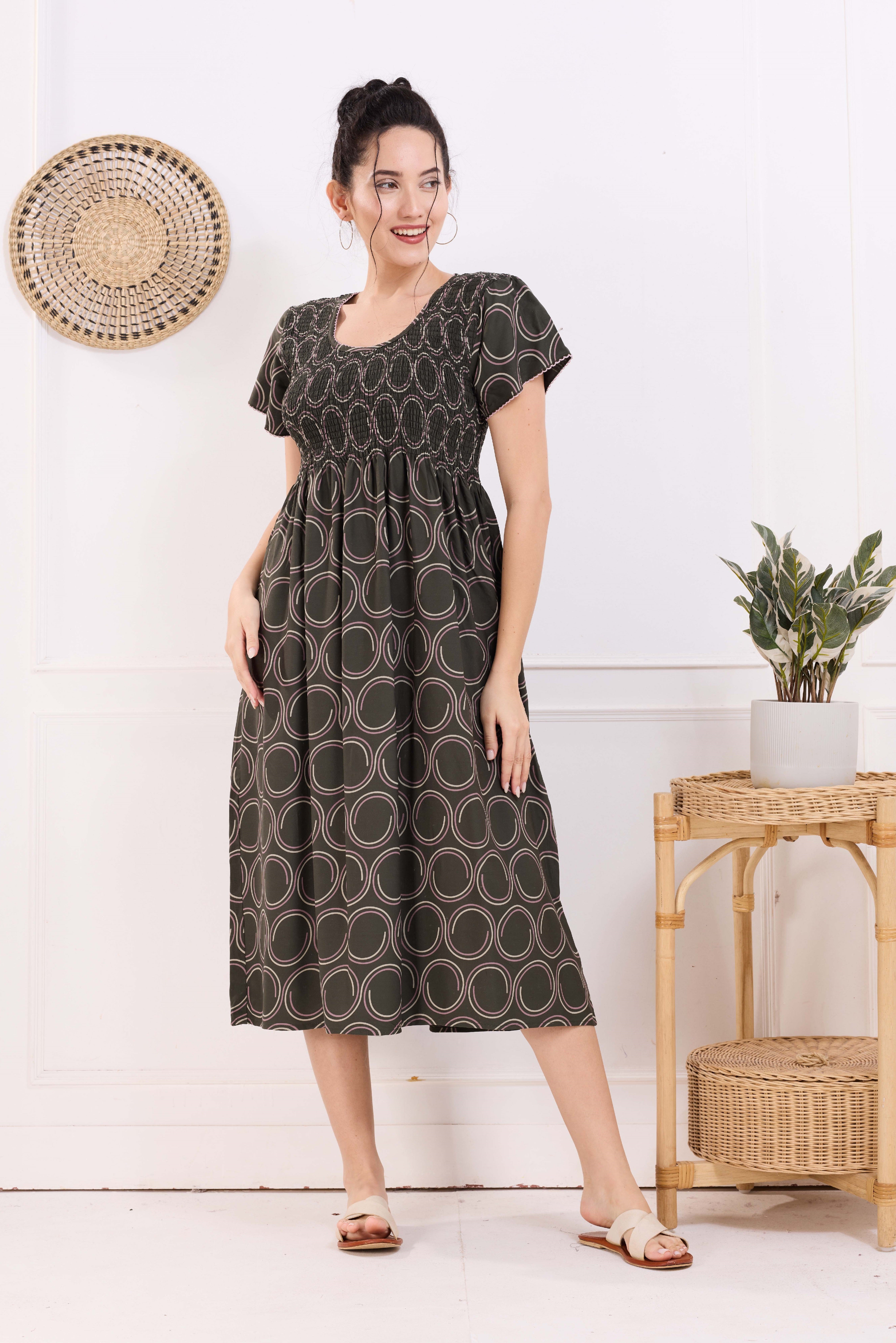 Experience ultimate comfort and style with the MANGAI Premium Rayon MAXI Frock Night Gown. Crafted from soft and smooth rayon fabric, this elegant piece features a stretchable smocking design for a perfect fit. The fancy pleated MAXI frock model adds a touch of flair, while the side pocket offers practicality. Designed with a round neck for timeless charm, this gown is ideal for stylish women who love both comfort and fashion.