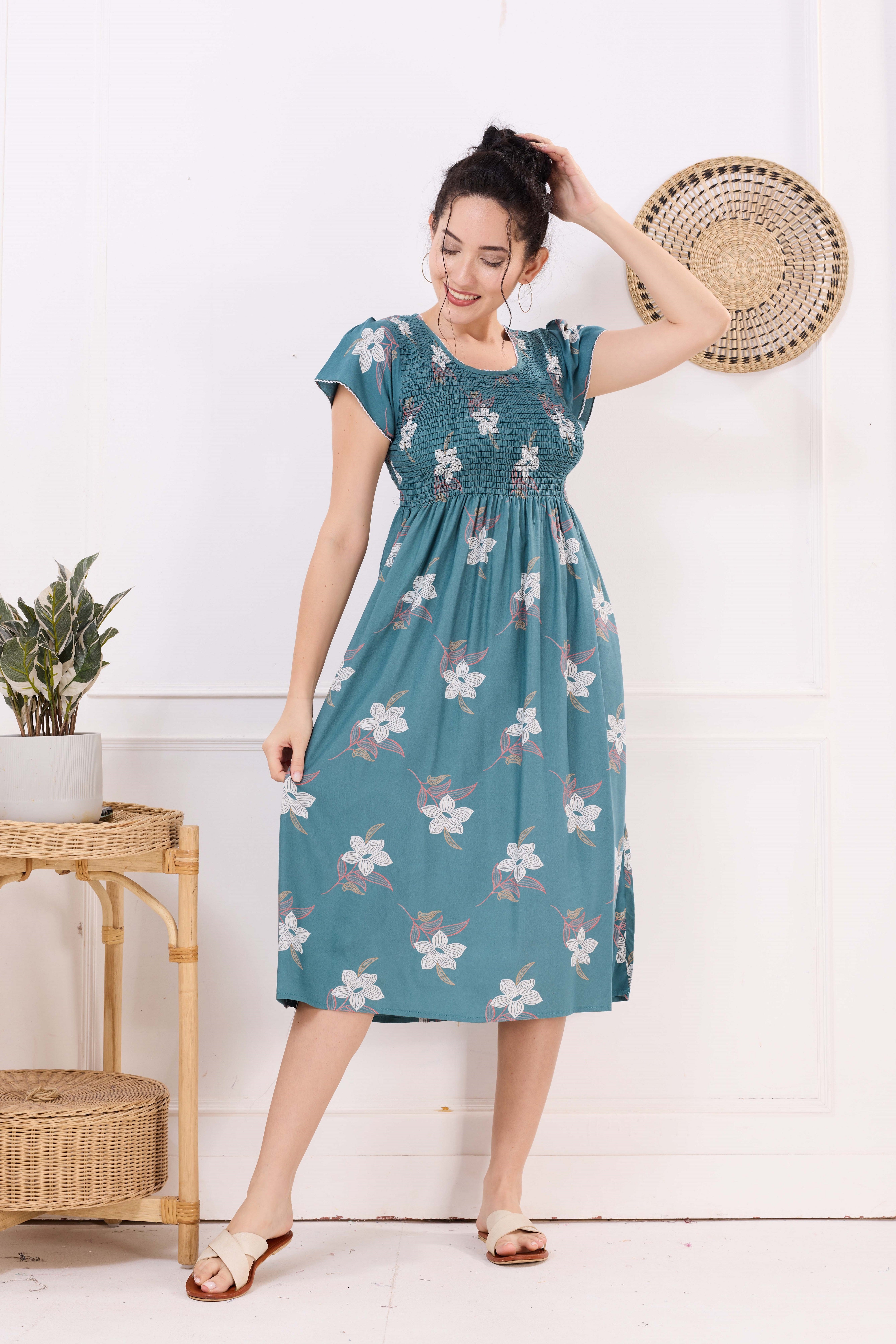 Experience ultimate comfort and style with the MANGAI Premium Rayon MAXI Frock Night Gown. Crafted from soft and smooth rayon fabric, this elegant piece features a stretchable smocking design for a perfect fit. The fancy pleated MAXI frock model adds a touch of flair, while the side pocket offers practicality. Designed with a round neck for timeless charm, this gown is ideal for stylish women who love both comfort and fashion.