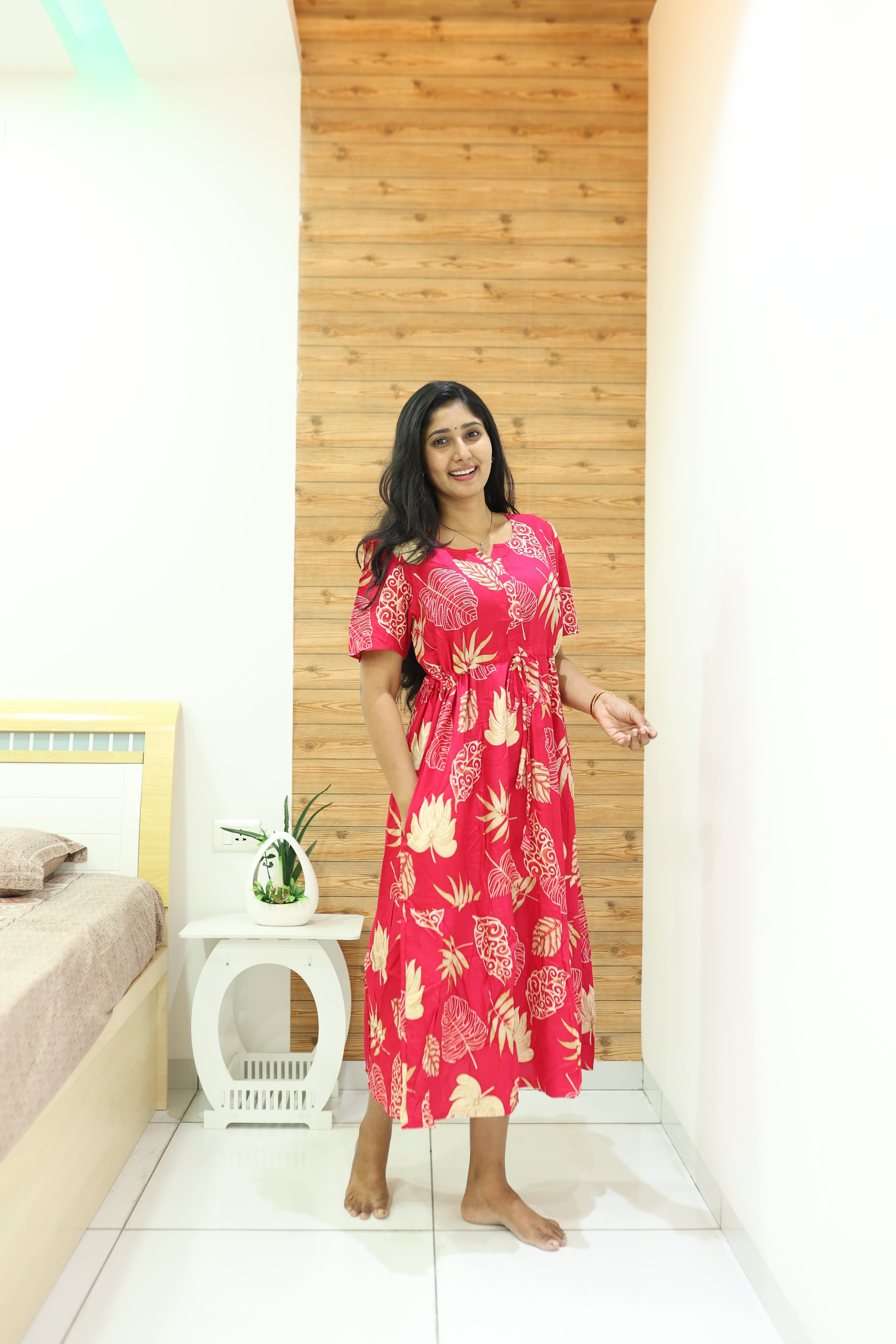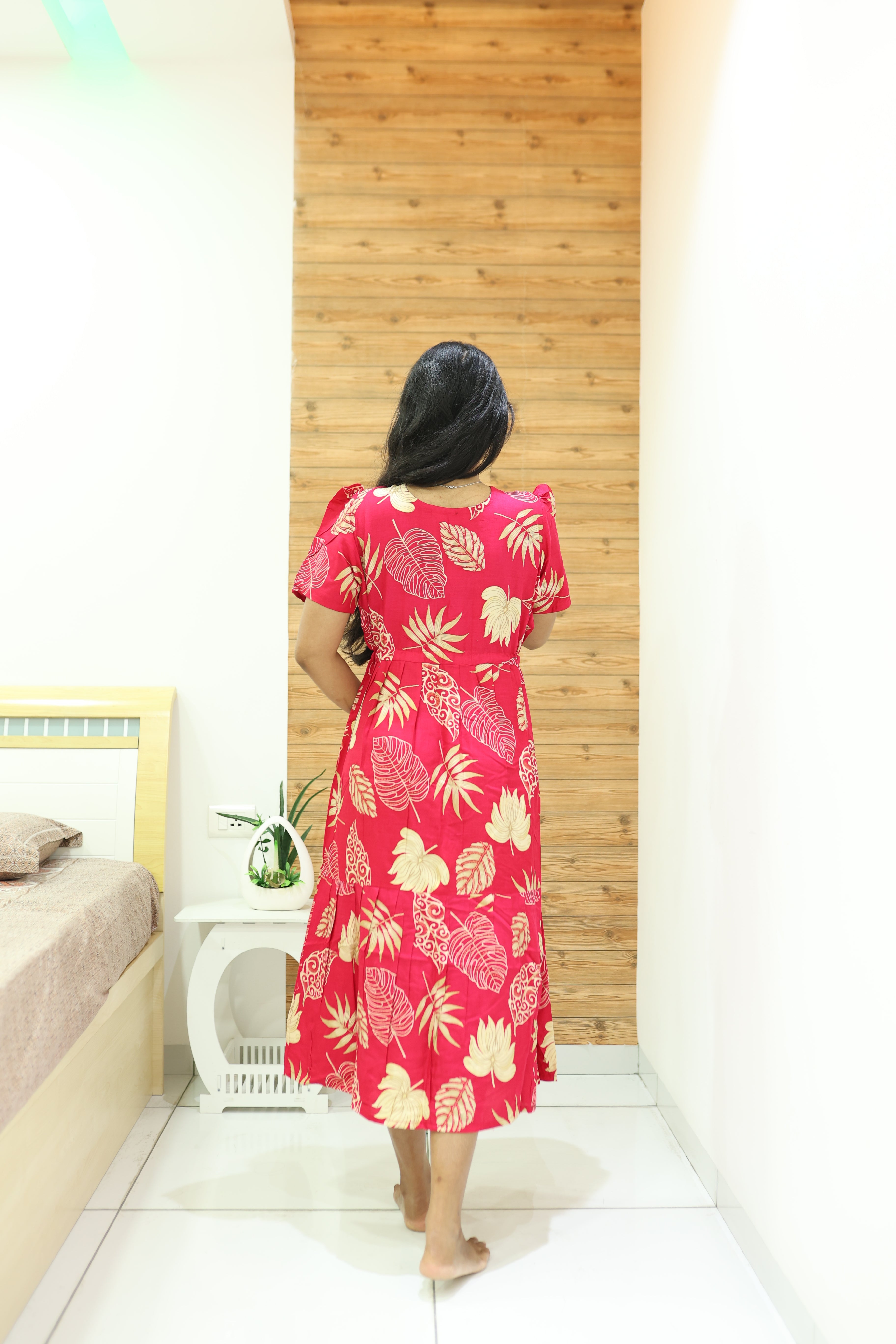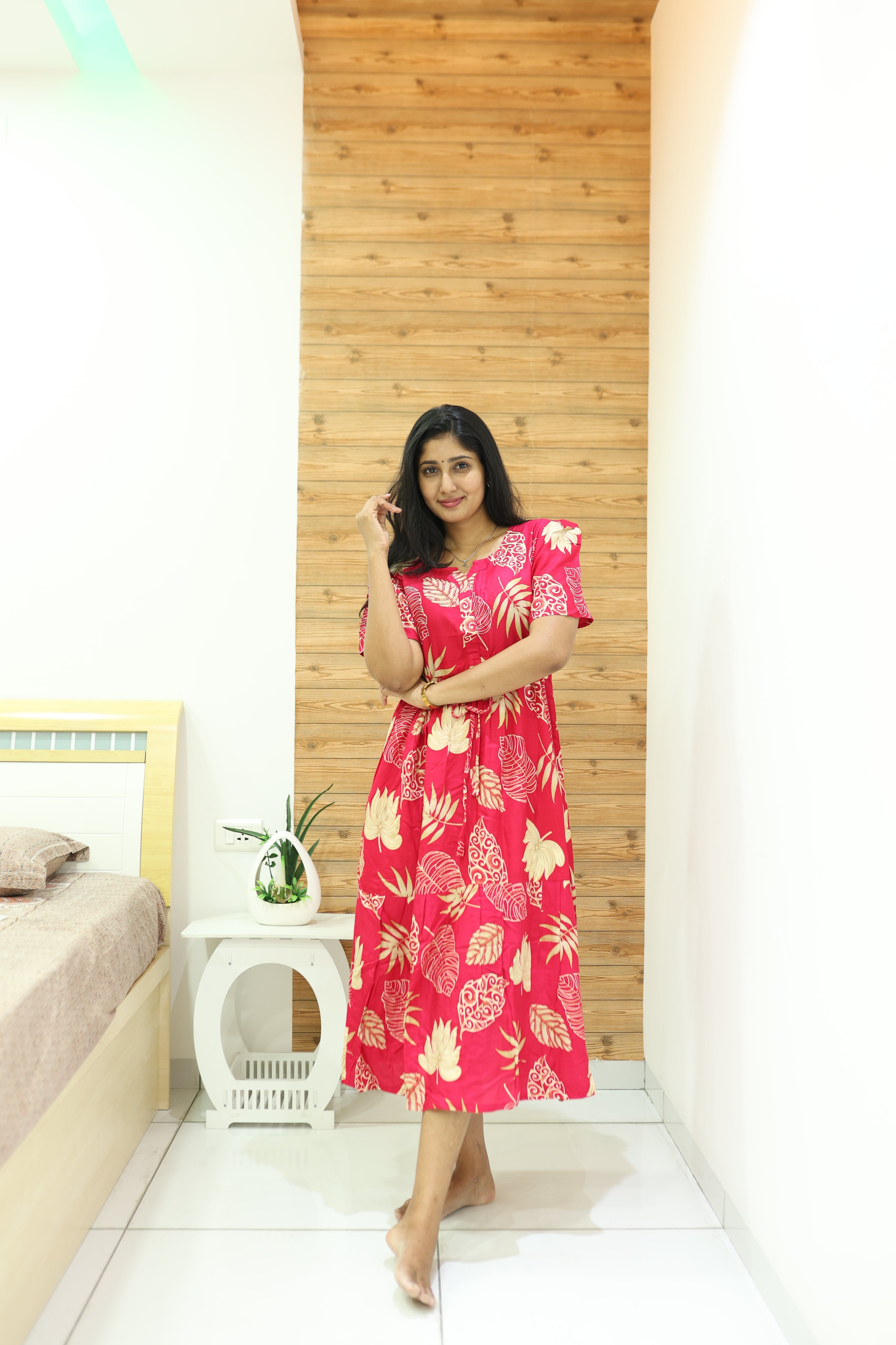 Rayon Colourful Foil Printing Gathering Frock Model Nighties | Side Pocket and Gathering Front Rope | Fancy Puff Sleeve & Maxi Frock Nightwear for Stylish Women's (FGF)