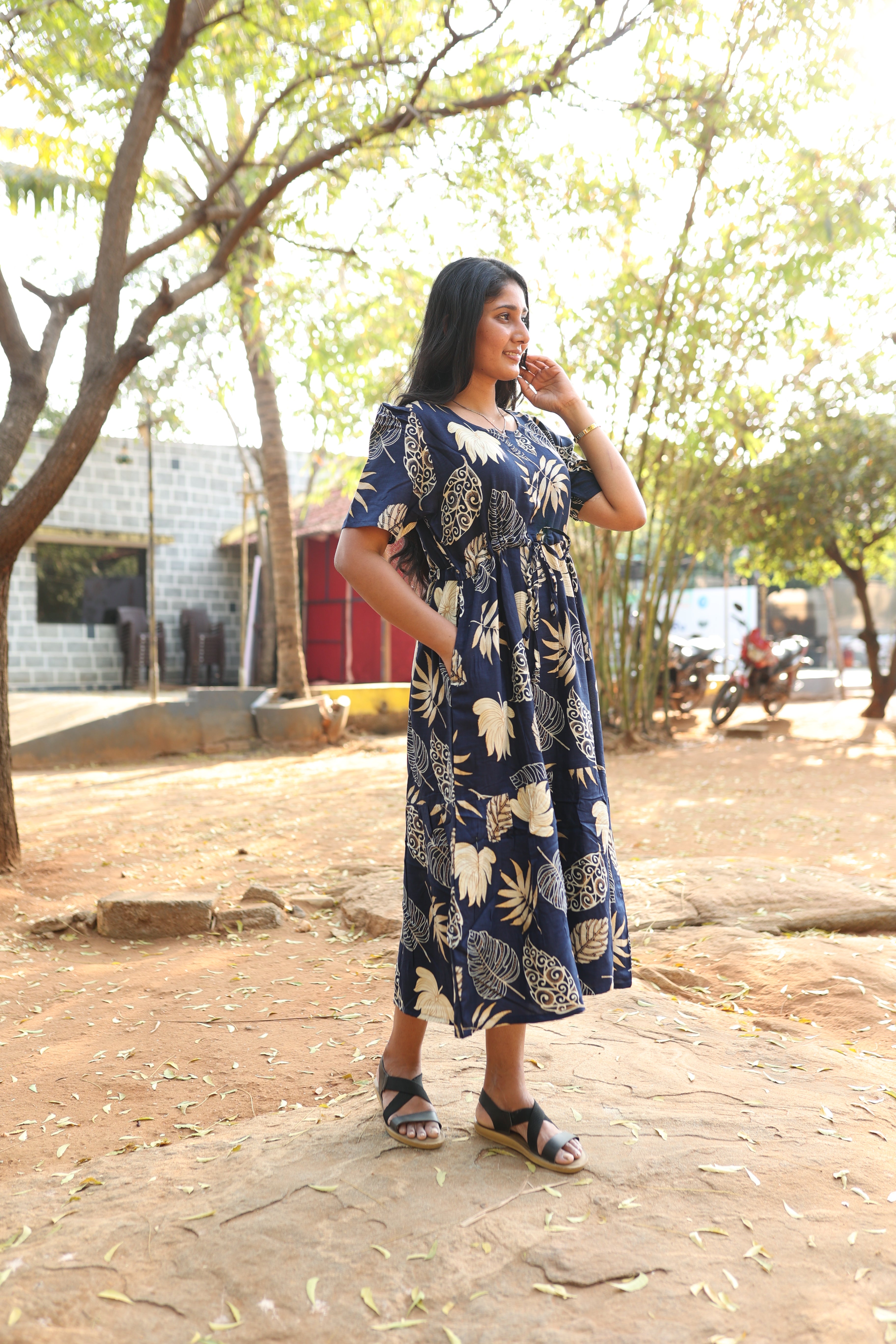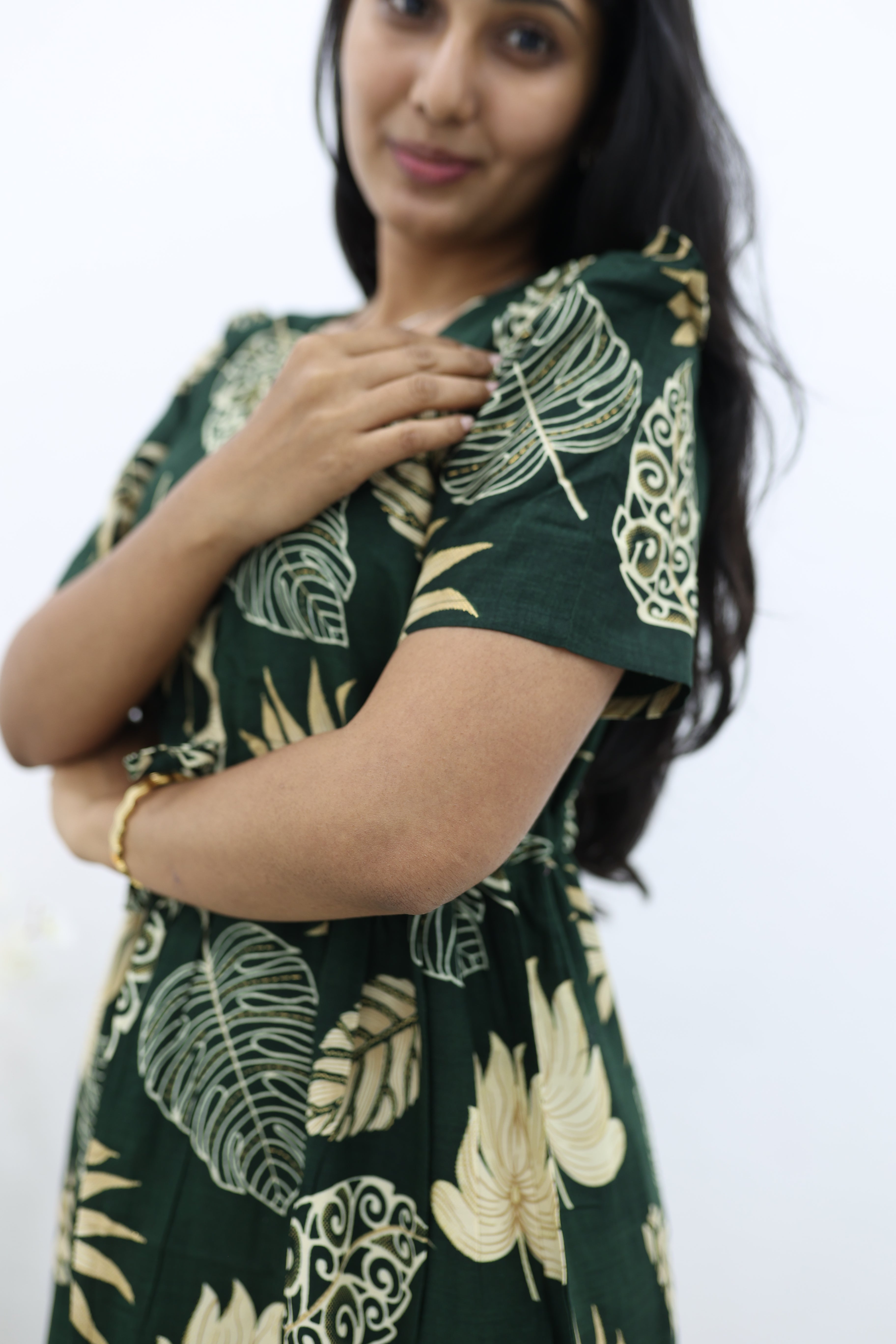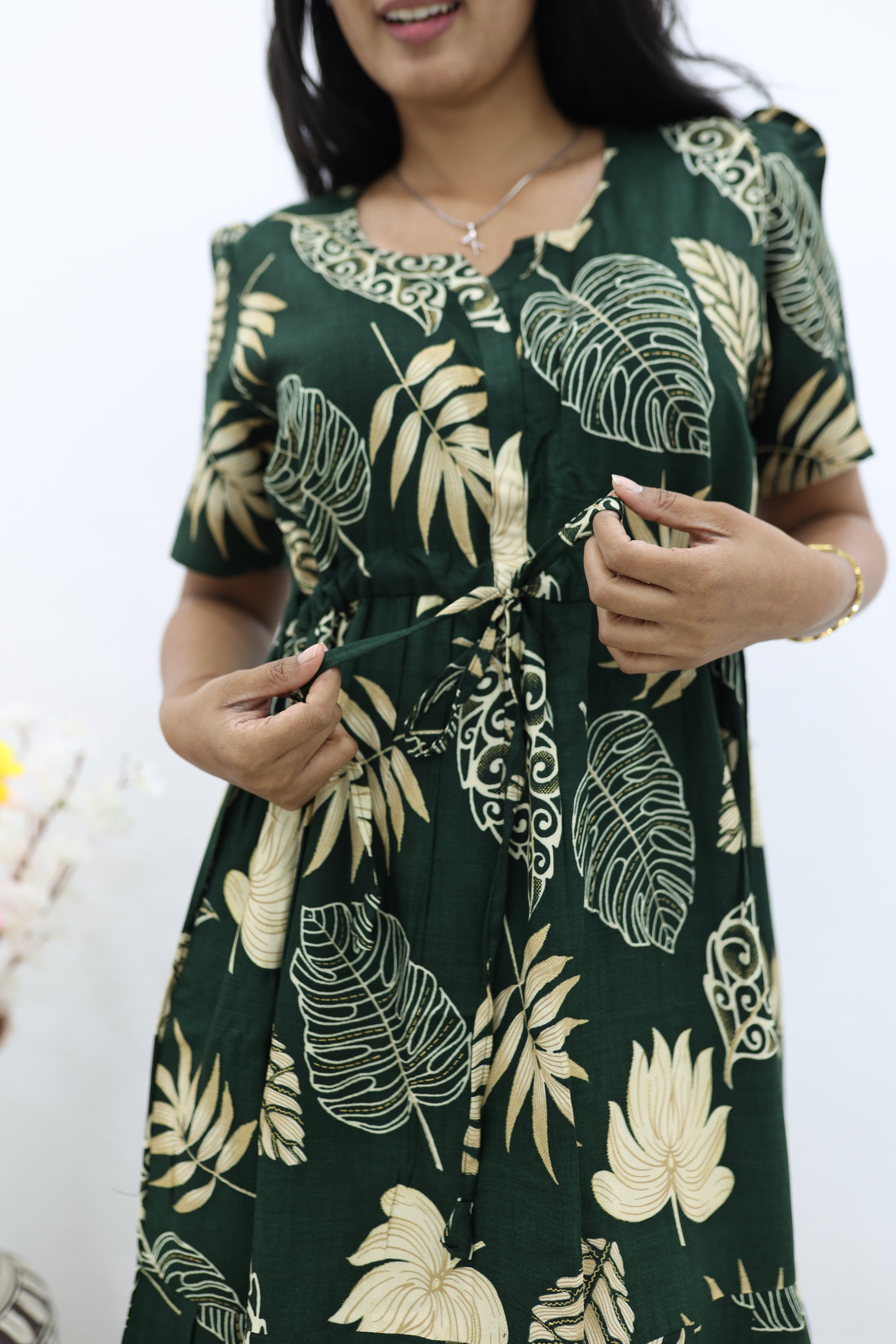 Rayon Colourful Foil Printing Gathering Frock Model Nighties | Side Pocket and Gathering Front Rope | Fancy Puff Sleeve & Maxi Frock Nightwear for Stylish Women's (FGF)