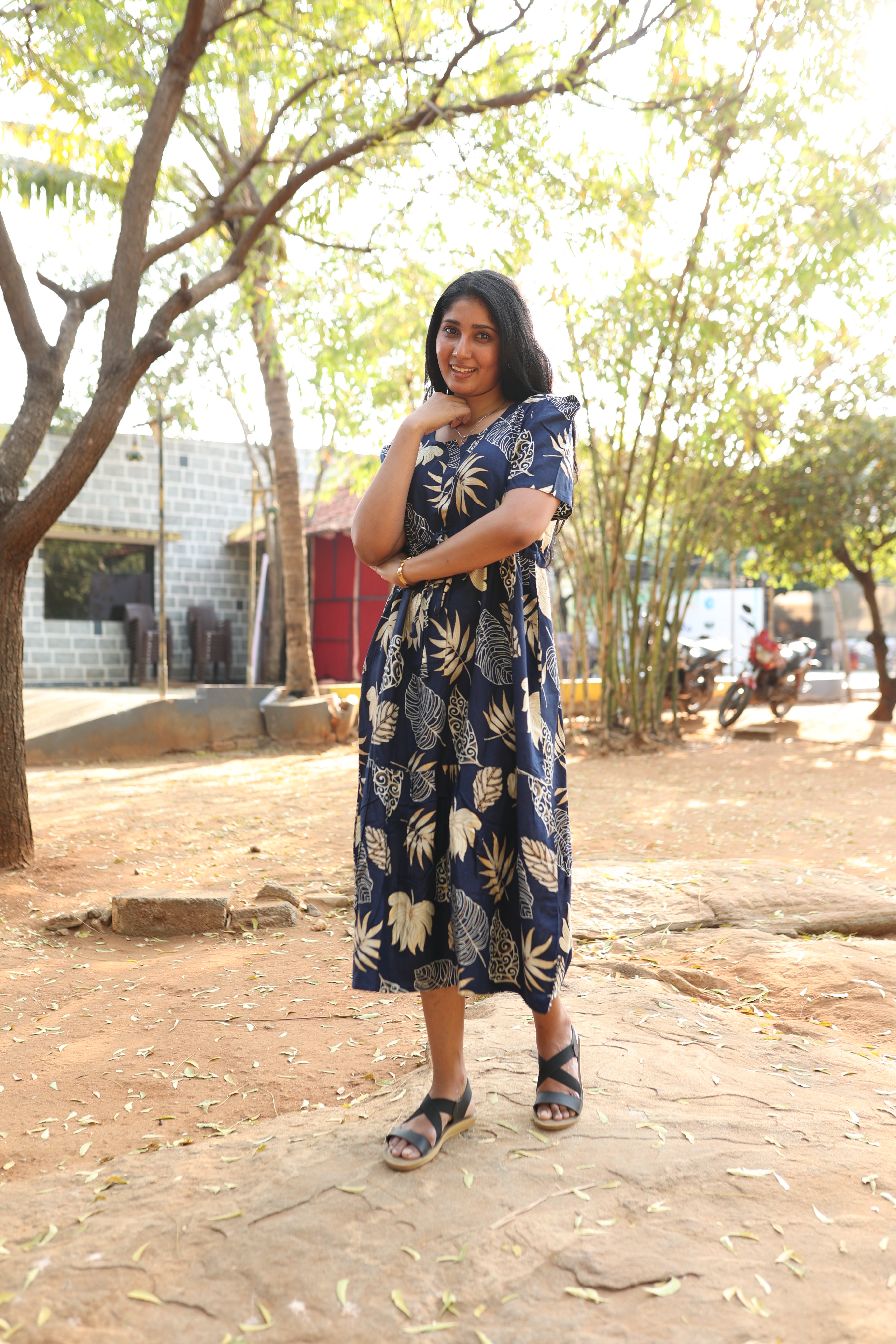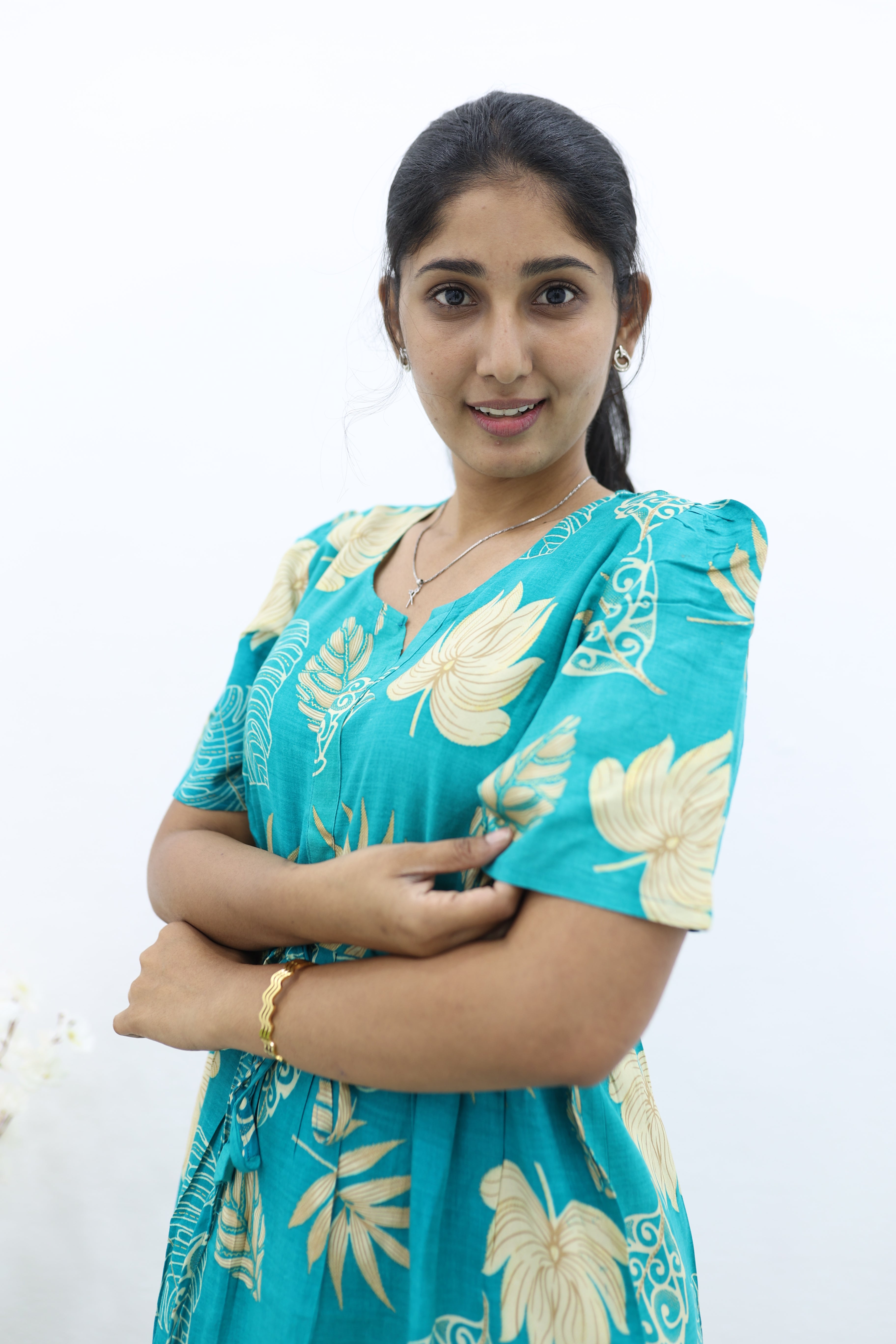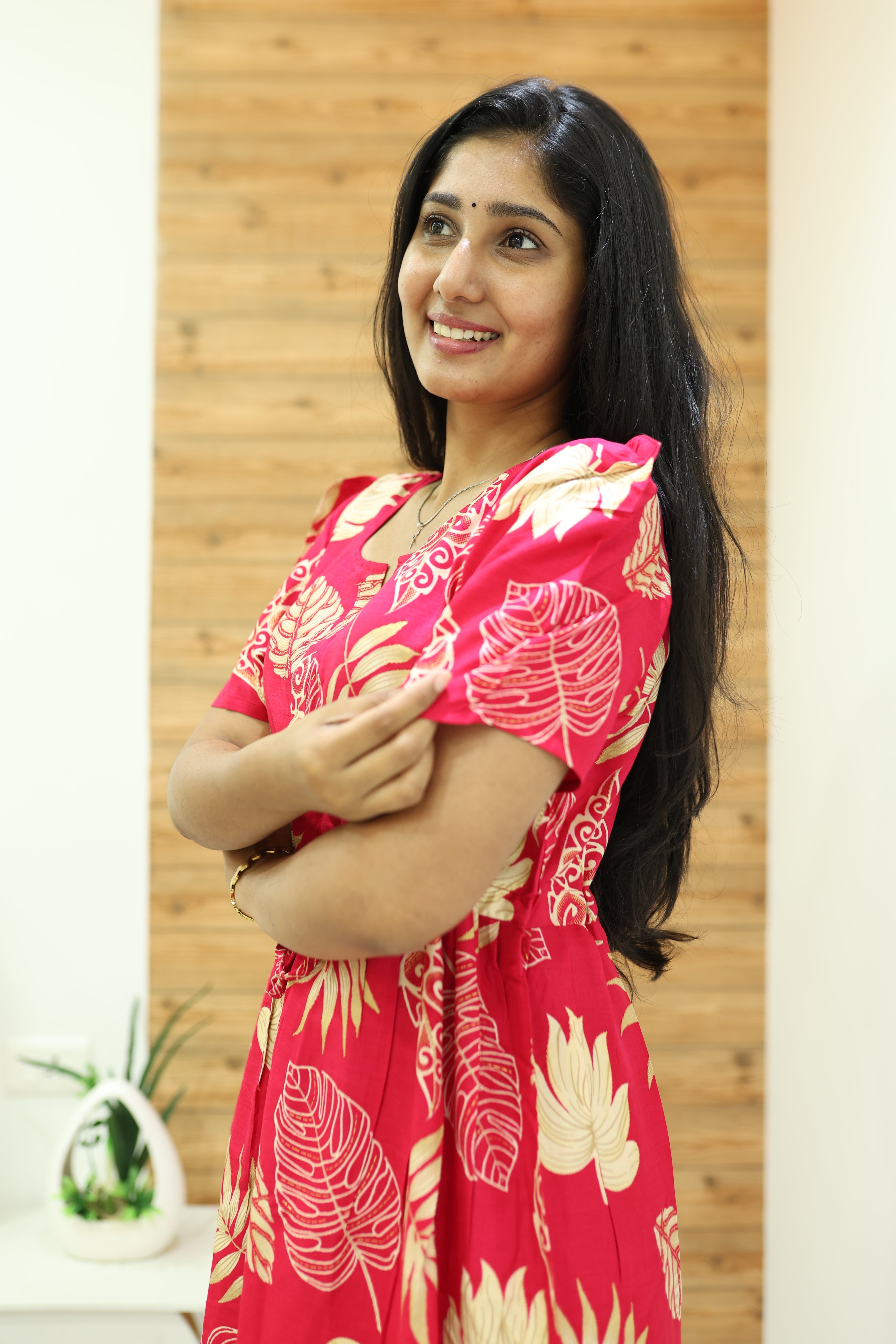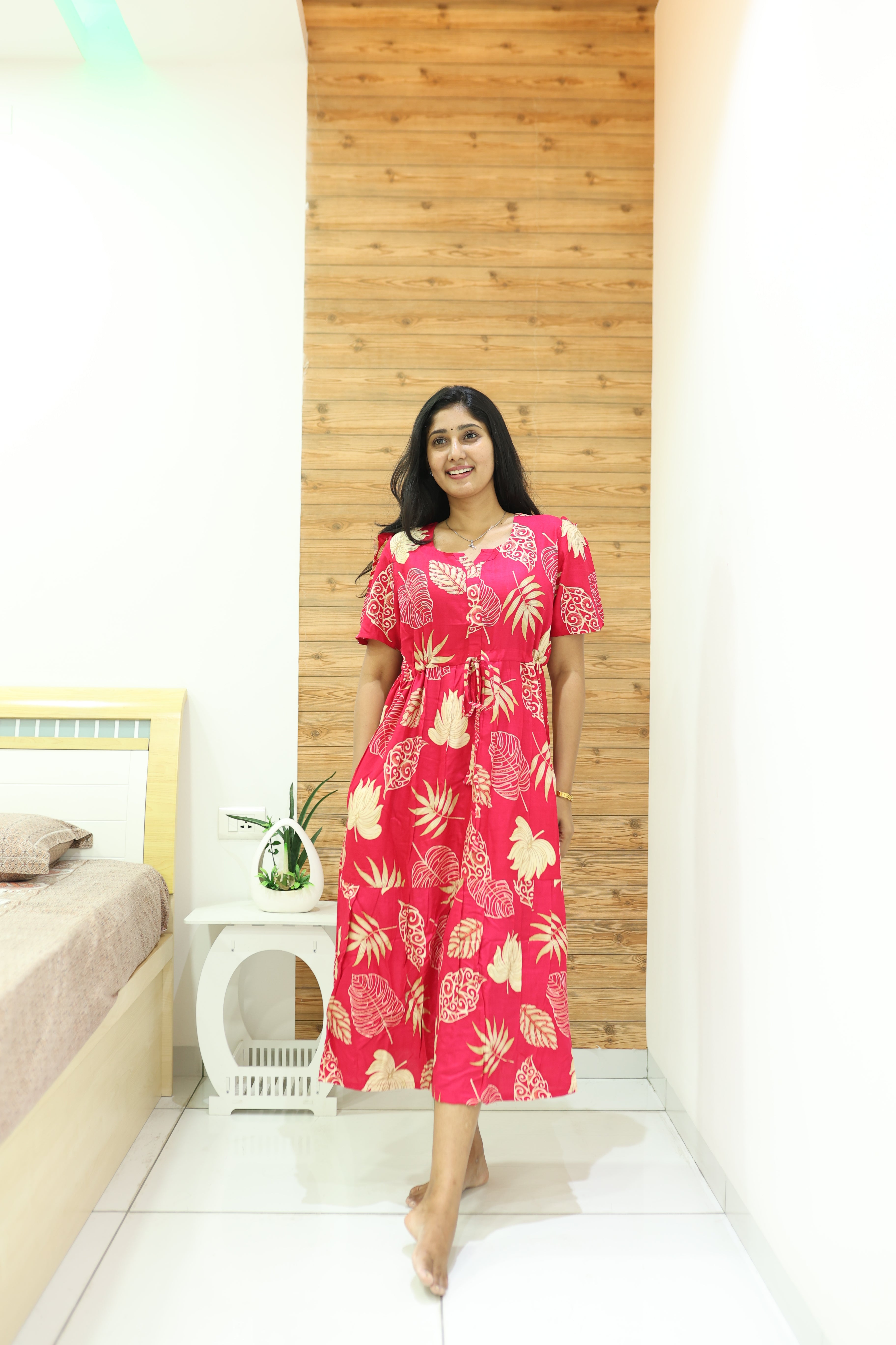 Upgrade your nightwear collection with this beautifully designed rayon nighty, blending style, comfort, and convenience. Featuring a vibrant foil print, gathering frock design, and front adjustable rope, this piece is a perfect mix of elegance and ease.