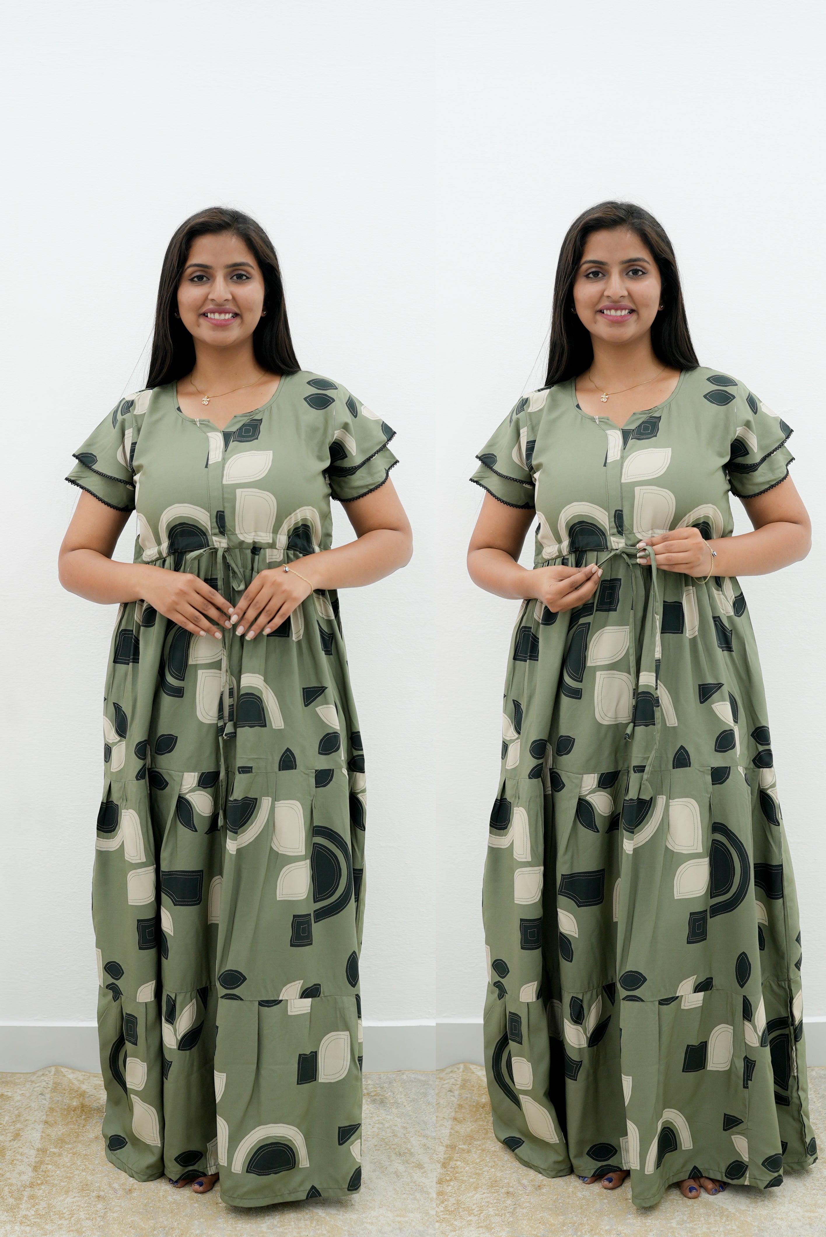 The Front adjustable gathering style rope allows a customized and flattering fit, while the beautiful flared frock silhouette adds a graceful flow and premium appeal. Enhanced with double-layer sleeves, this design blends comfort with contemporary fashion, making it a standout piece in our Trending Nightwear Collection.