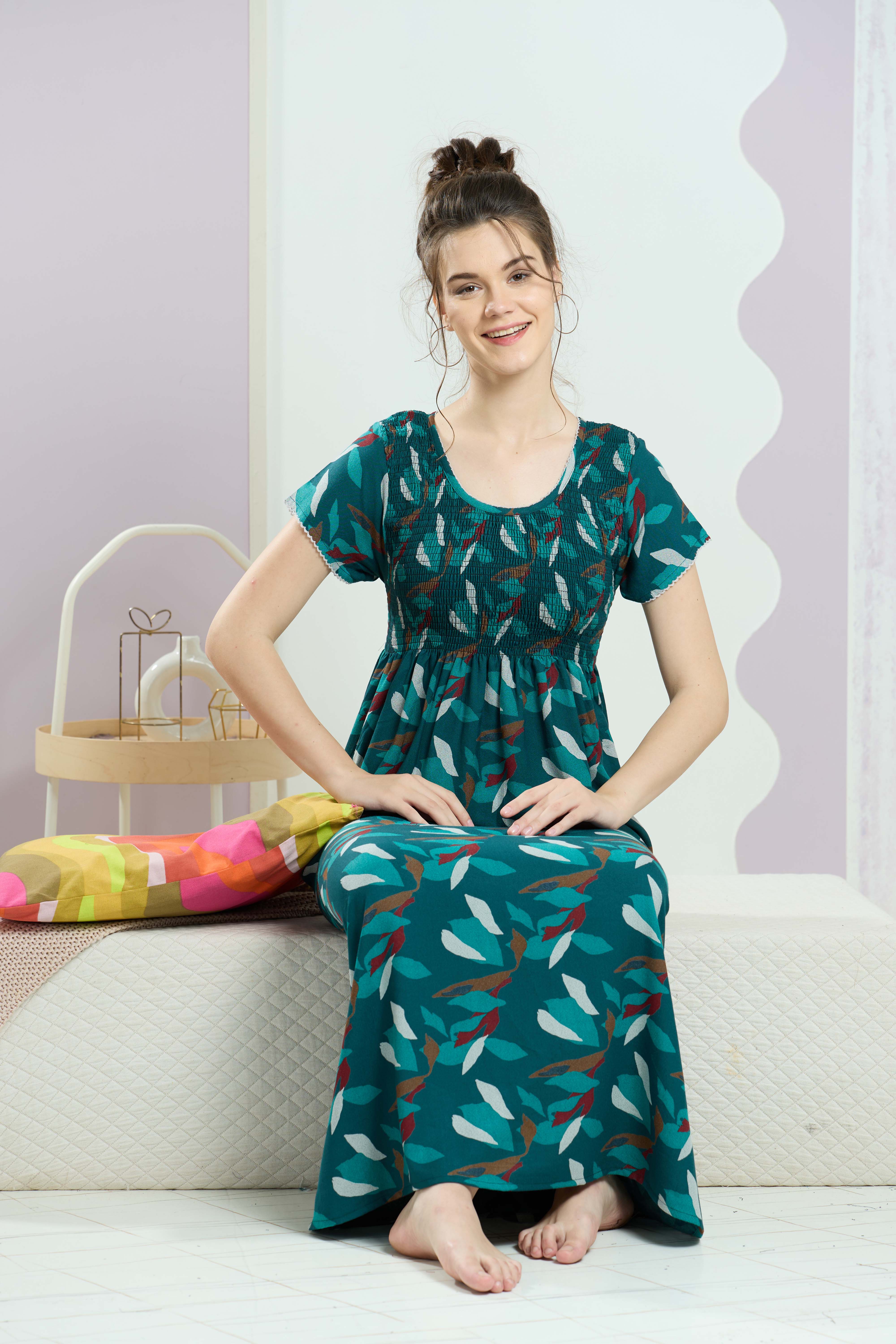 ALPINE Smocking Nighty | Beautiful Pleated Design | Side Pocket | Stylish Nighty for Trendy Women's | Your Perfect Nightwear Collection's (SAP)