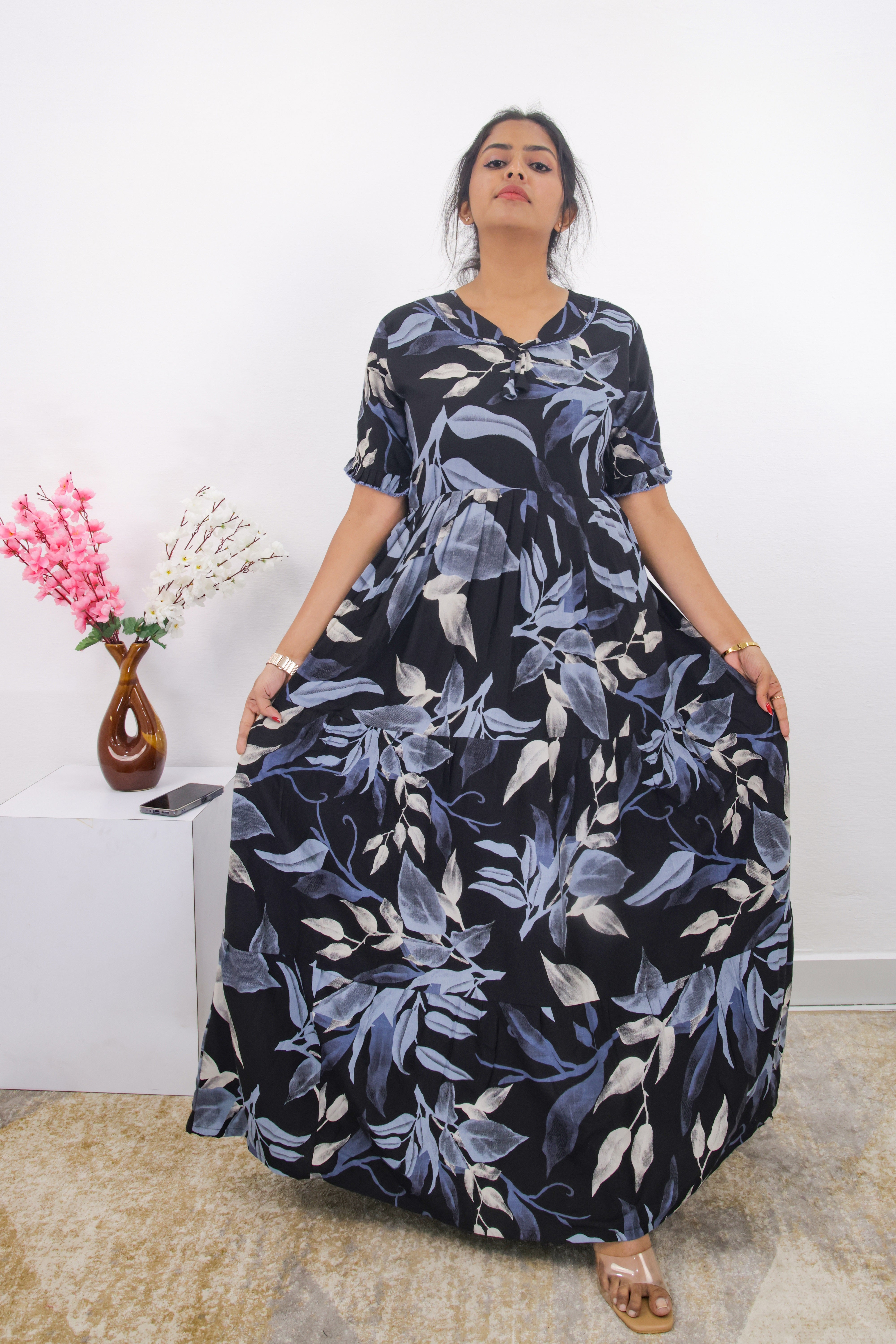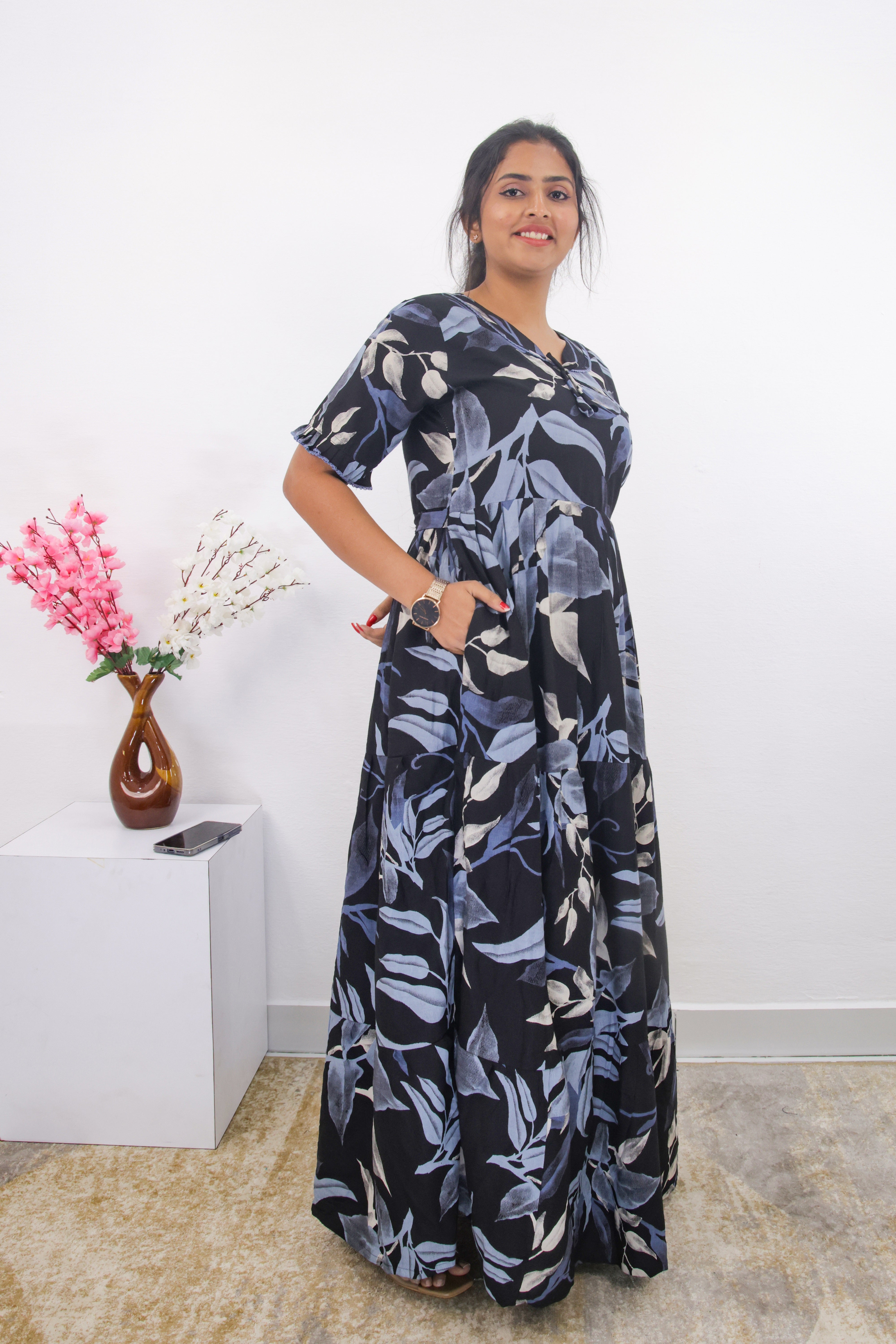 Essentially, this nighty combines a fashionable, multi-layered design with the comfort of soft rayon and practical features like a pocket. It seems like a good choice for someone looking for sleepwear that is both stylish and comfortable