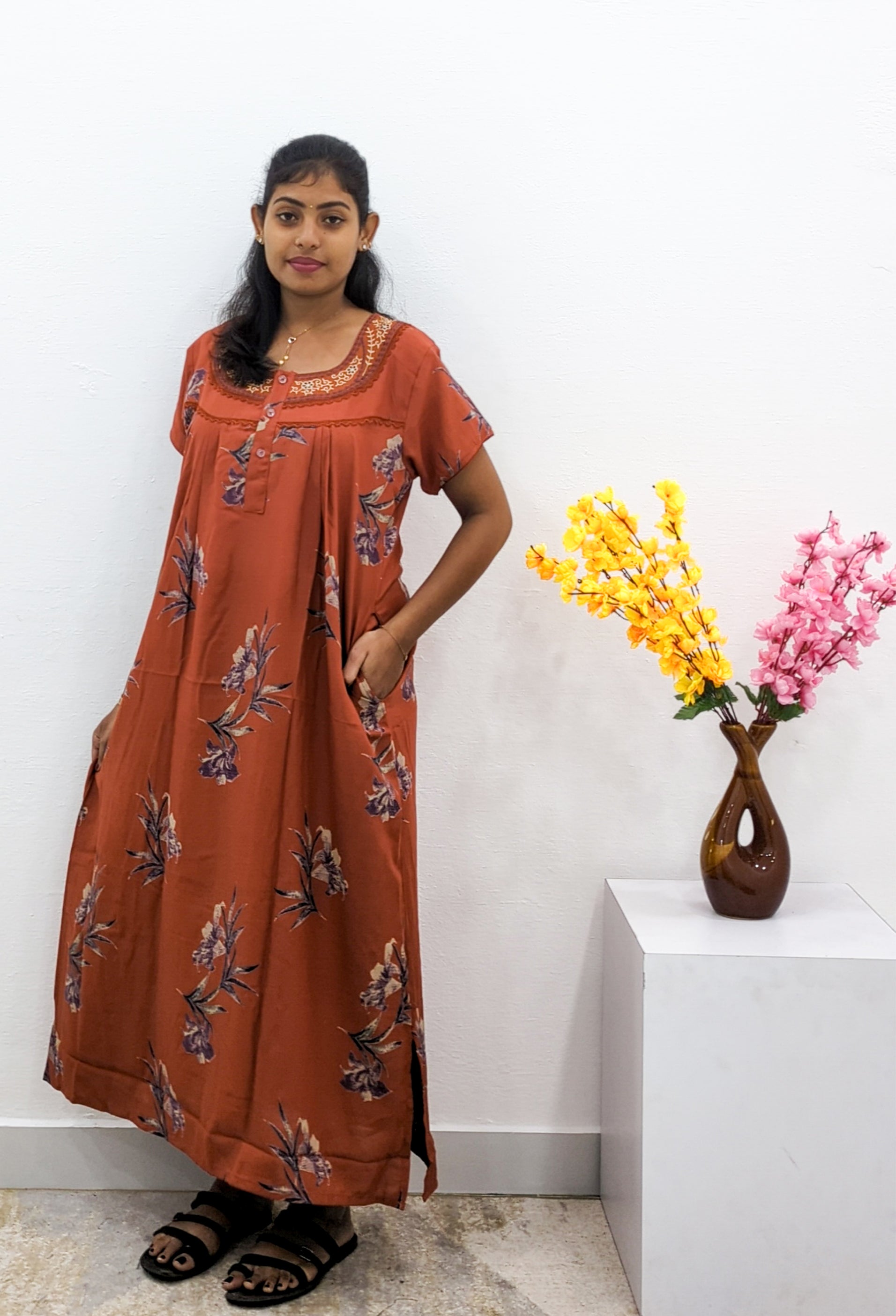 Neck Detail Premium Embroidery Work: Adds an elegant and stylish touch, elevating it above a simple nightdress.
