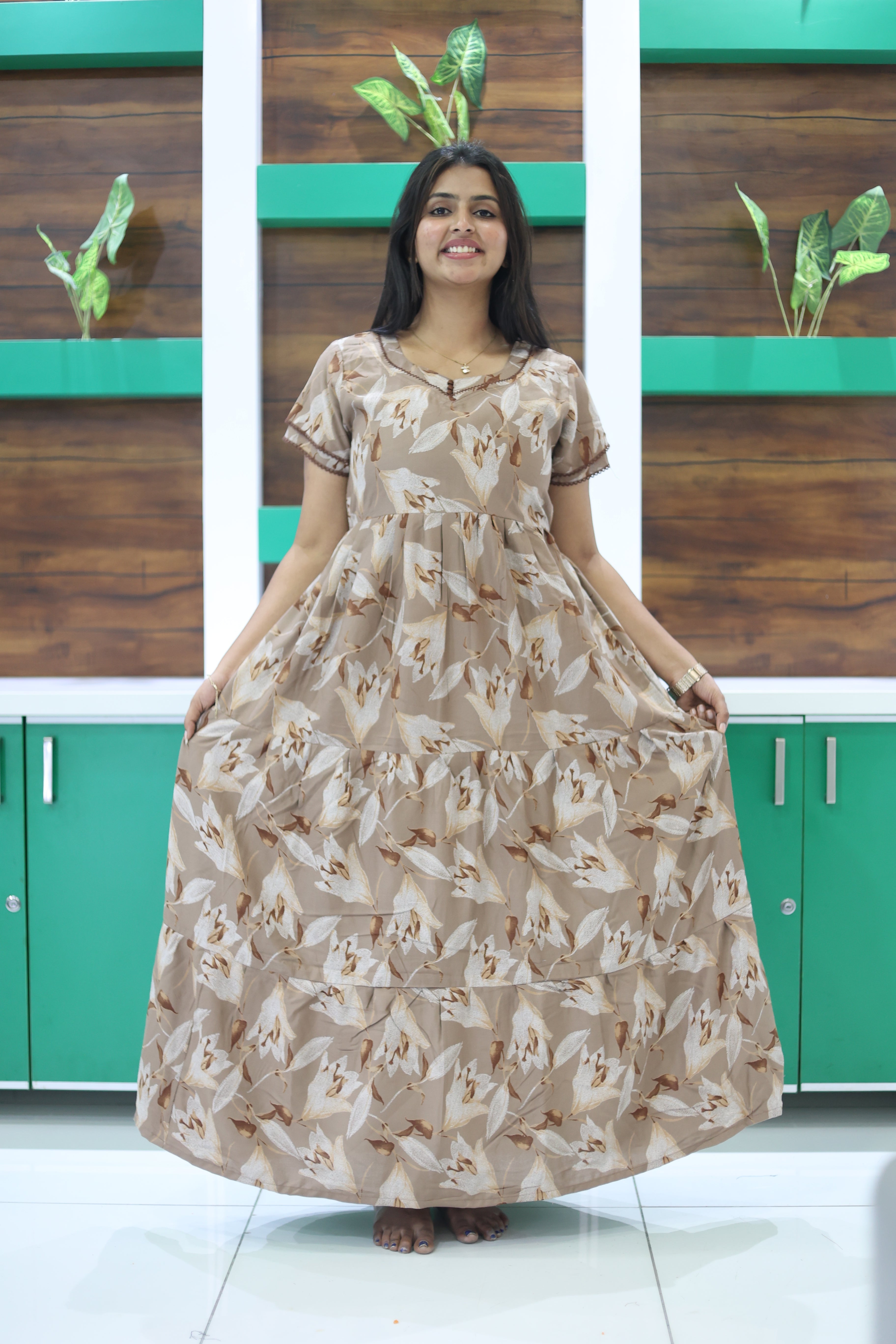 This beautiful full-length nightdress features a graceful 3-layer flared bottom that gives a rich and flowy look. The stylish double layer sleeves add a trendy touch, while the attractive fancy neckline with tie-up detail enhances the overall design.