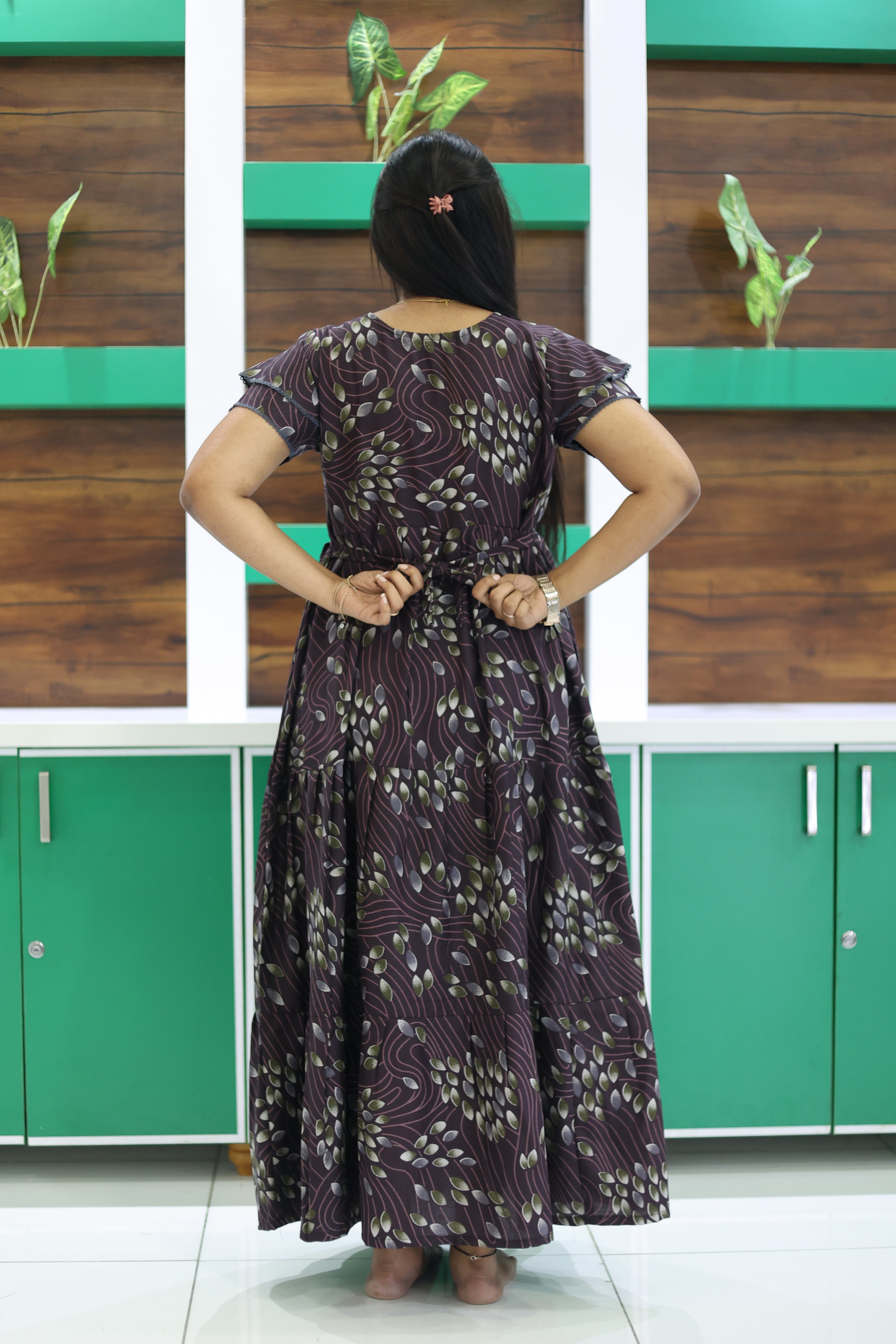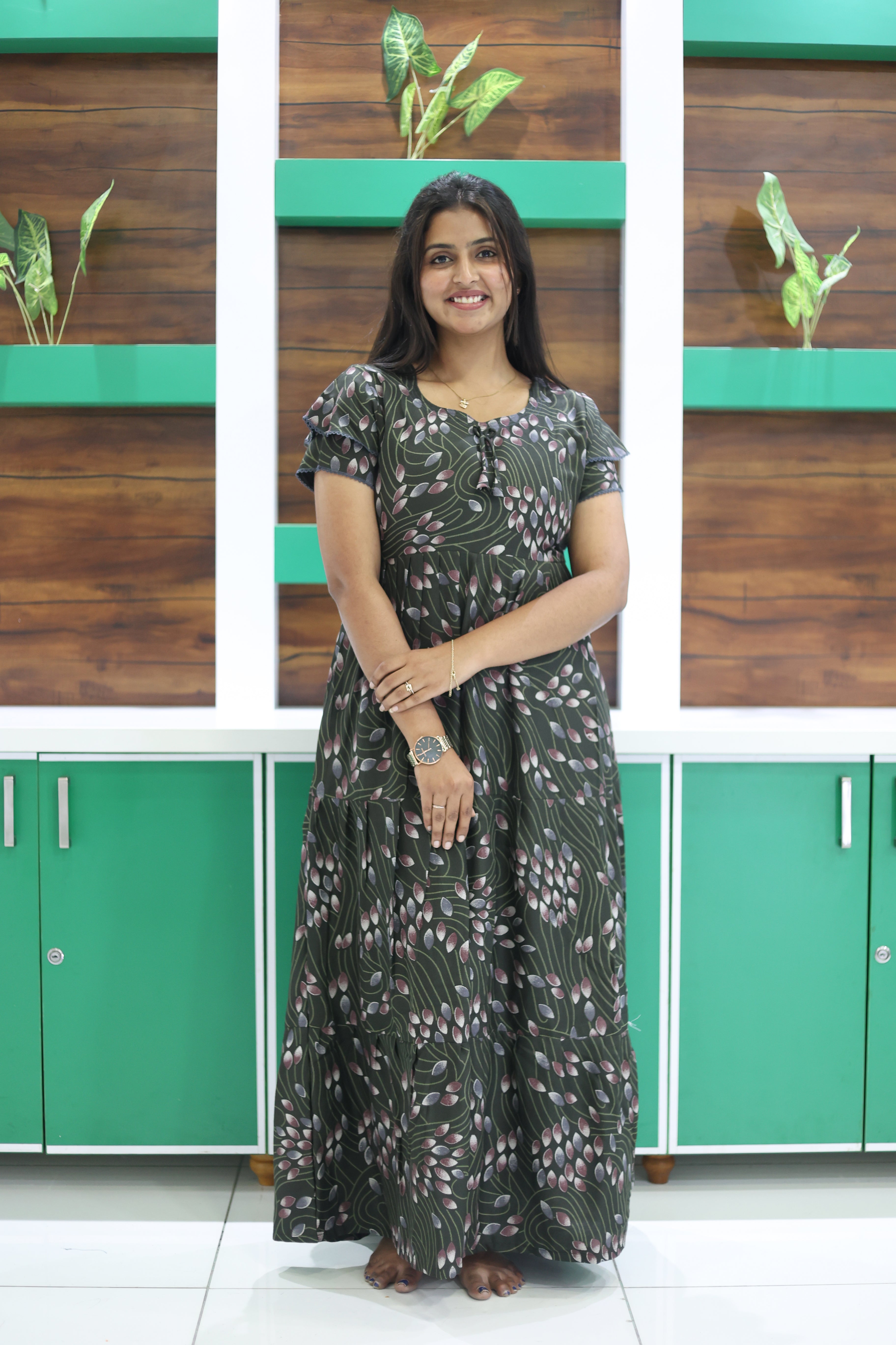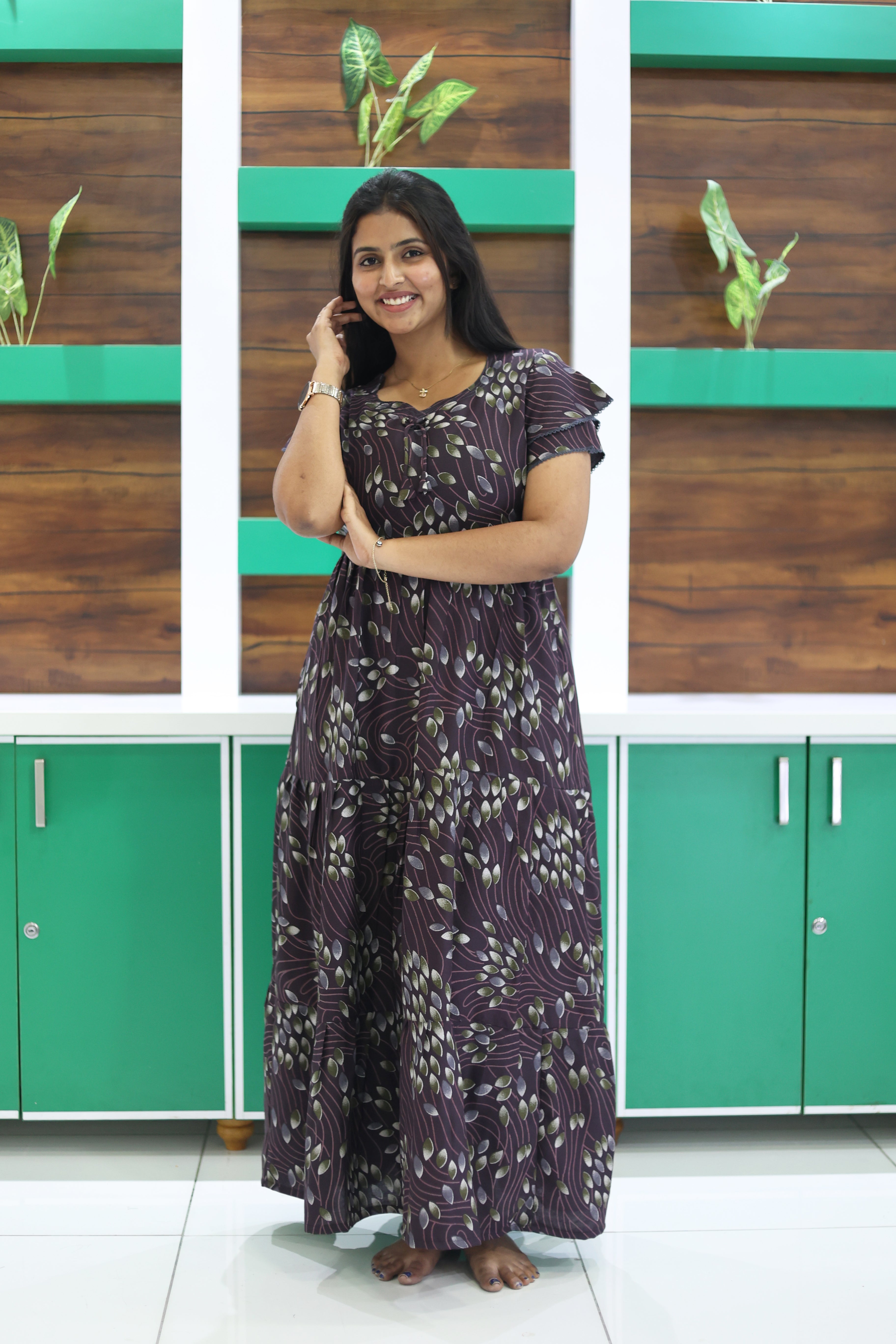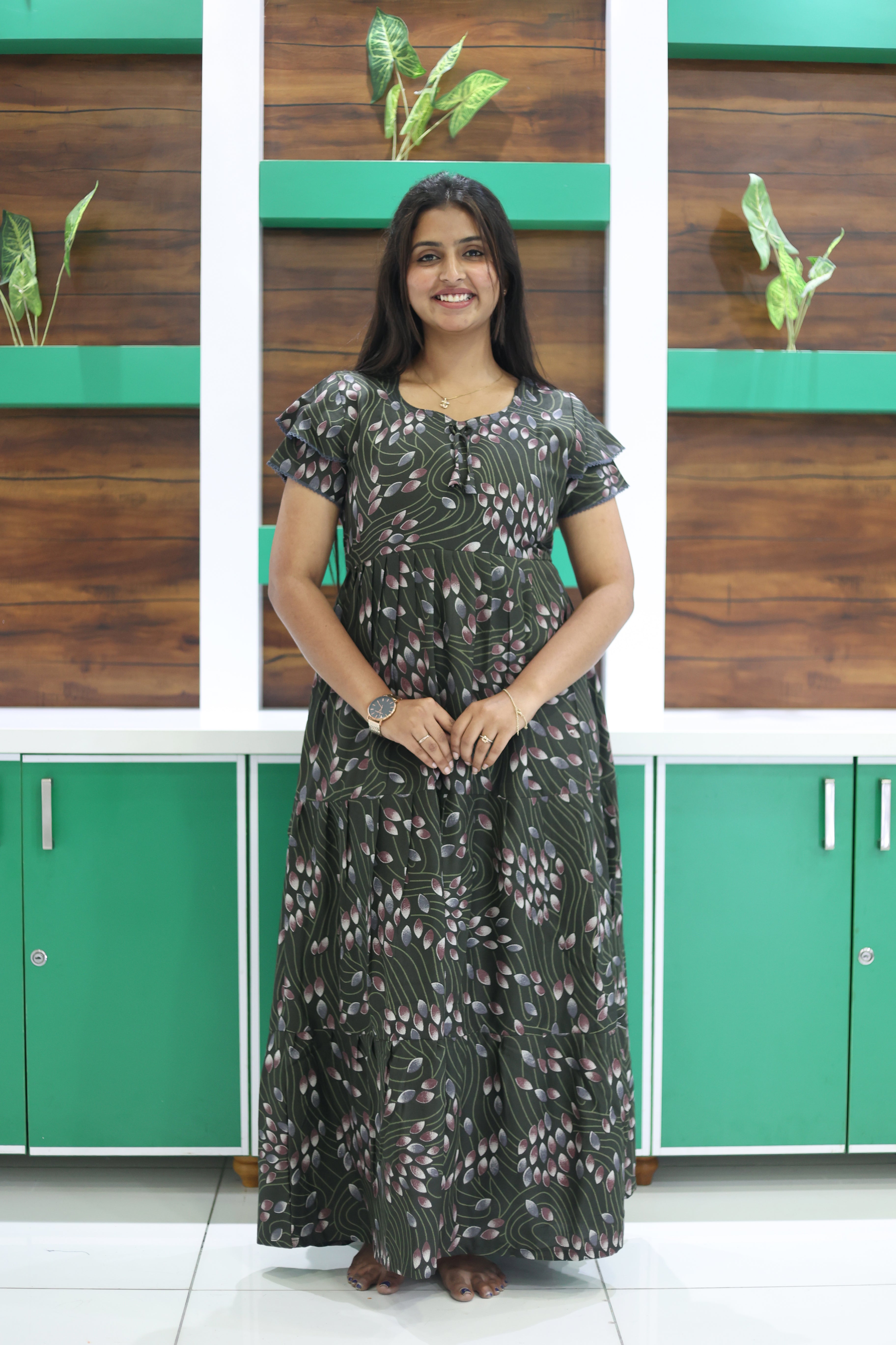 This beautiful full-length nightdress features a graceful 3-layer flared bottom that gives a rich and flowy look. The stylish double layer sleeves add a trendy touch, while the attractive fancy neckline with tie-up detail enhances the overall design.