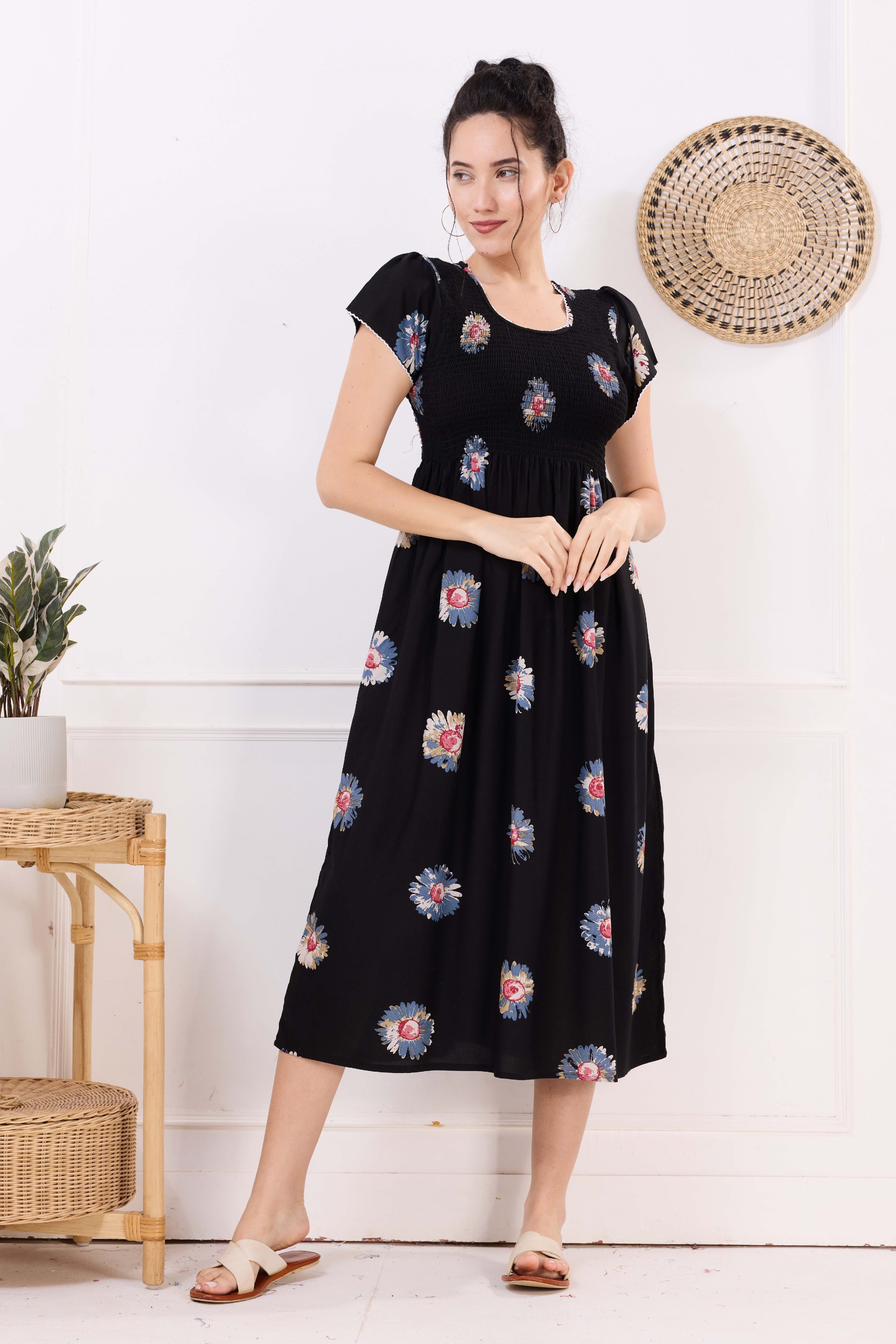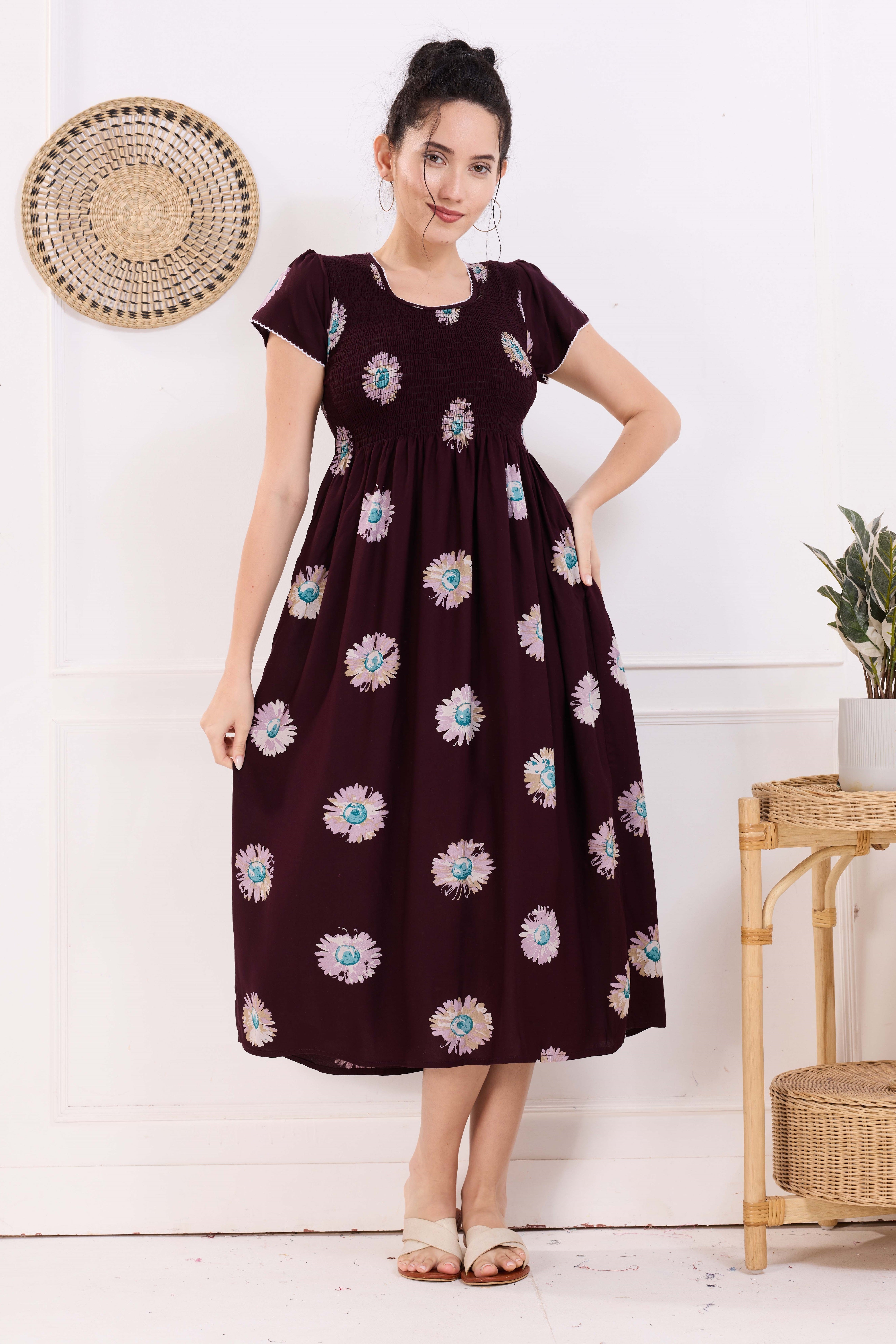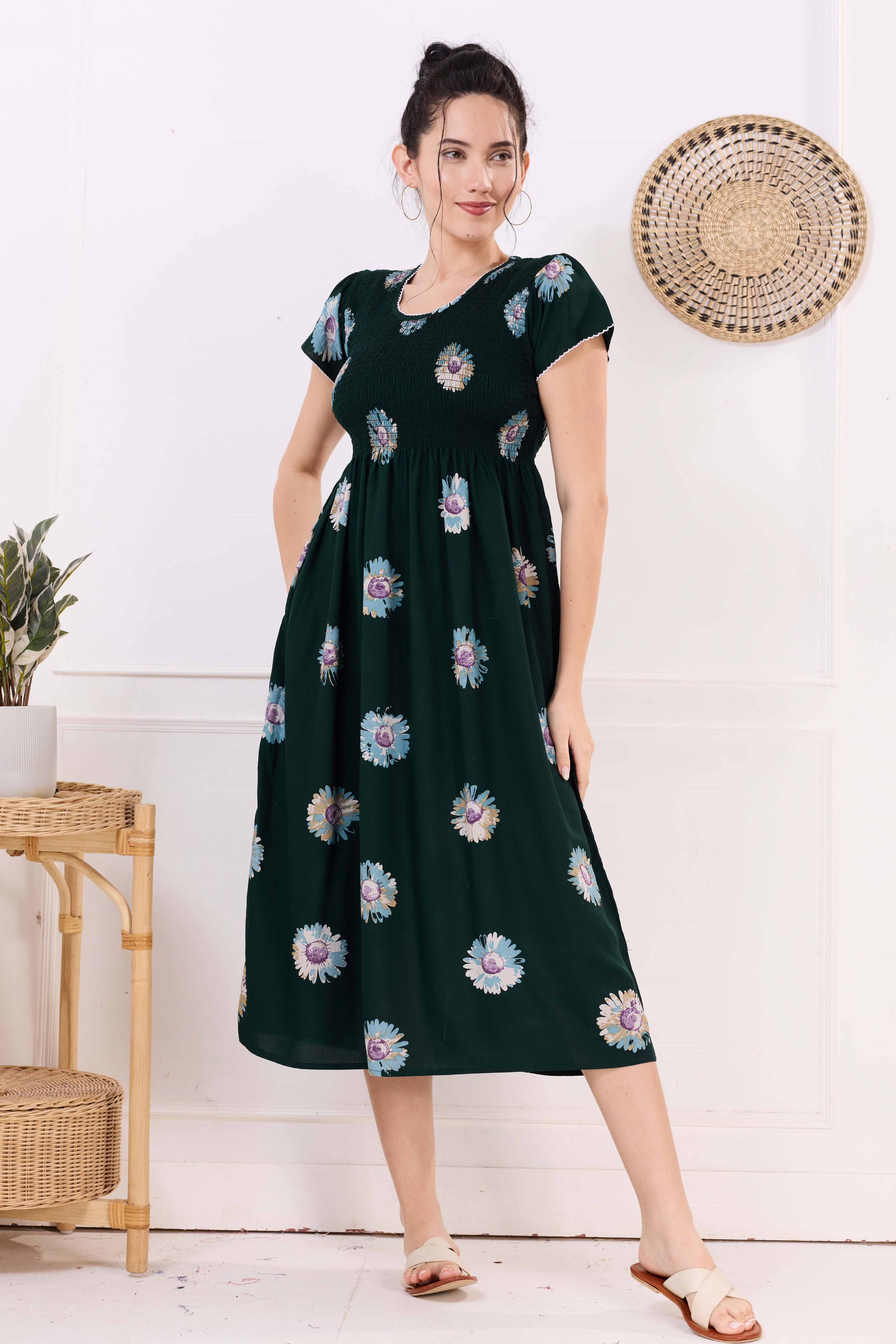 MANGAI Premium Rayon MAXI Frock Smocking Night Gown | Stretchable & Comfort Fit | Fancy Pleated Style with Side Pocket | Round Neck Nightwear for Stylish Women (SRM)