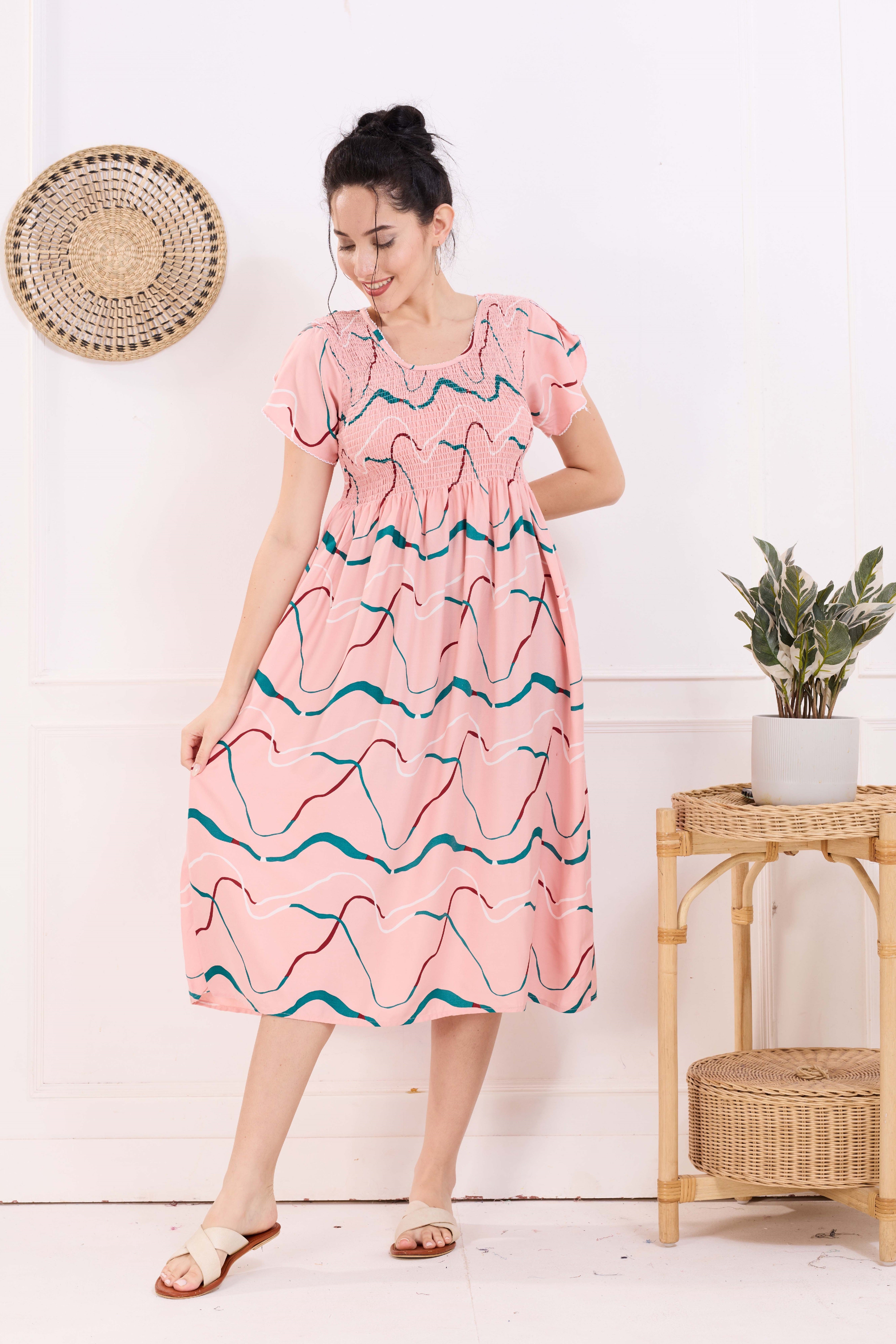 MANGAI Premium Rayon MAXI Frock Smocking Night Gown | Stretchable & Comfort Fit | Fancy Pleated Style with Side Pocket | Round Neck Nightwear for Stylish Women (SRM)