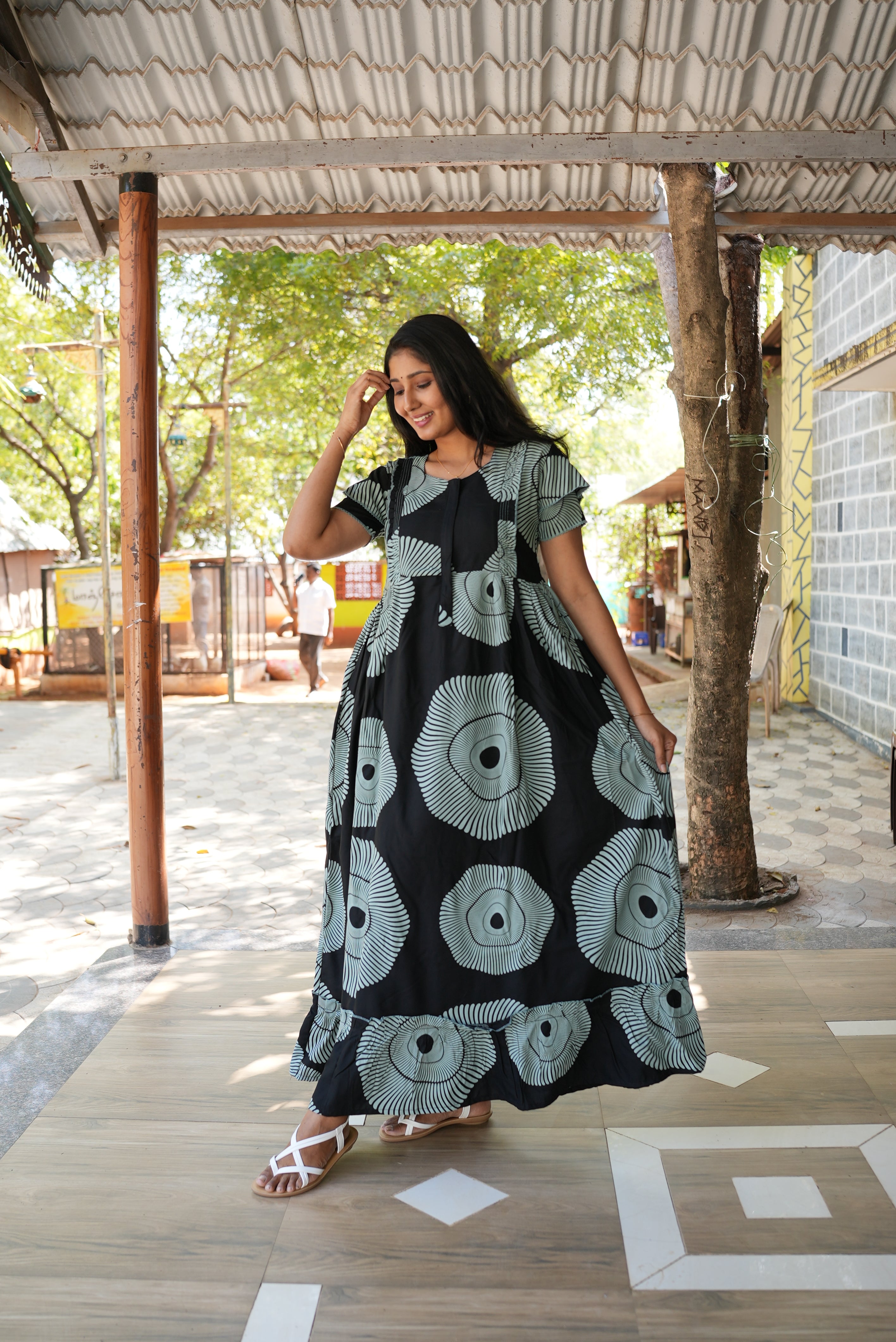 MANGAI Rayon Frock Nighties | Front Open Lengthy Zipper Comforts Feeding | Fancy Double Layered Sleeve's | Post & Pre Pregnancy's and Casual Wear | Side Pocket |Versatile Rayon Frock Night Gown's for Stylish Women's (RFF)
