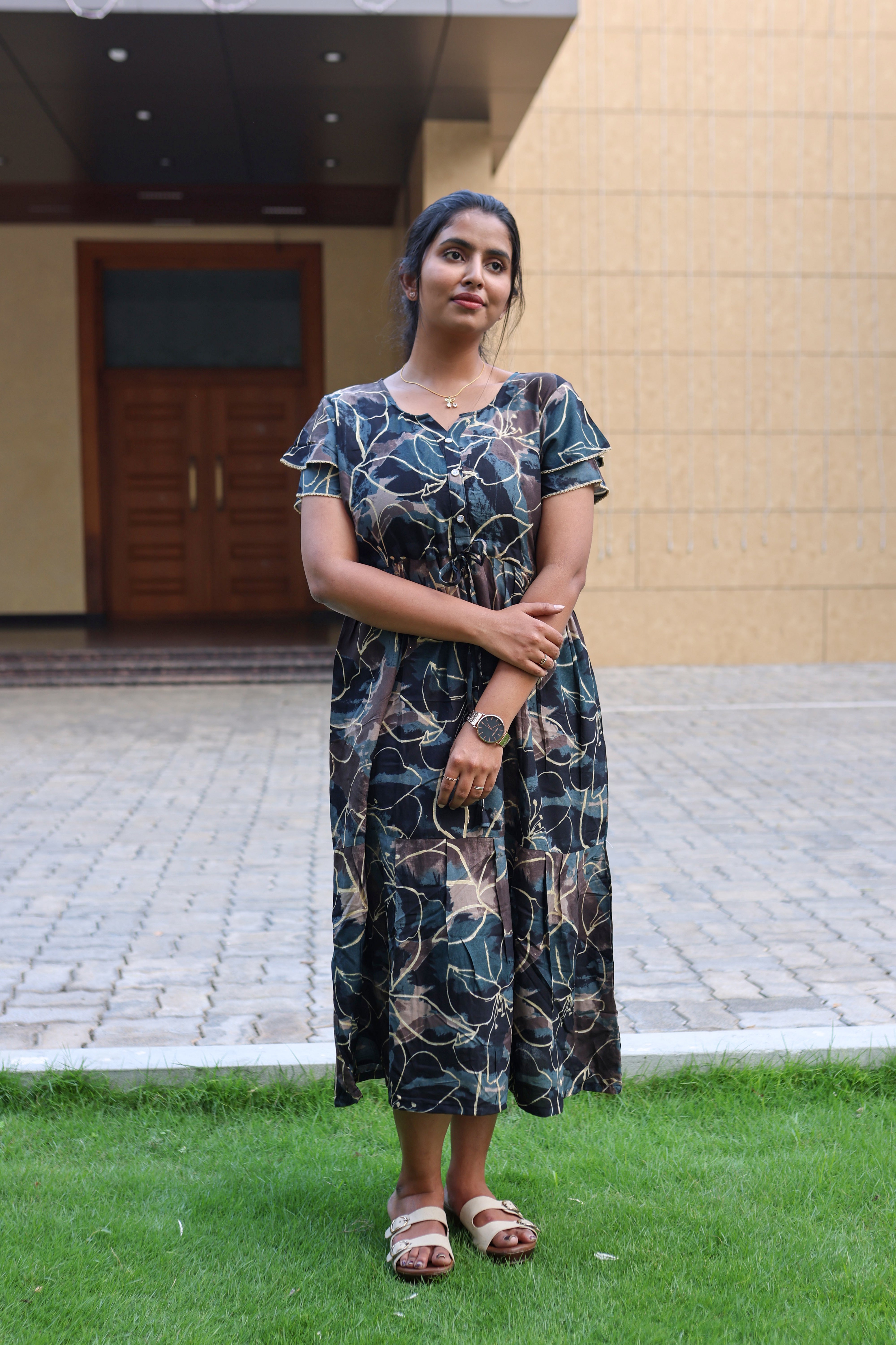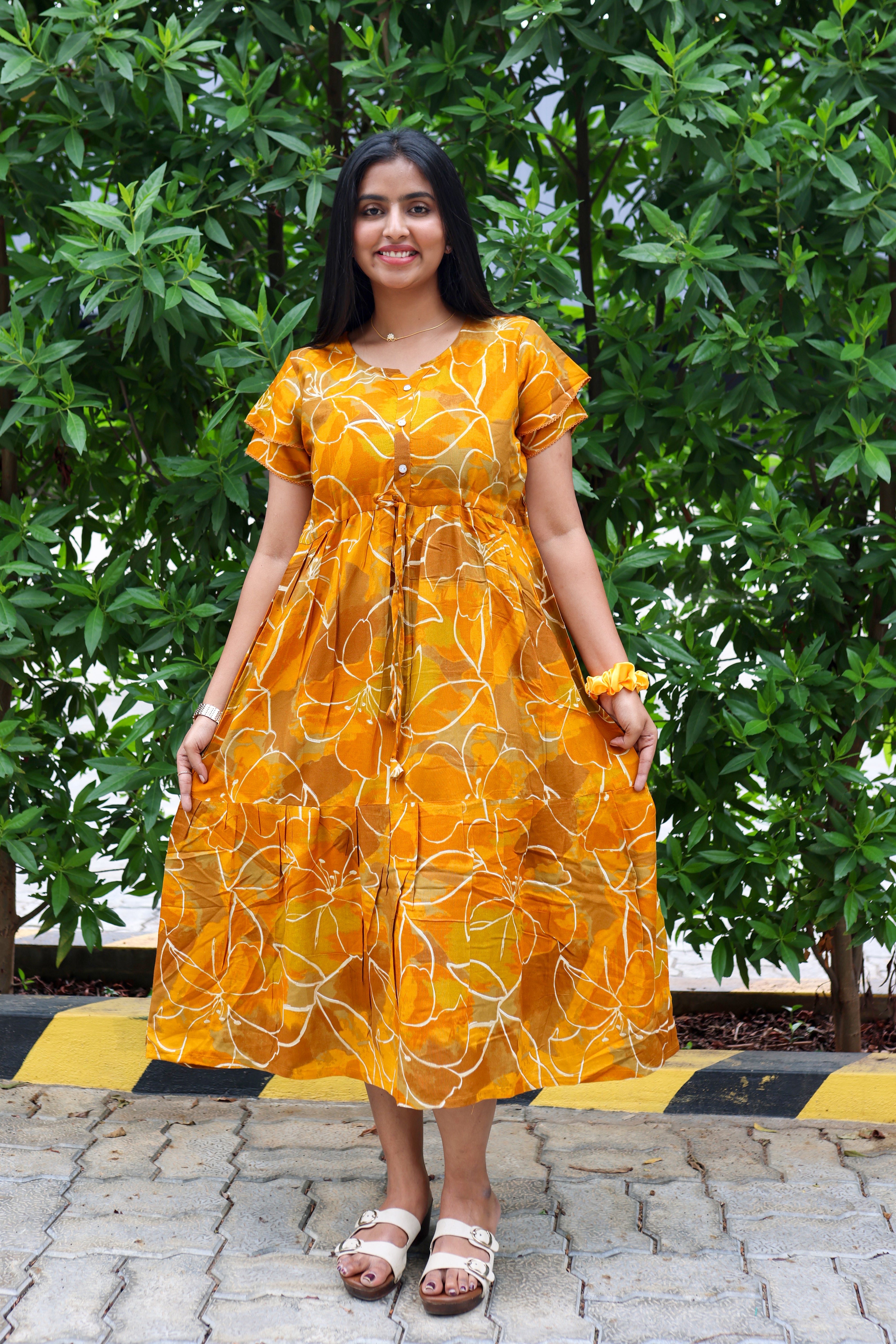 Rayon Colourful Foil Printing Gathering Frock Model Nighties | Side Pocket and Gathering Front Rope | Fancy Sleeve & Maxi Frock Nightwear for Stylish Women's (FGF)
